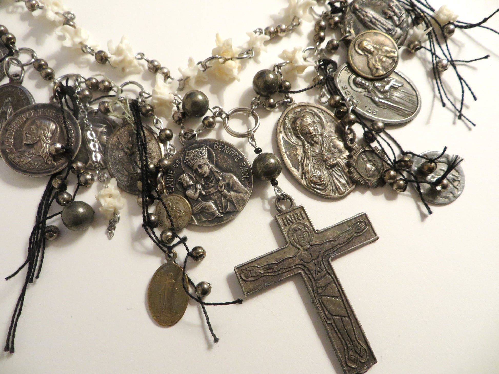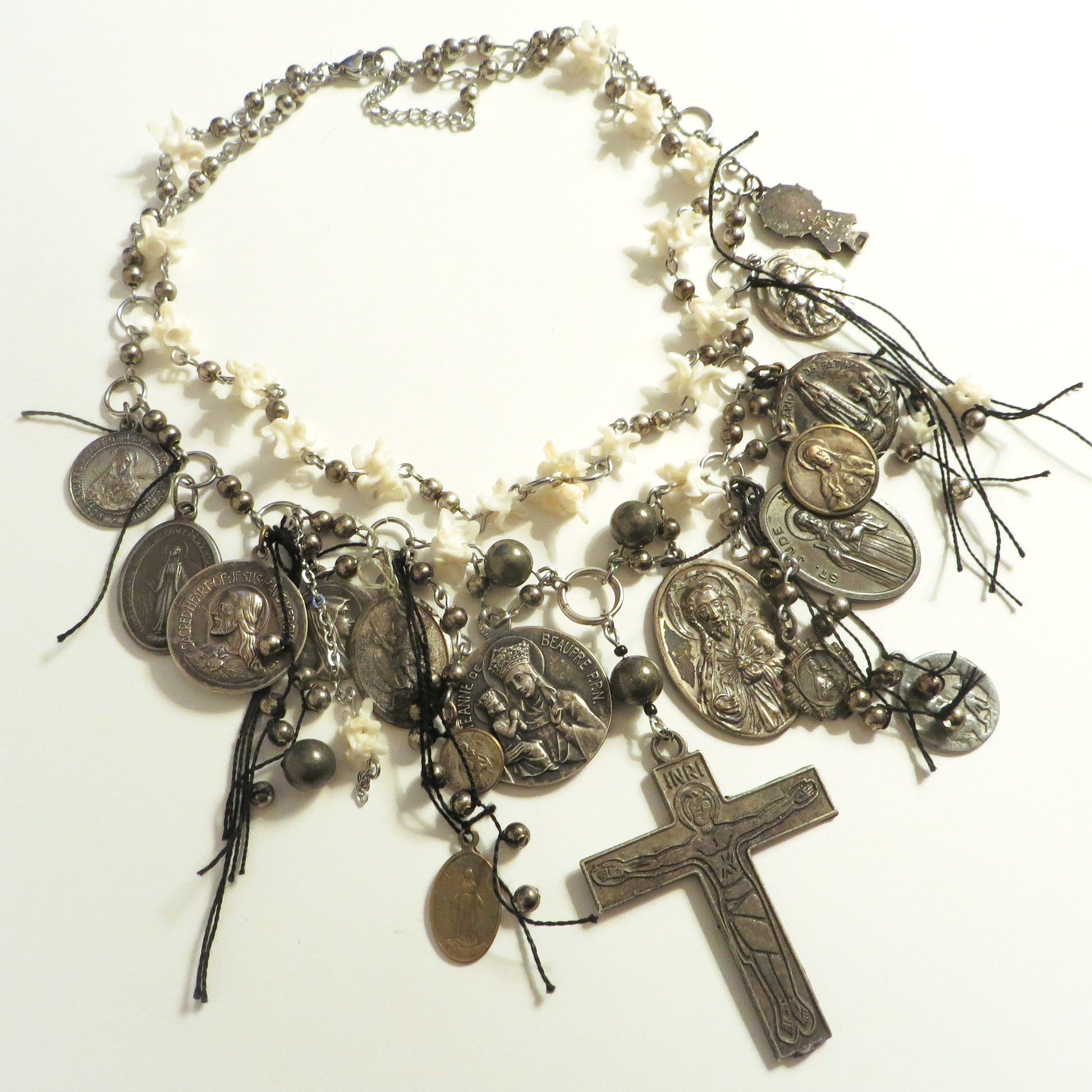 ✧ A recurrent design, the Metal Icons choker features many vintage religious medals, real snake vertebrae bones, metal and pyrite crystal beads, and stainless steel wire. This particular iteration of the Metal Icons Choker is made with vintage charms that show more exceptional signs of age, with natural patinas showing the true vintage quality. To match these aged, darker charms, darker metal beads and black thread were also used.