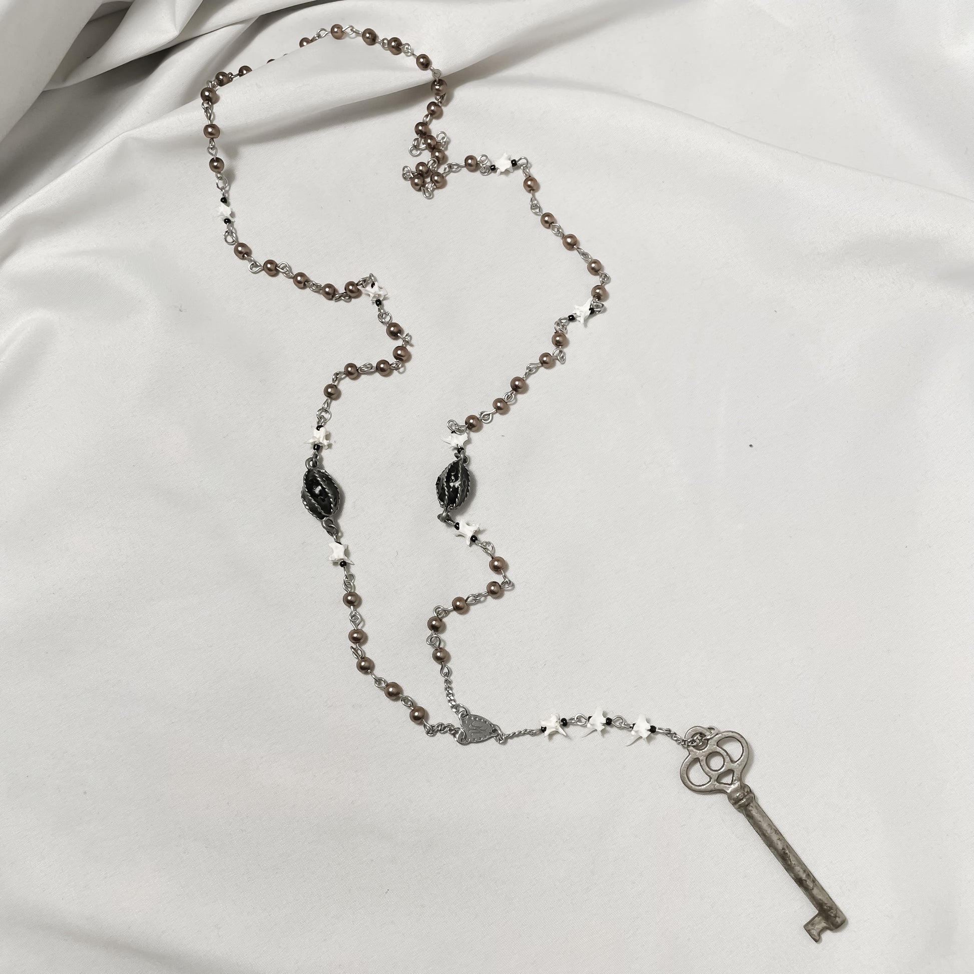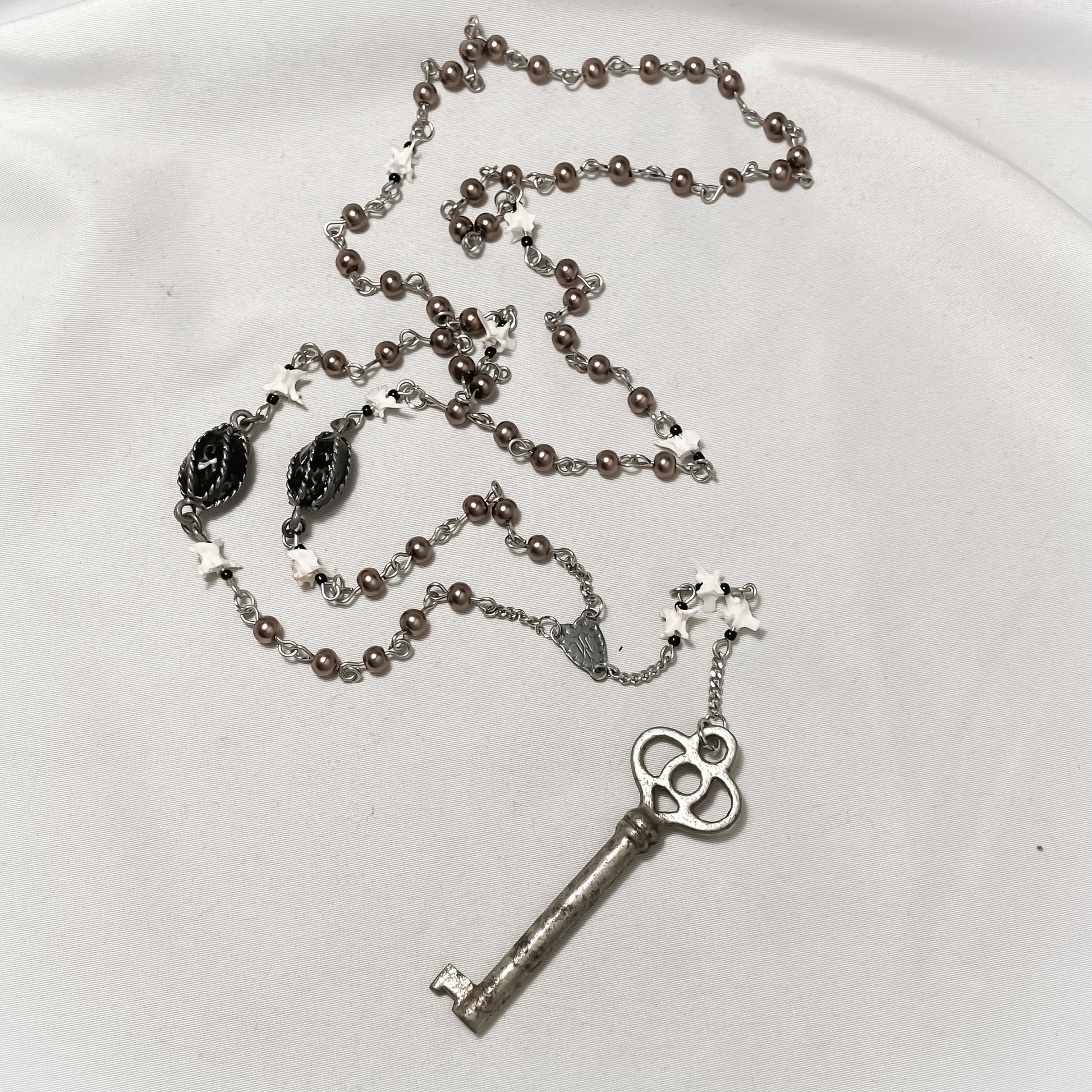✧ Long rosary style necklace with brown beads, black accent beads, real rattlesnake vertebrae bones, and antique skeleton key pendant on stainless steel wire.