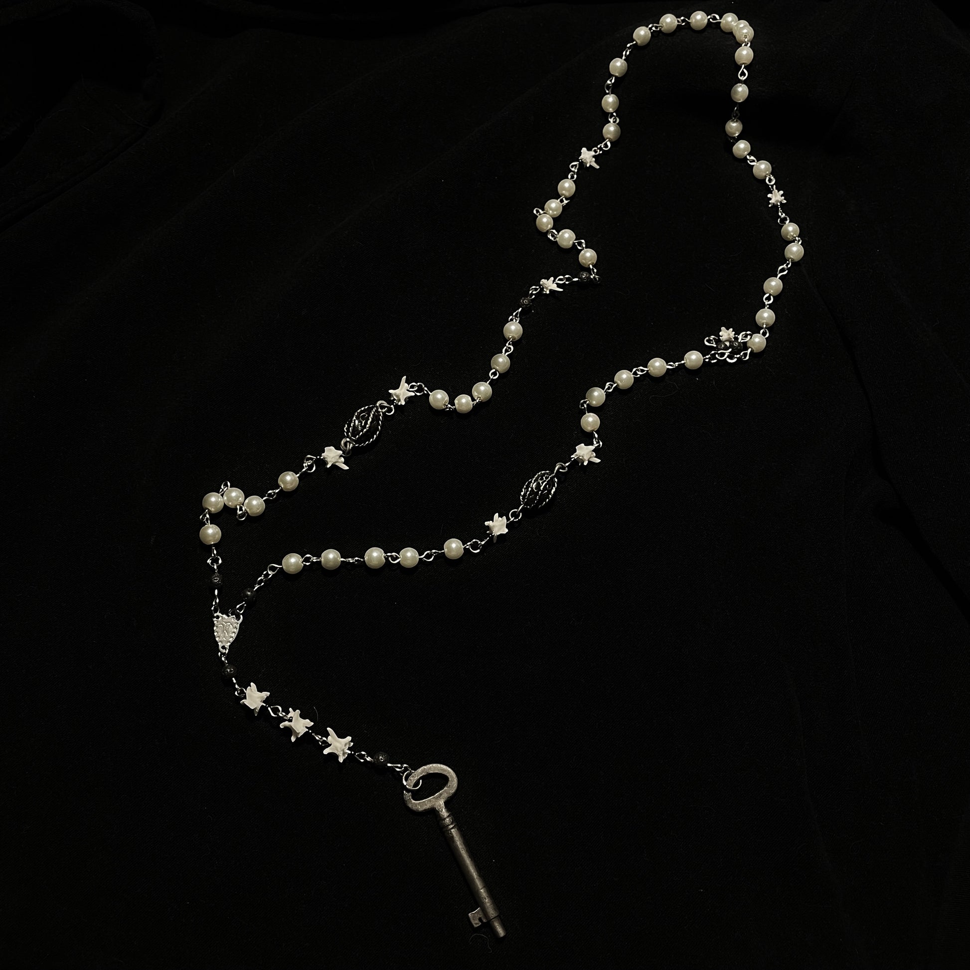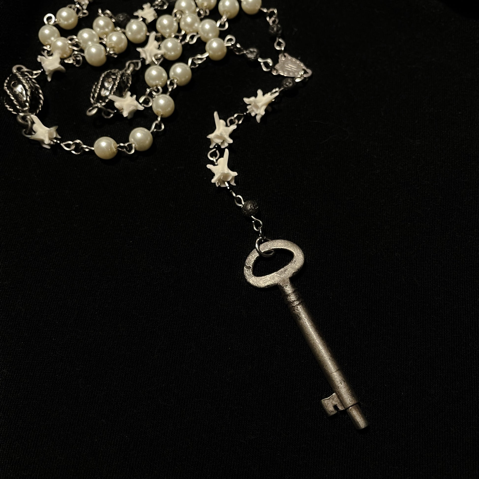 Antique Key & Bone rosary style necklace—pearl