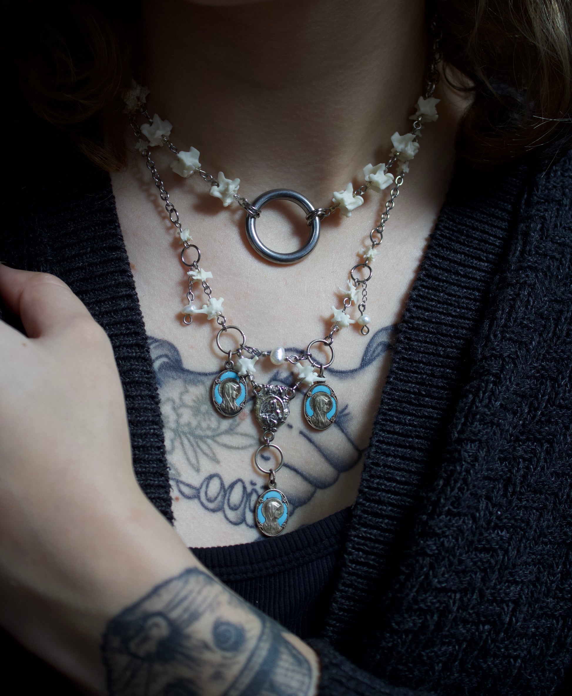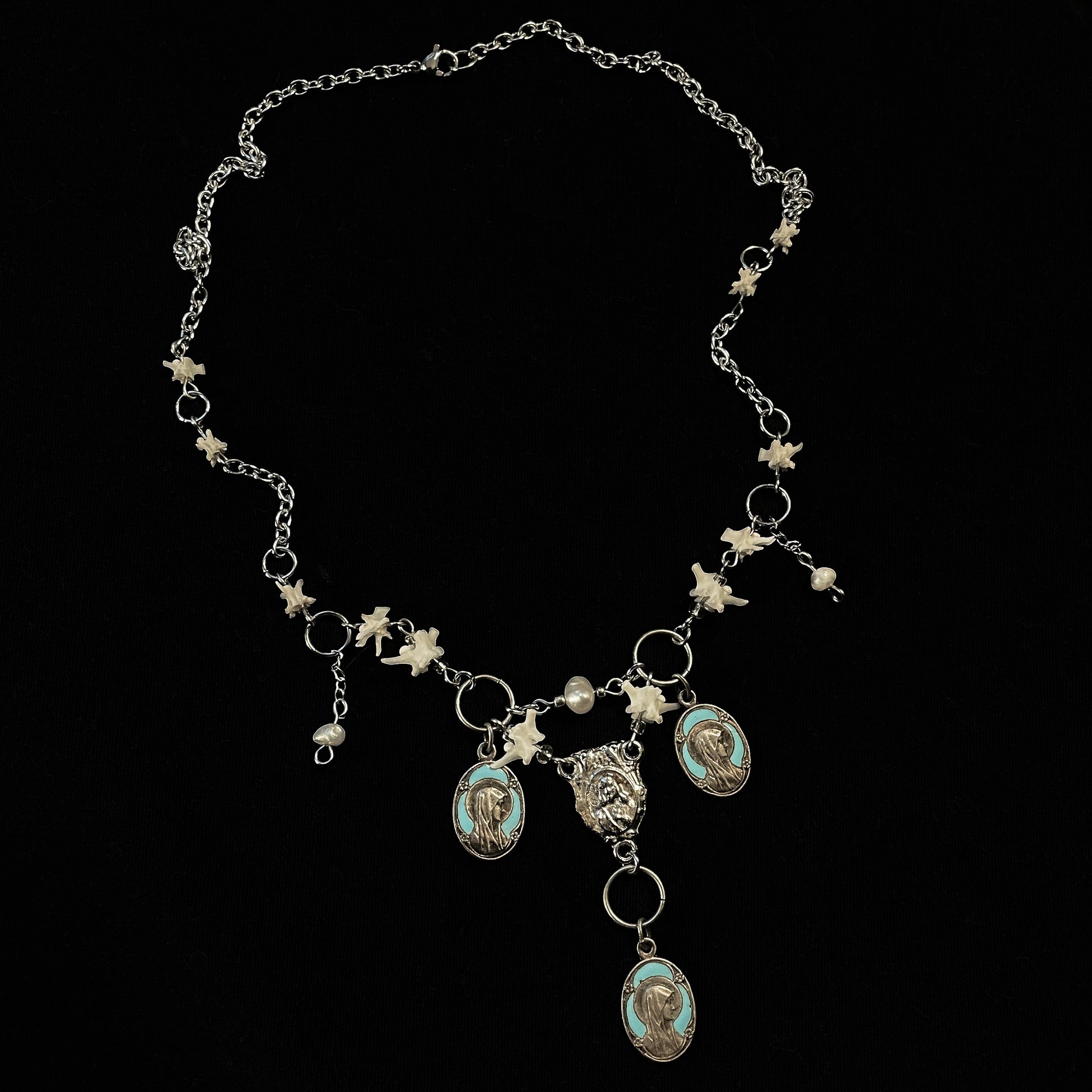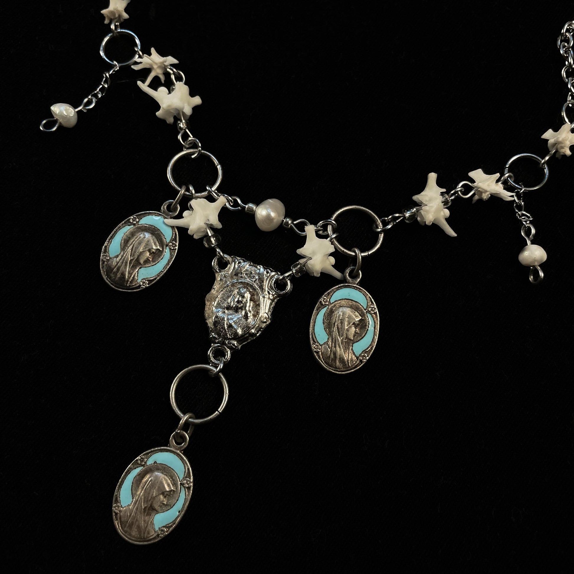 ✧ Necklace with real snake vertebrae bones, real freshwater pearls, vintage religious pendants and centerpiece, and stainless steel hardware.