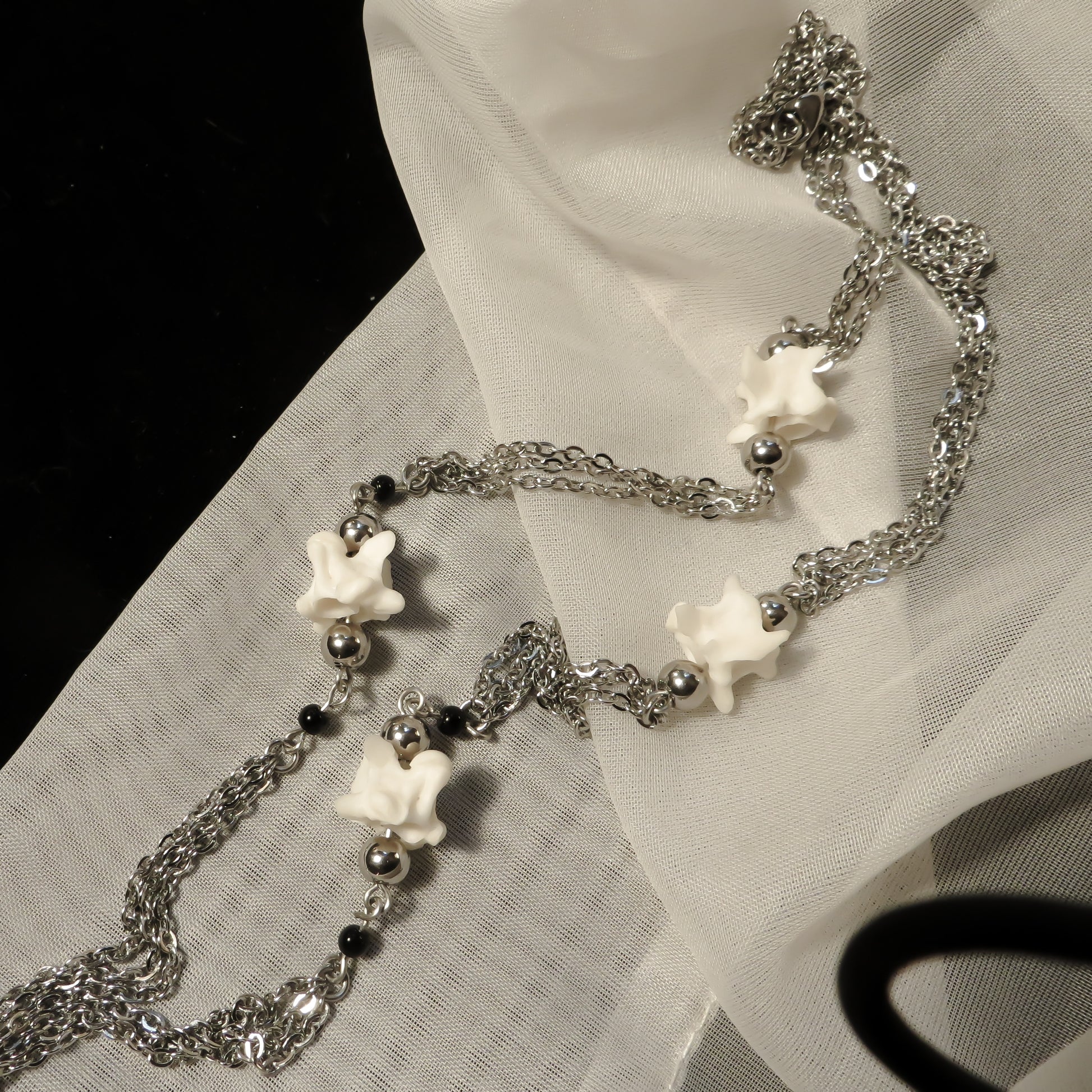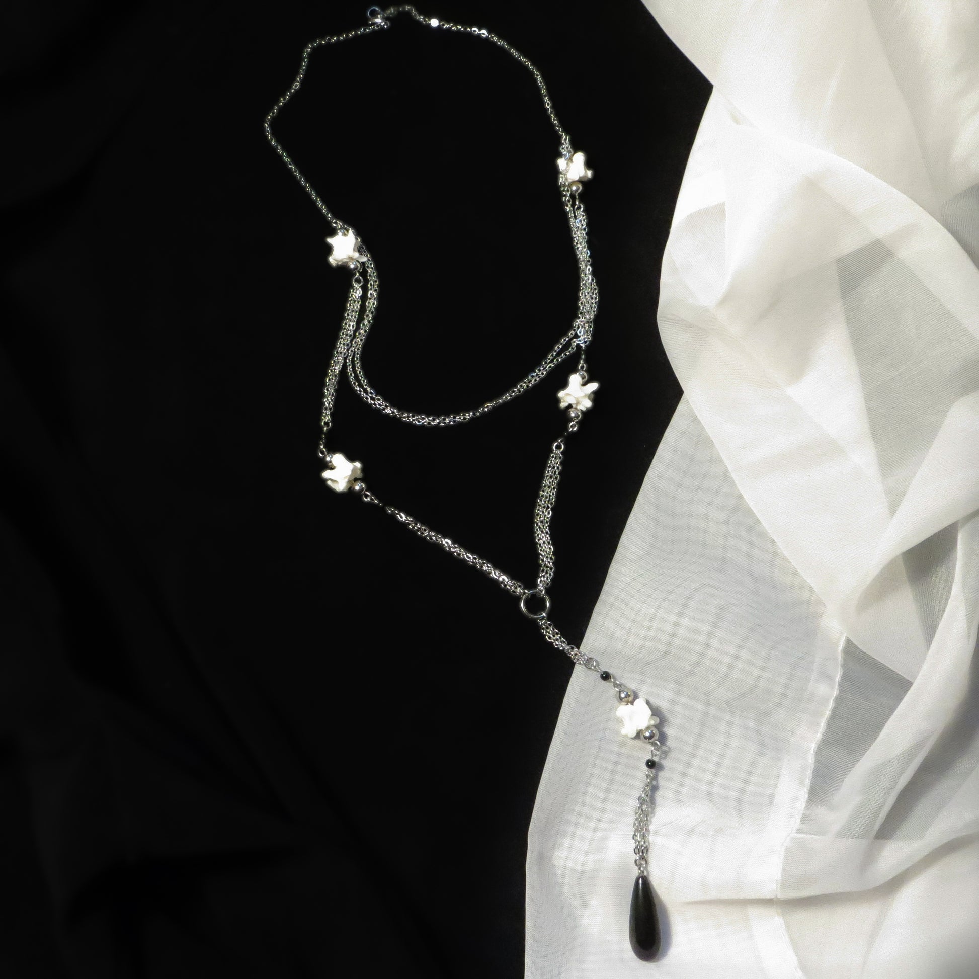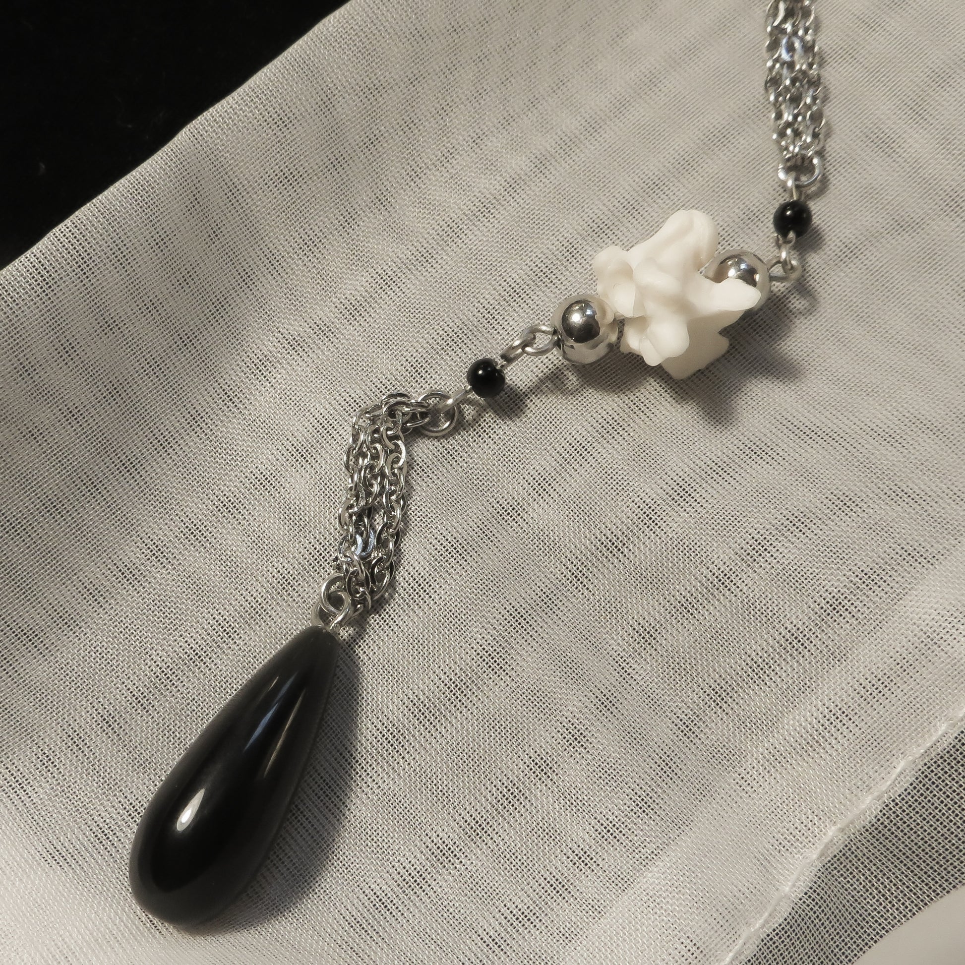 ⟡ Lariat style necklace made of real snake bones, obsidian stone pendant, and multiple overlapping stainless steel chains. Can either be worn with multiple chains in front of the neck to give a layered necklace look, or with all overlapping chains in the back to be a more classic lariat style.