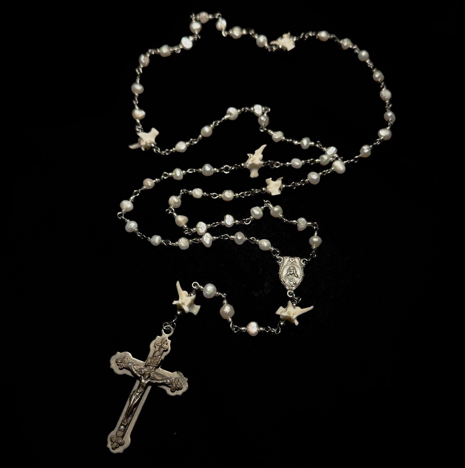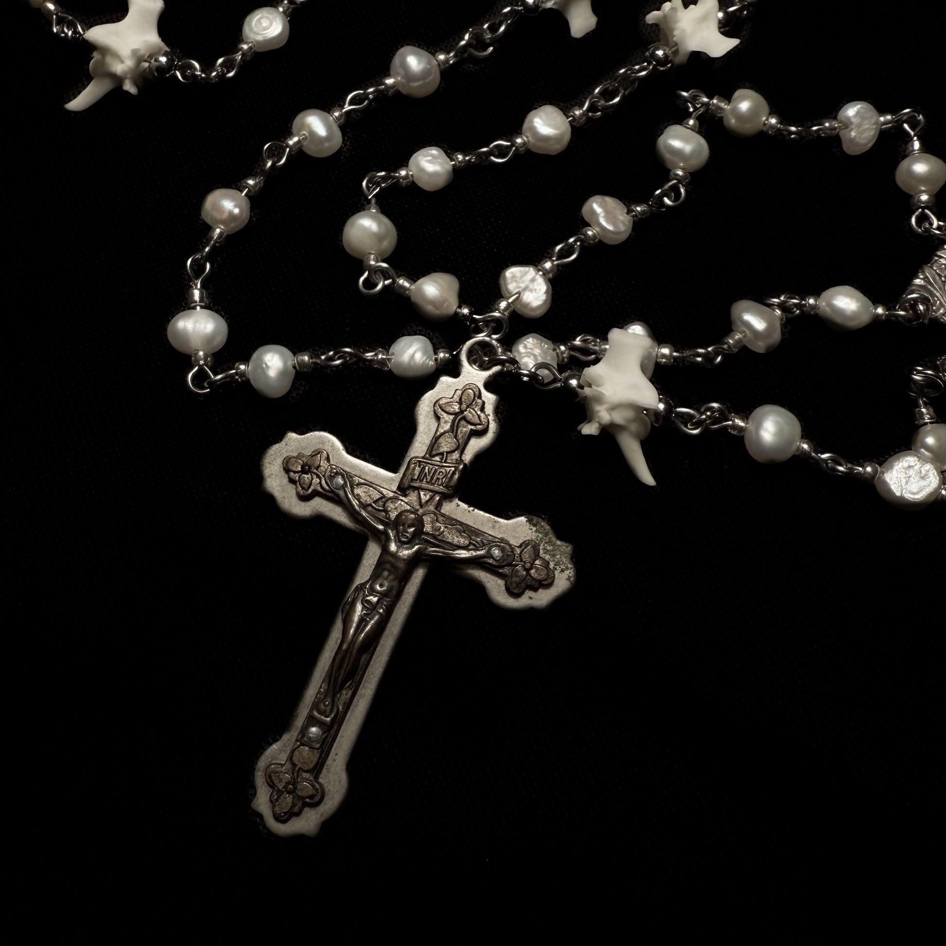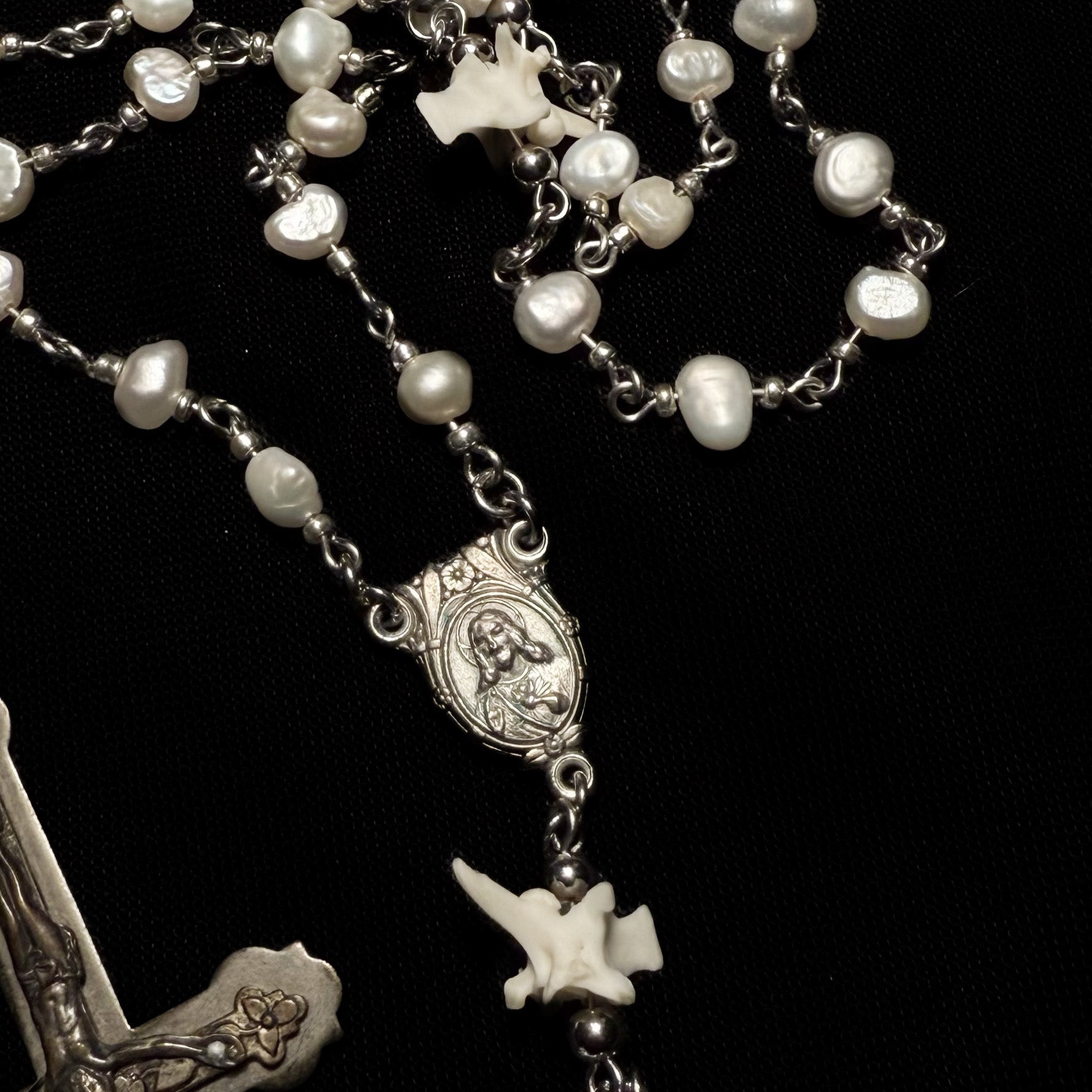 Rosary made of real freshwater pearls, real snake vertebrae bones, vintage centerpiece, and vintage crucifix pendant. All wiring is done on stainless steel and by hand. One of a kind piece.