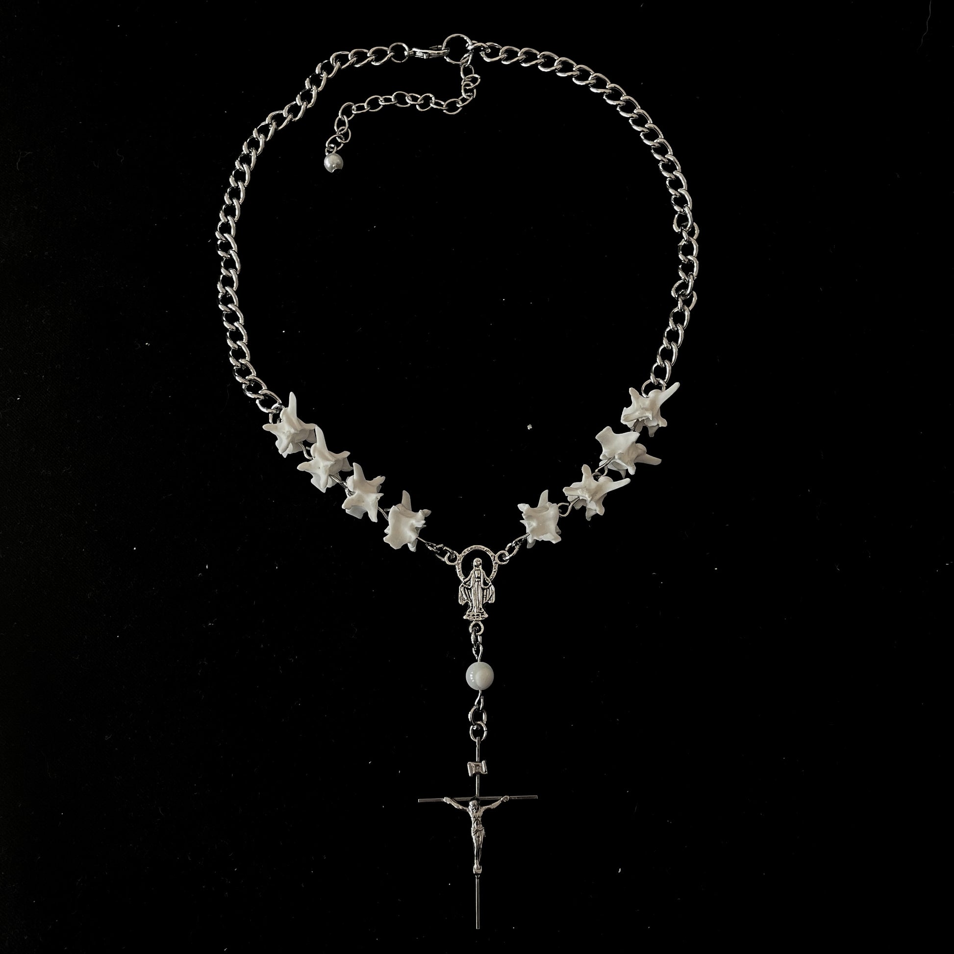 ✧ Choker style necklace featuring real rattlesnake vertebrae in the front, chain back, vintage extremely thin crucifix connected to a mother of pearl bead