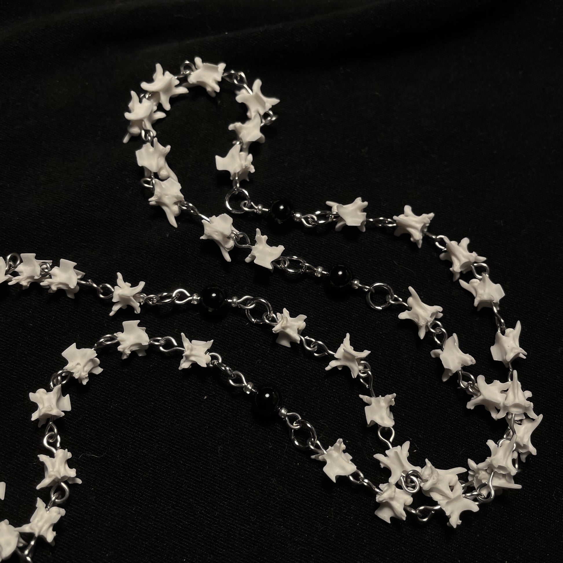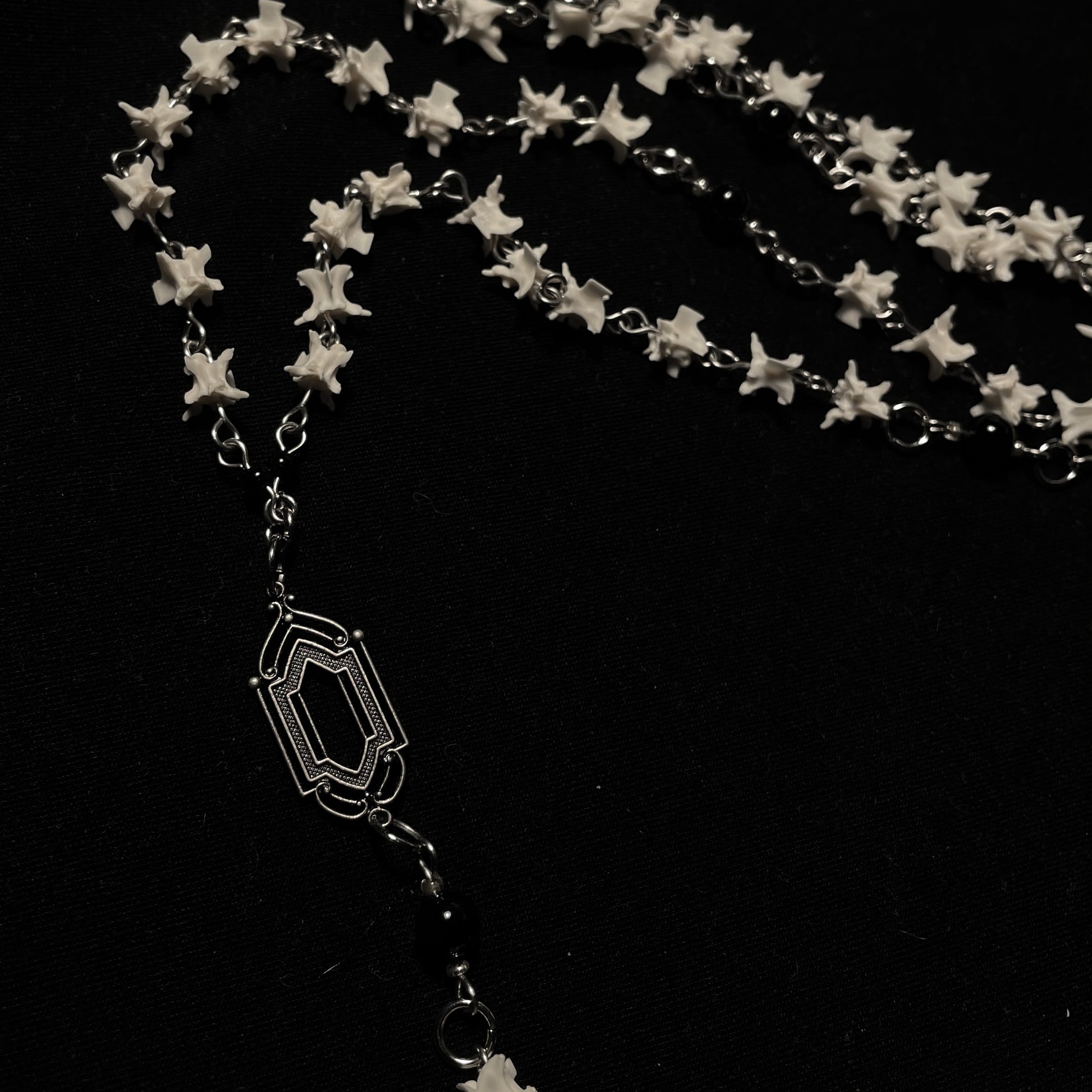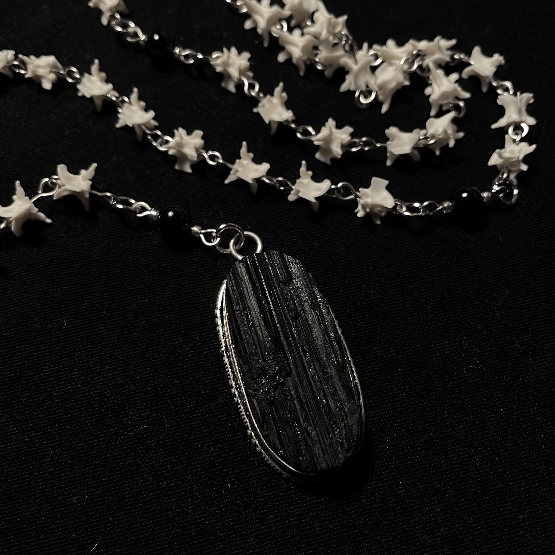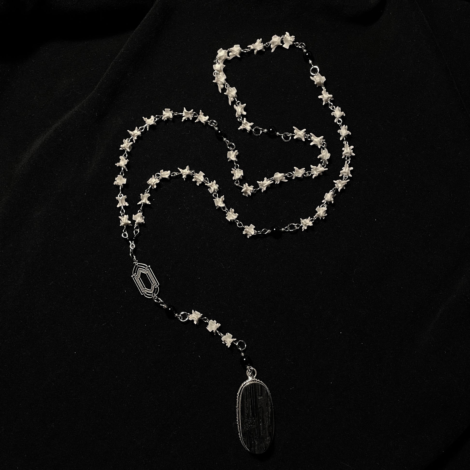 ✧ Bone rosary style necklace with real rattlesnake vertebrae bones, black tourmaline crystal pendant, and black onyx crystal beads