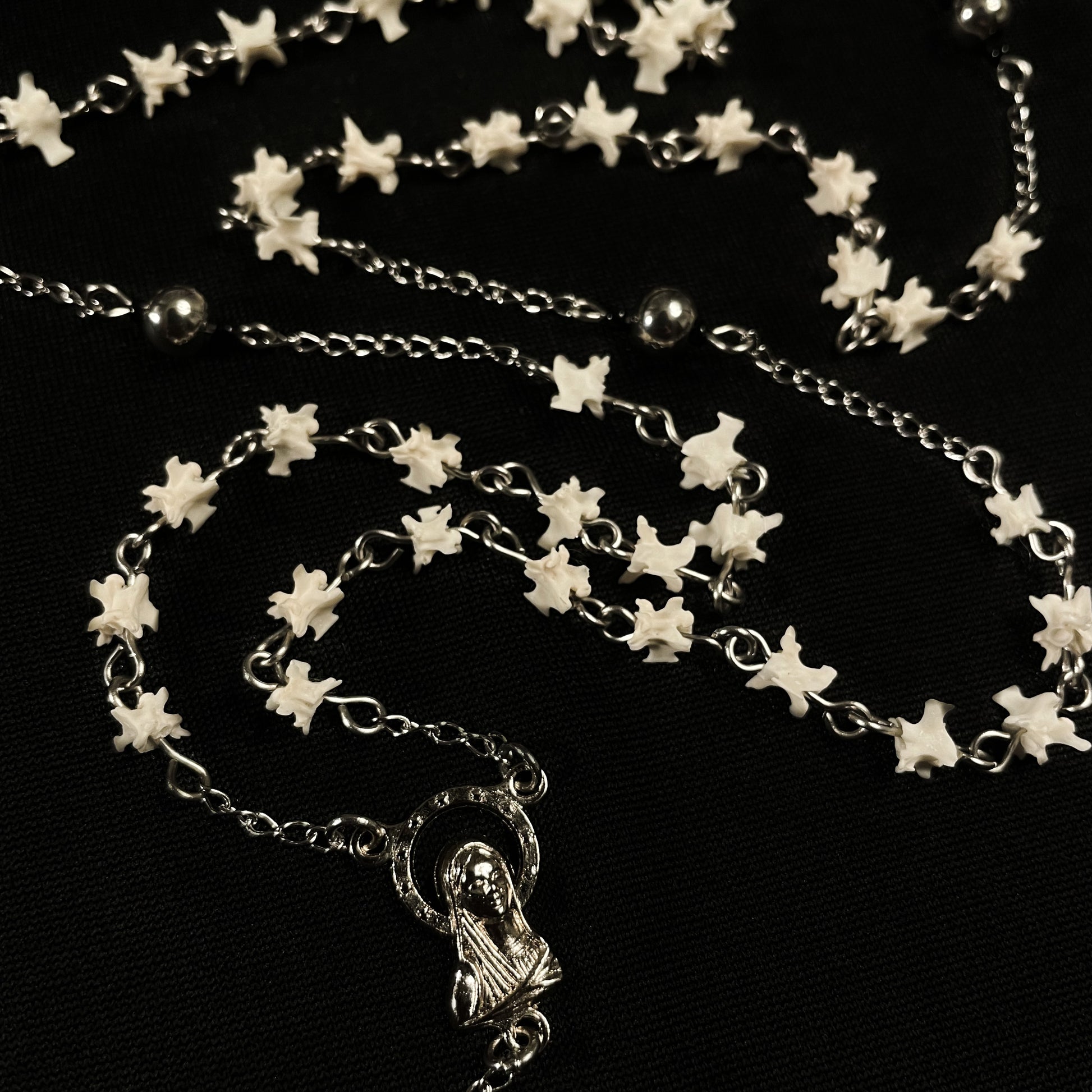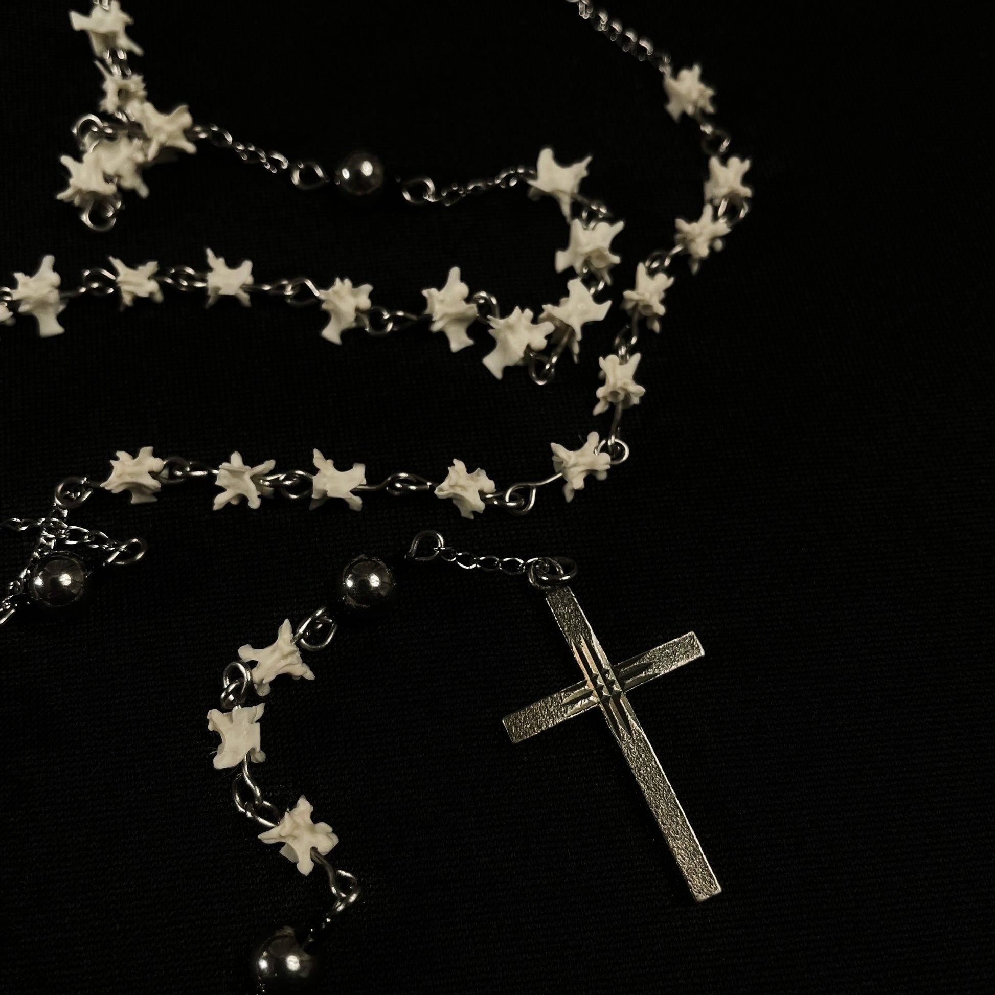 ✧ Classic style bone rosary featuring real rattlesnake vertebrae bones, stainless steel beads, and vintage cross pendant all wired on stainless steel.