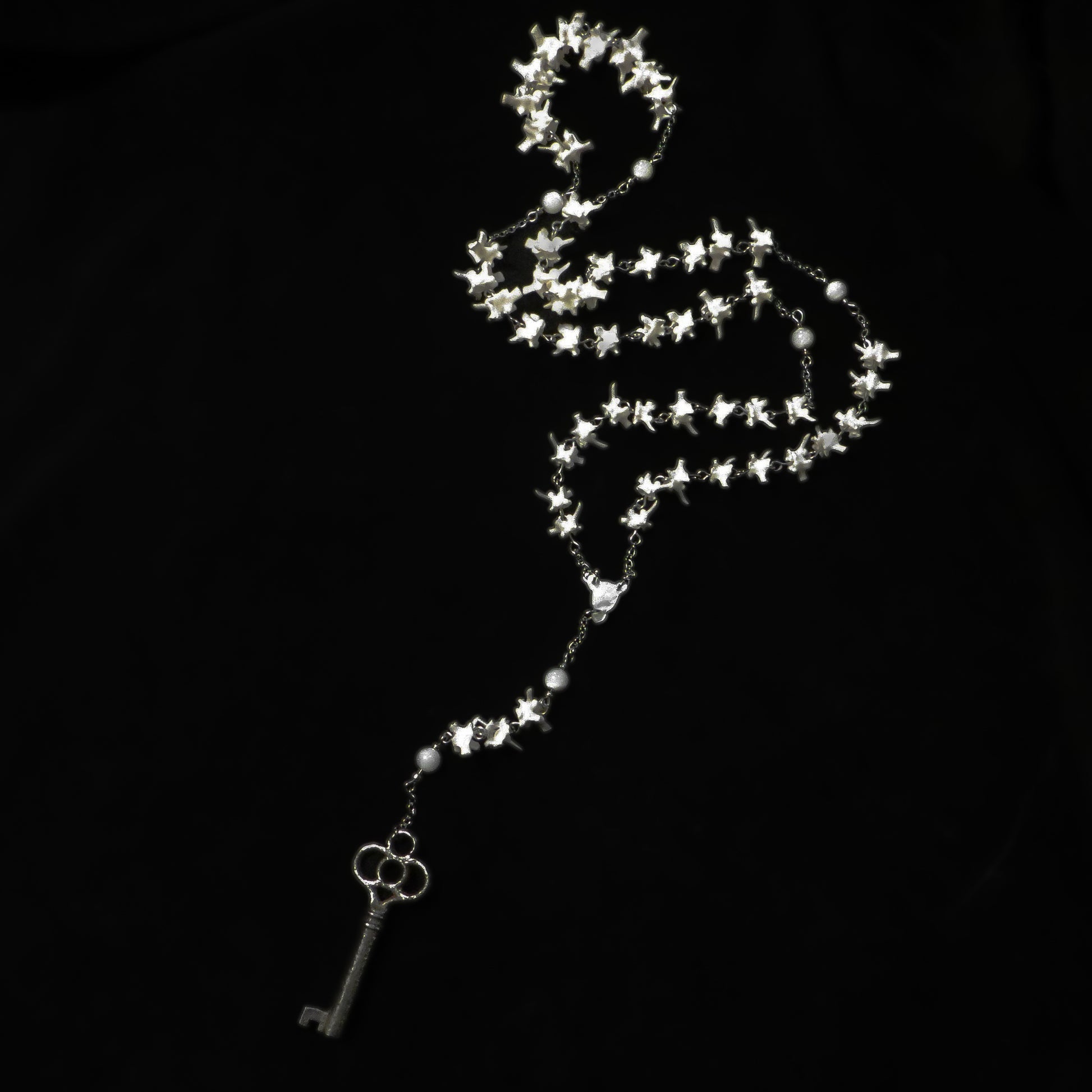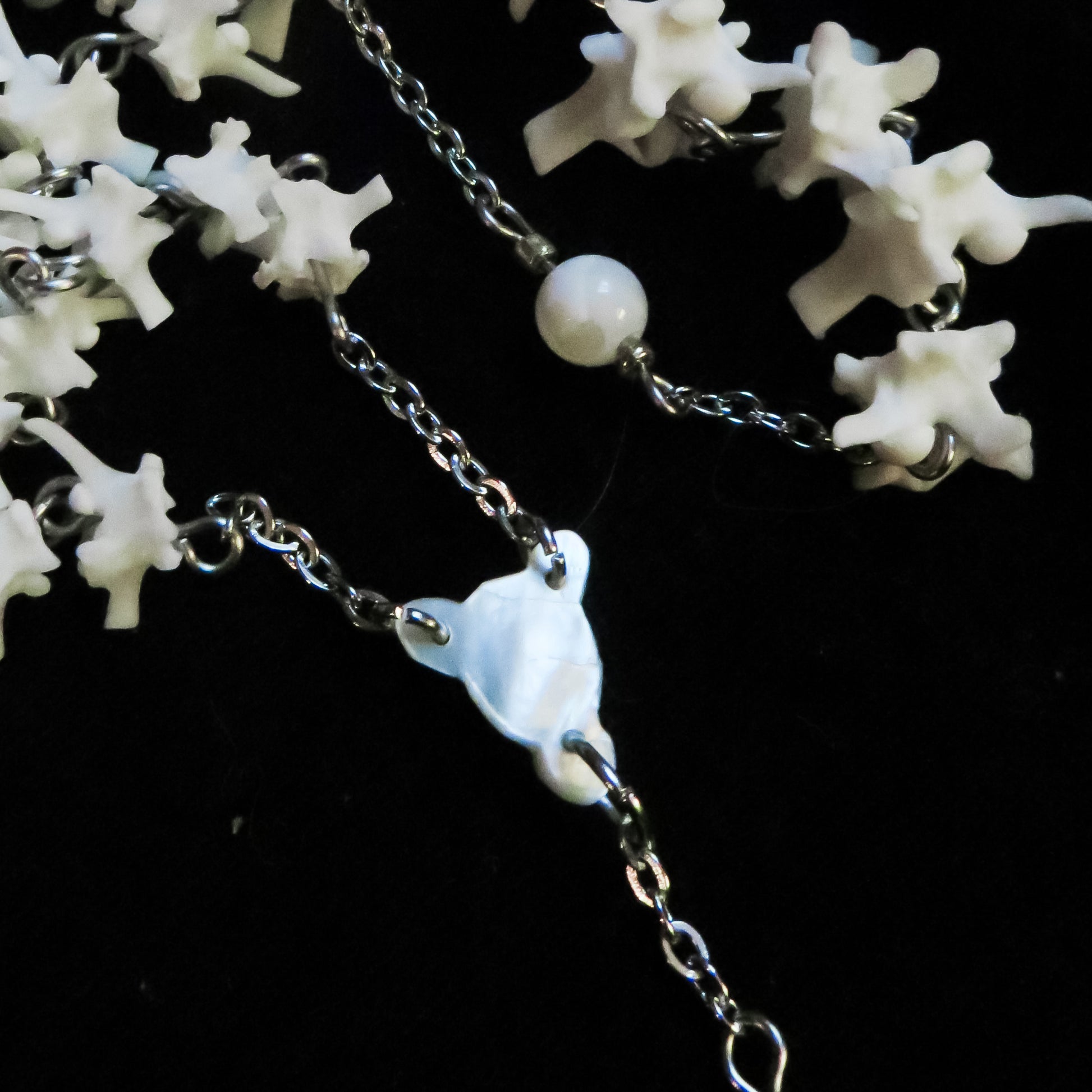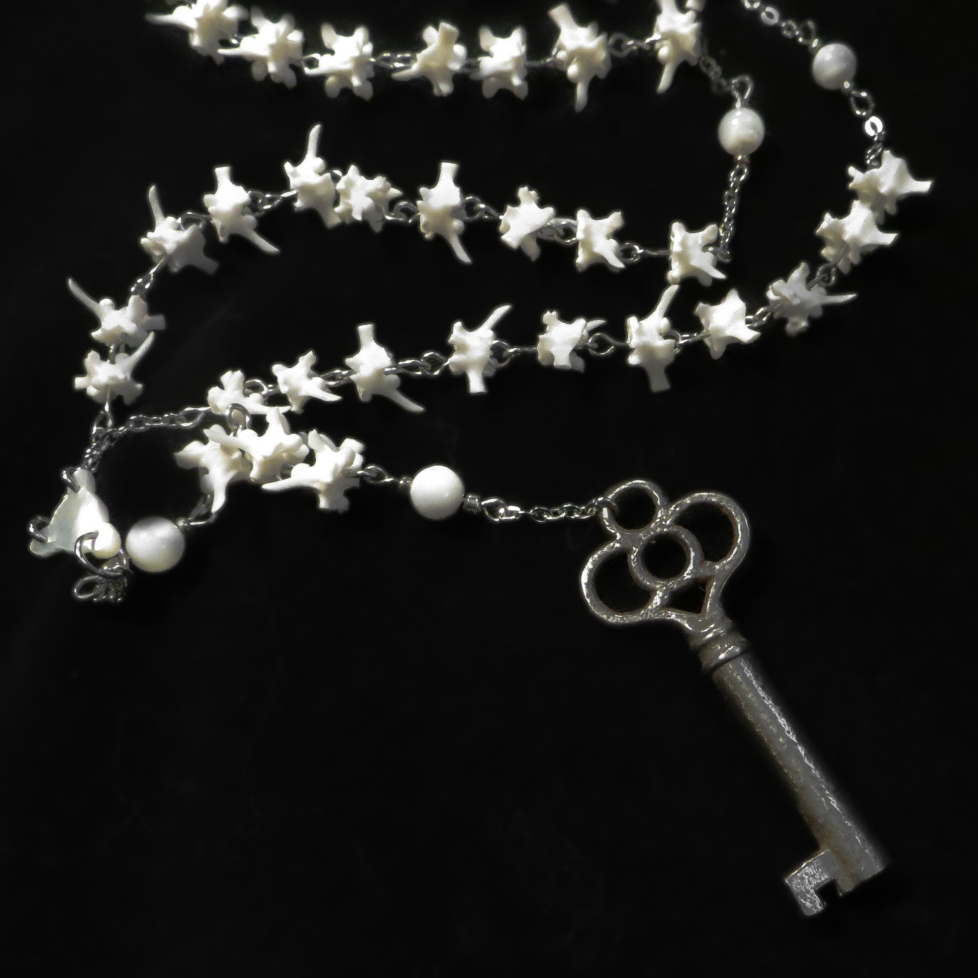 ⟡ Non-religious rosary style necklace made entirely out of real snake vertebrae bones, mother of pearl beads, stainless steel wire, antique key, and vintage mother of pearl centerpiece.