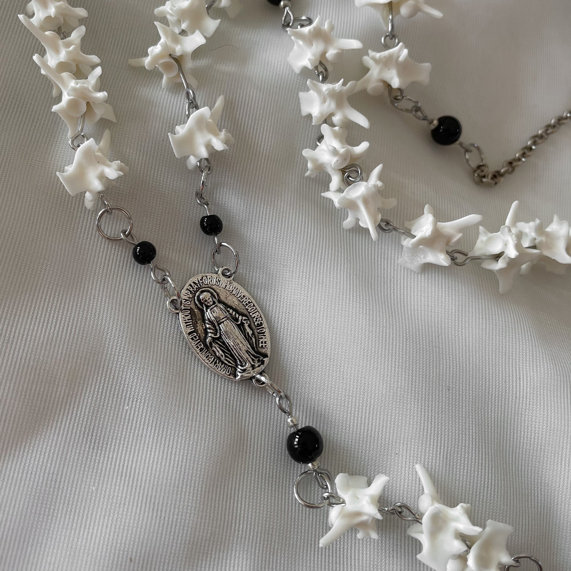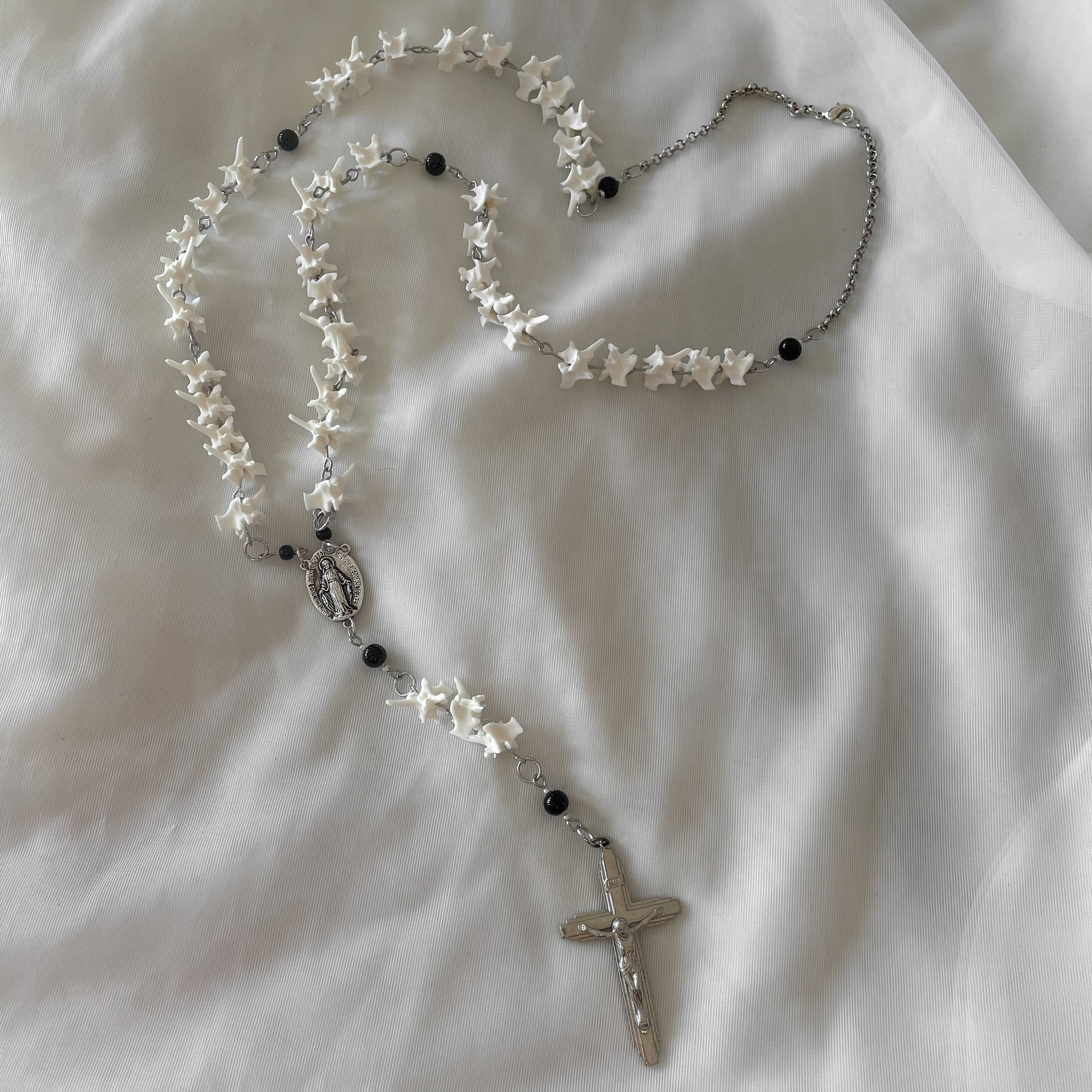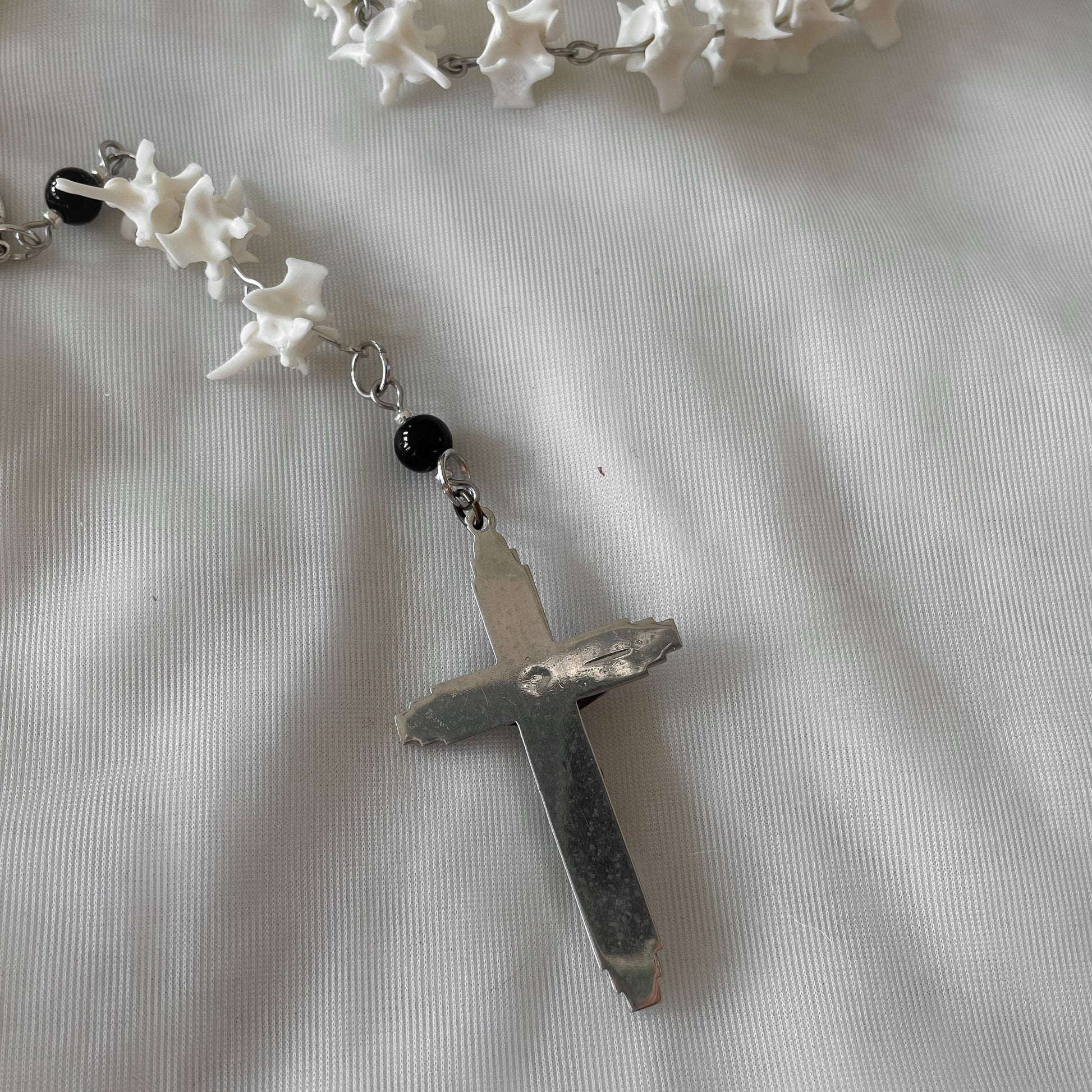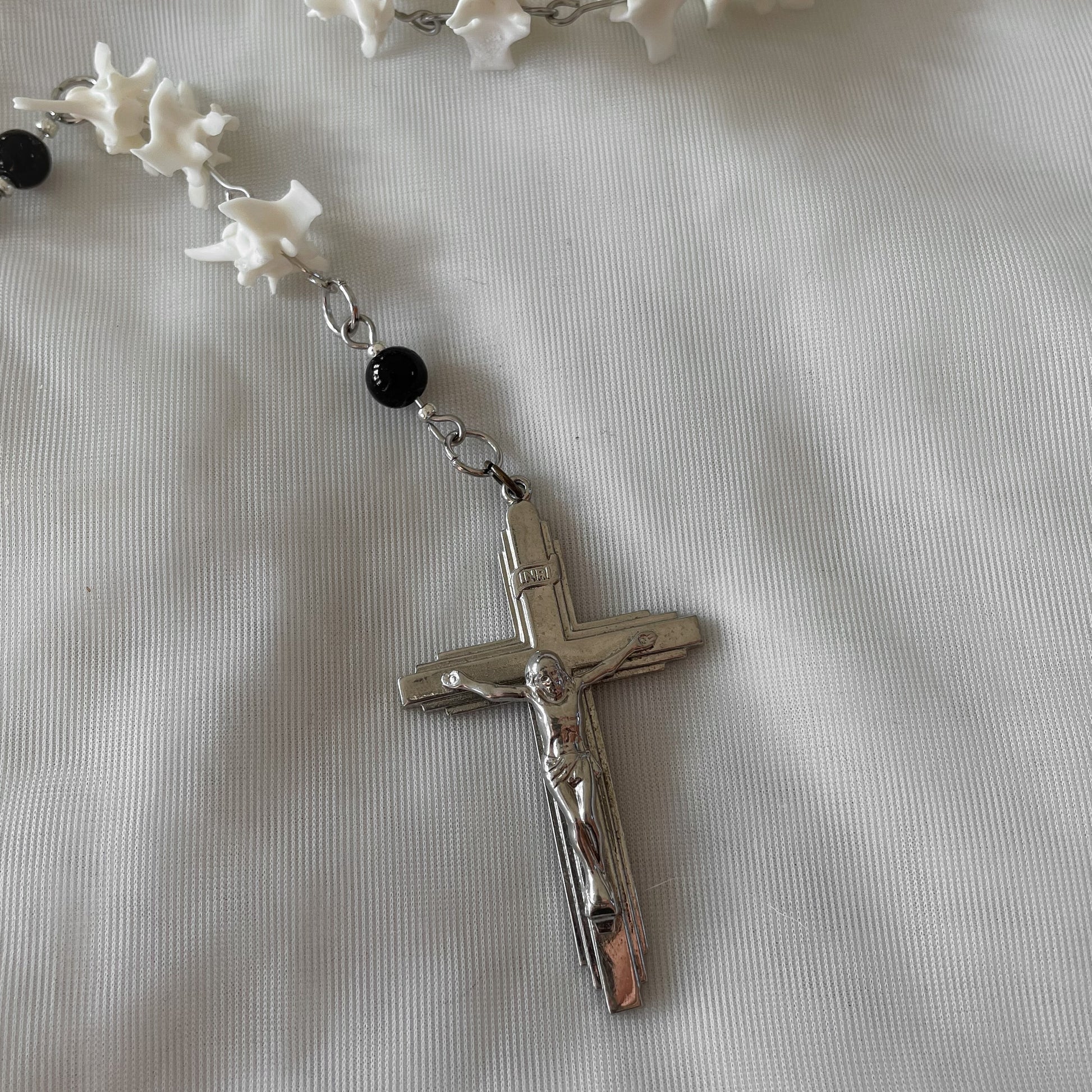✧ Rosary style necklace made of real rattlesnake vertebrae, black onyx stone separator beads, crucifix pendant, and chain in the back for comfort while wearing