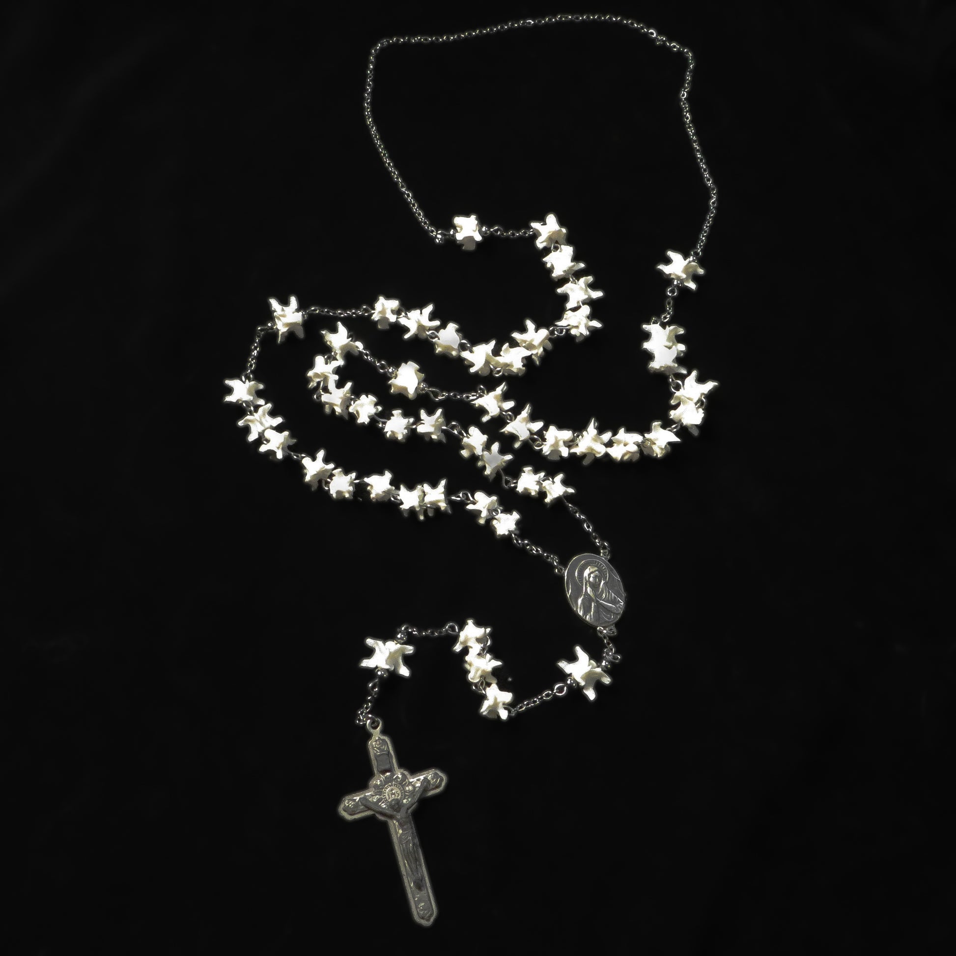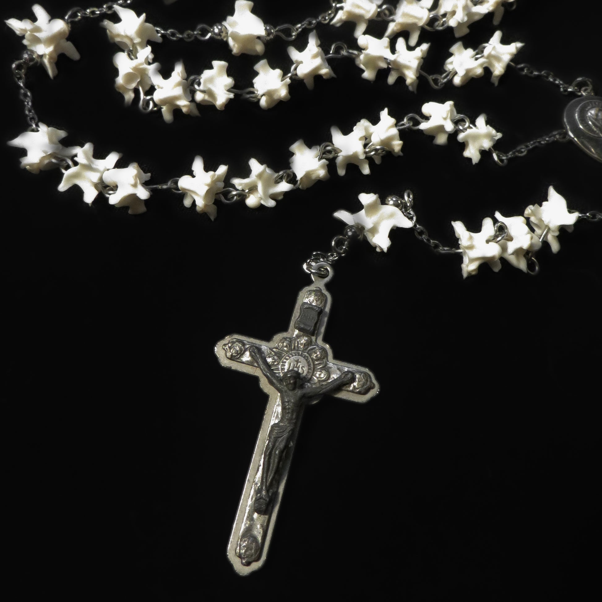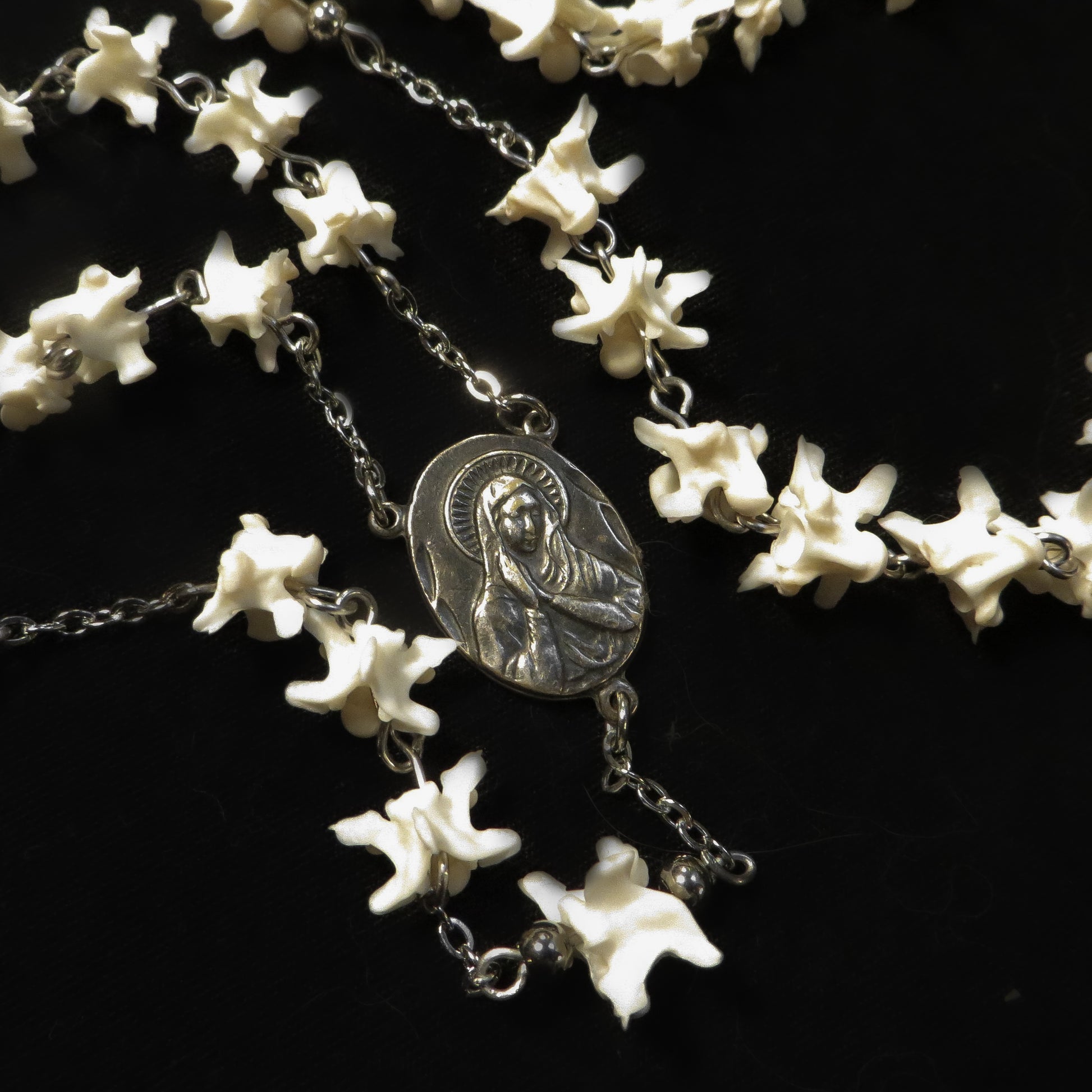 ⟡ Bone rosary style necklace made entirely out of real snake vertebrae bones, stainless steel wire, vintage rosary centerpiece and crucifix, and stainless steel chain in the back for comfort while wearing