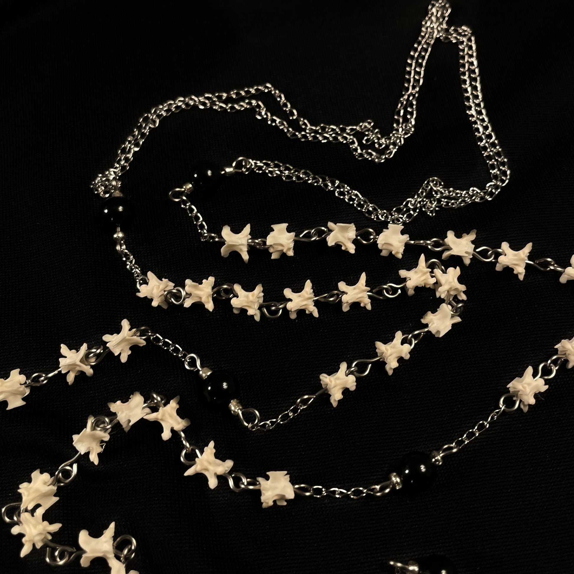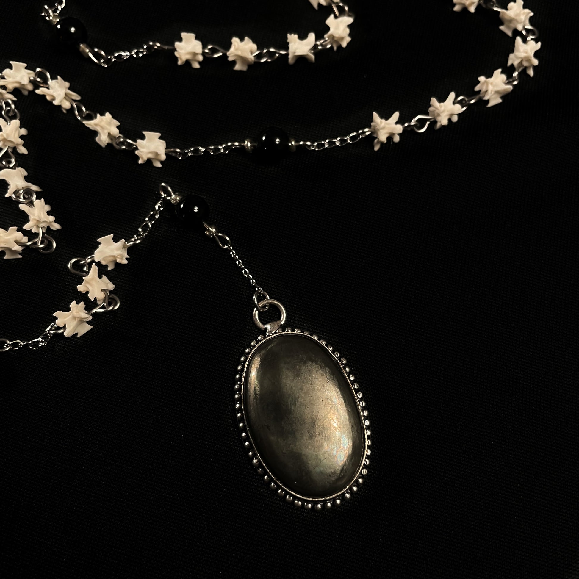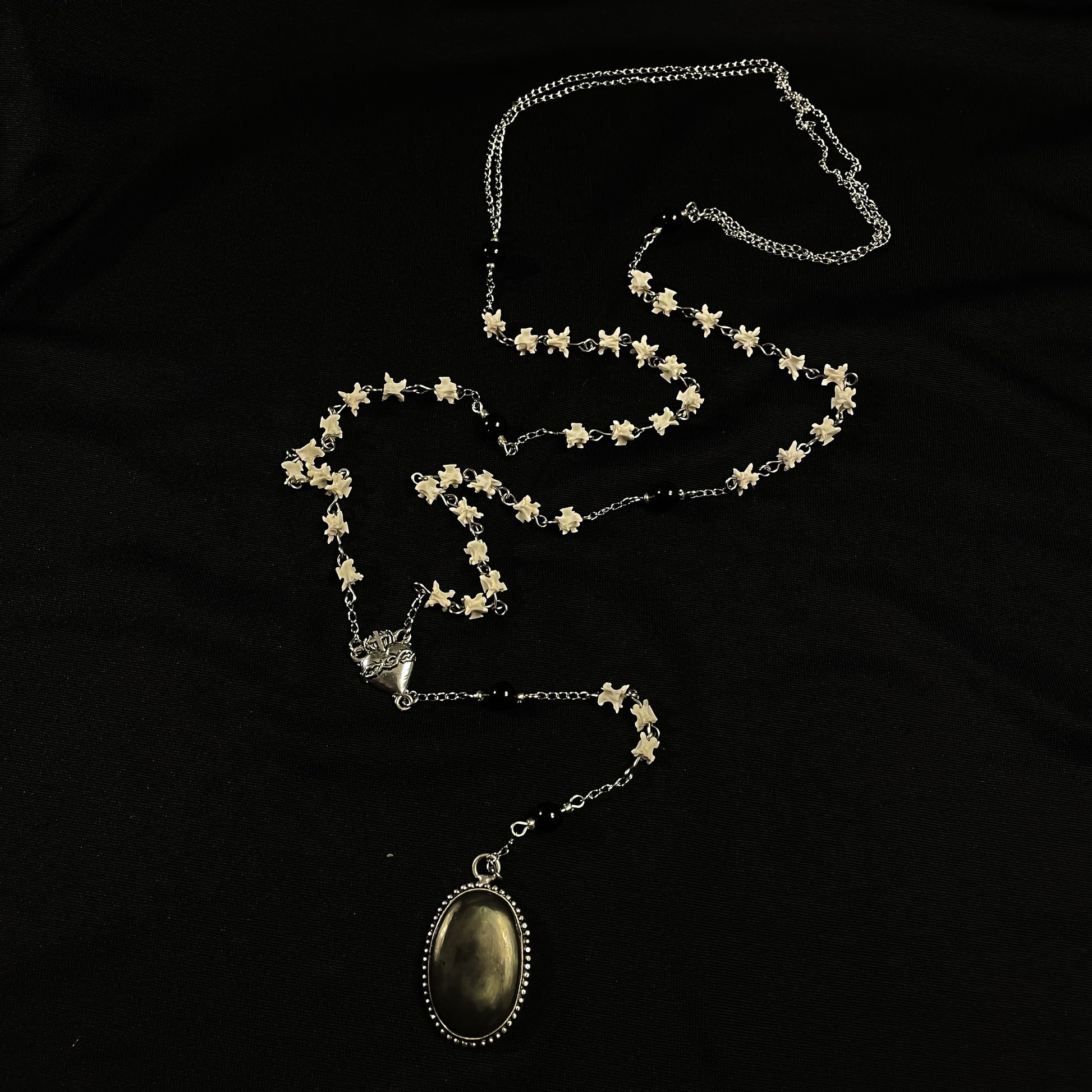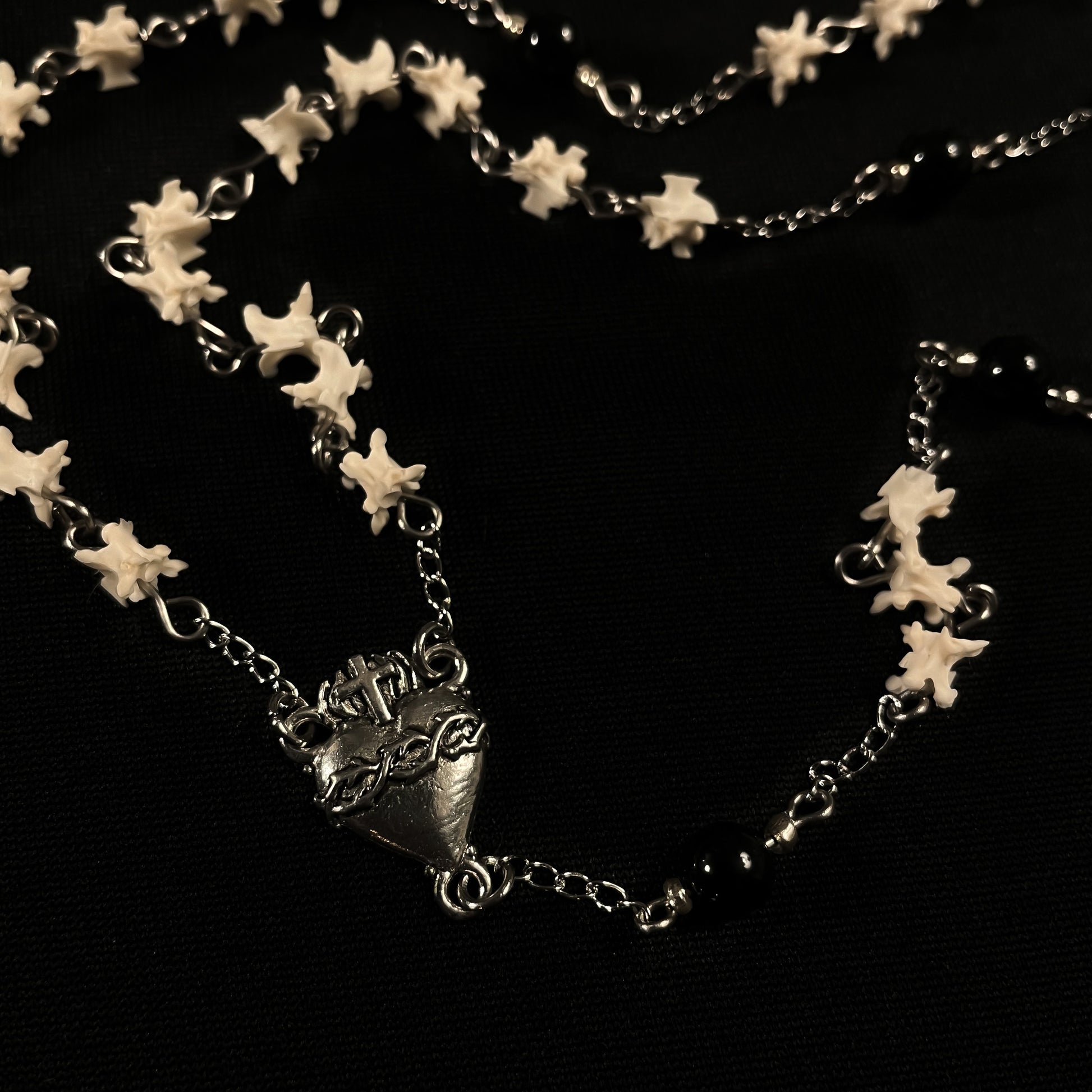 ✧ Rosary style necklace featuring real rattlesnake vertebrae bones, black onyx beads, pyrite stone pendant, and two chain in the back for additional comfort while wearing. Includes sacred heart centerpiece.