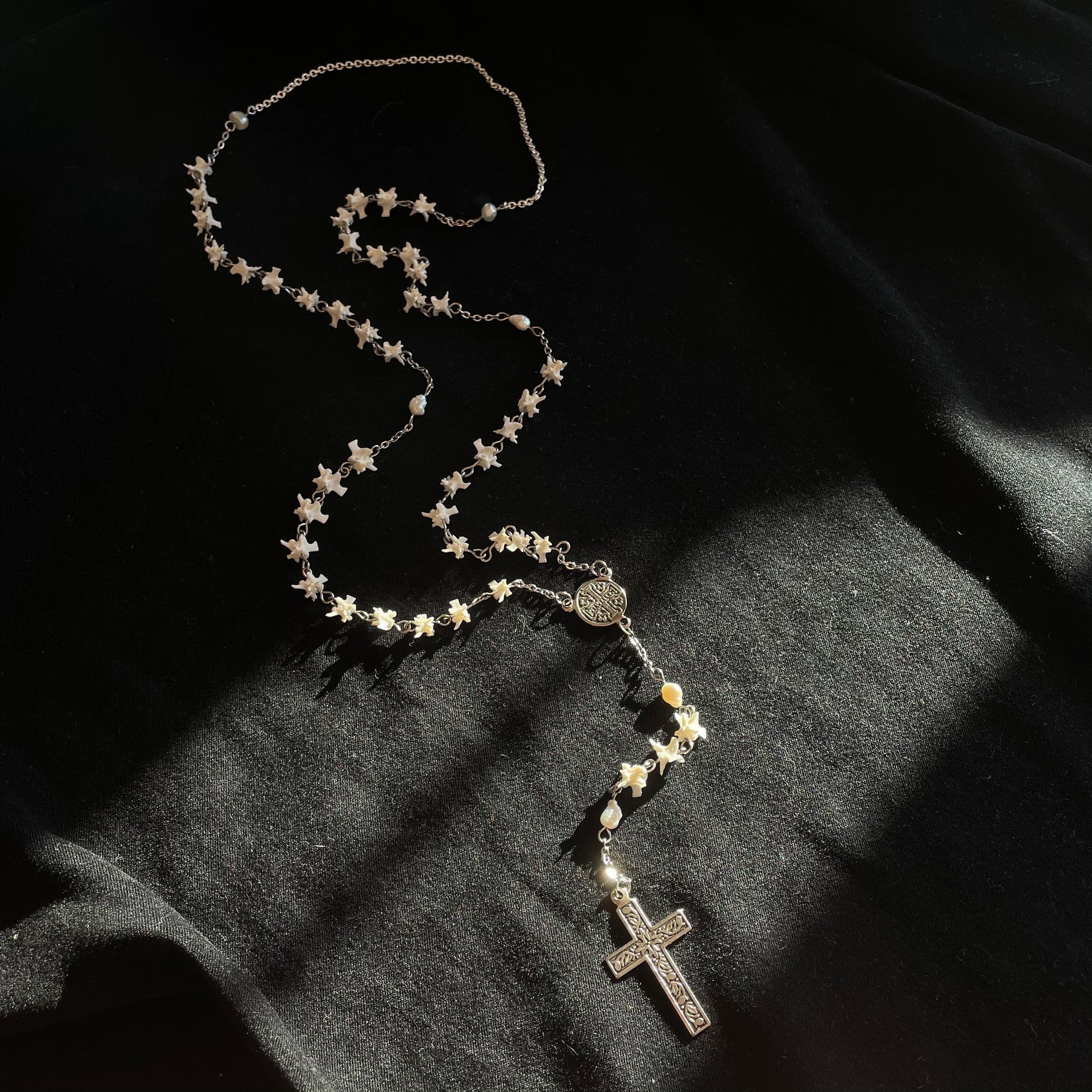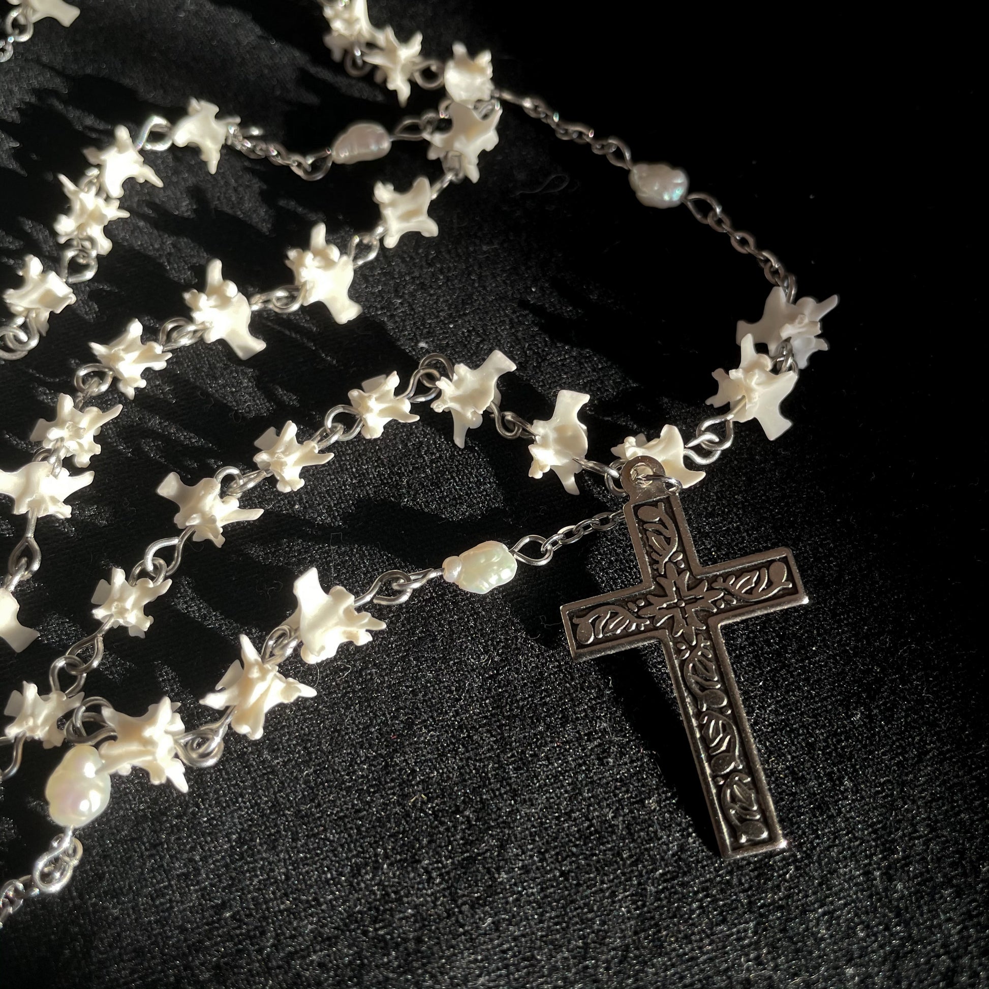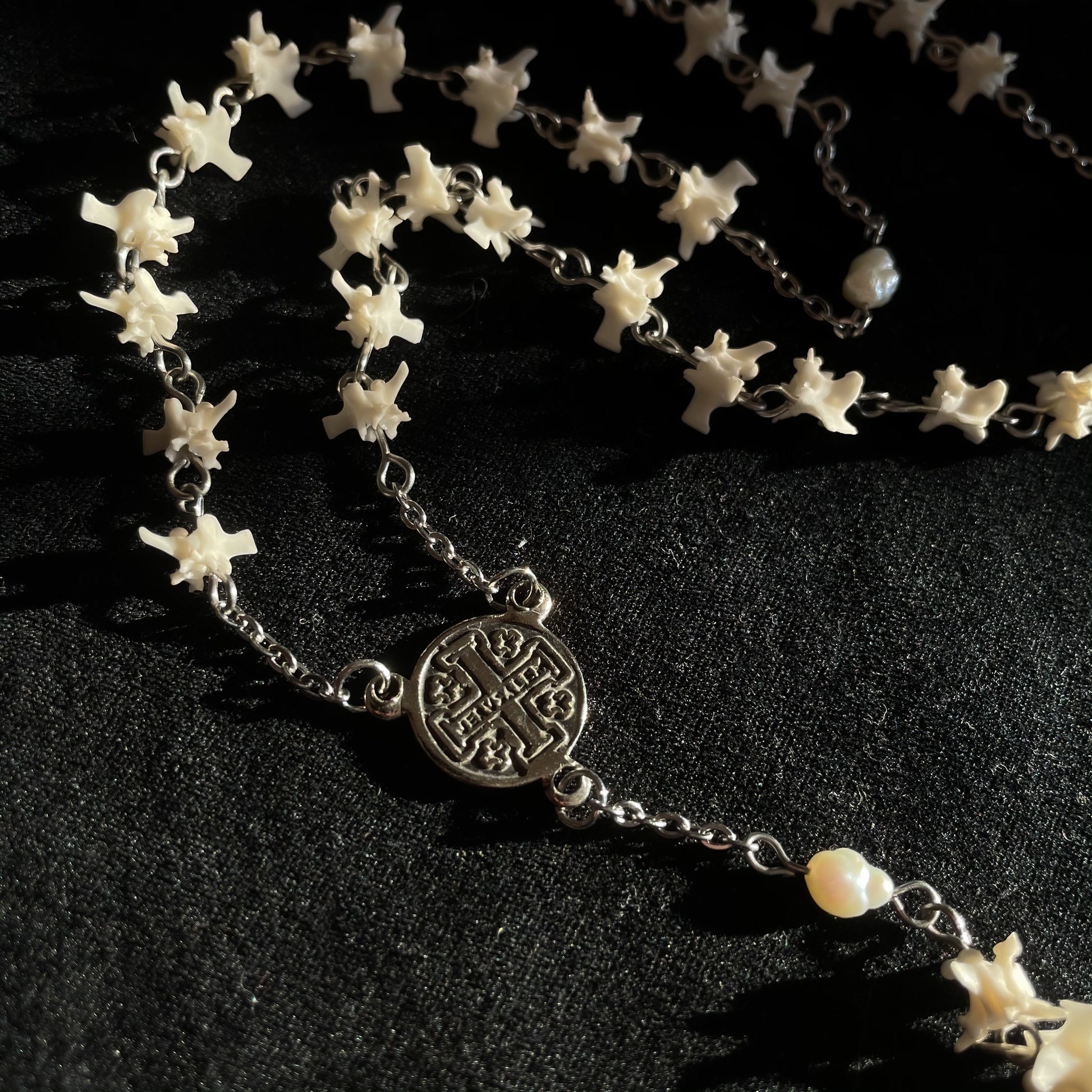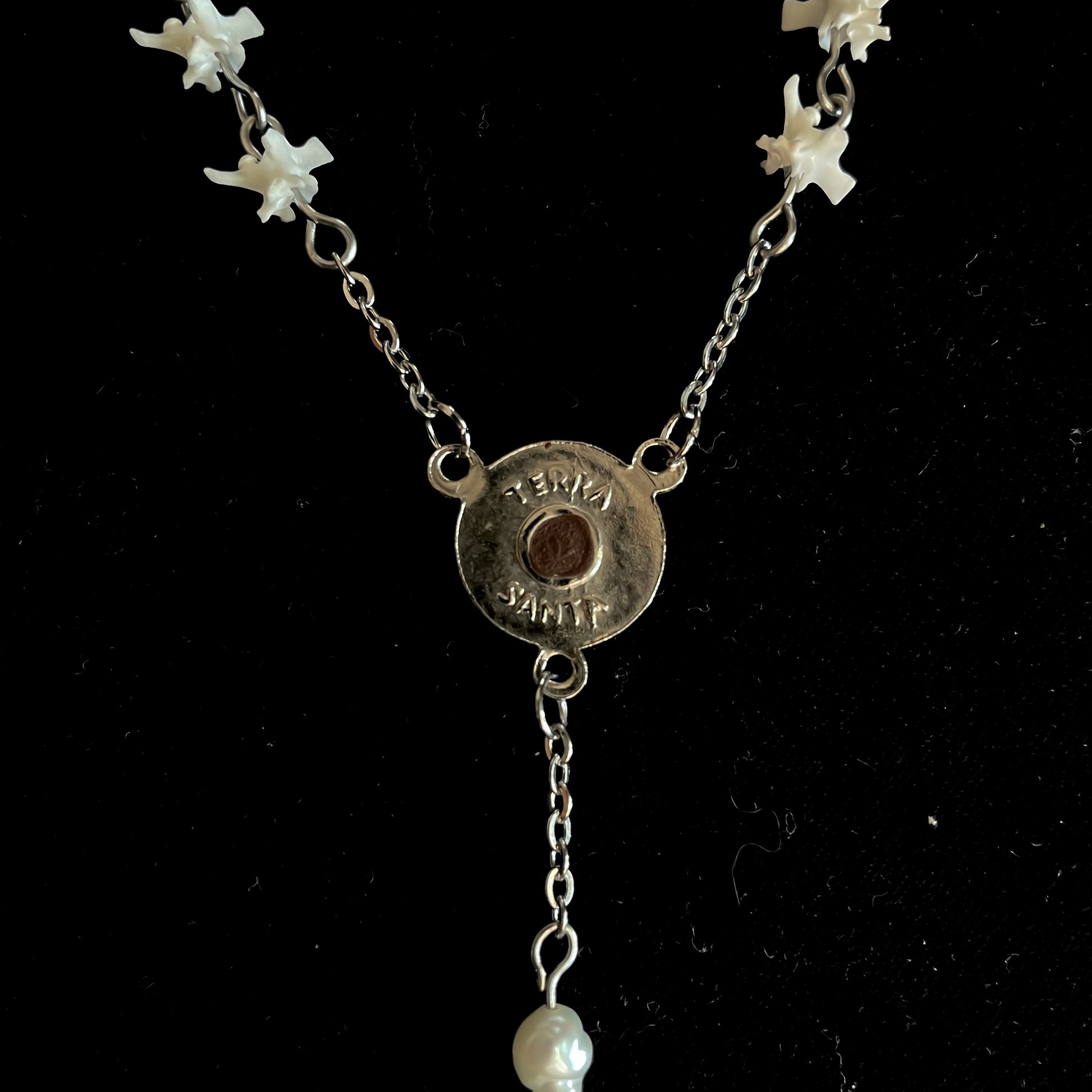 ✧ Rosary style necklace made of real rattlesnake vertebrae, freshwater pearl separator beads, cross pendant with floral/ivy design, and centerpiece featuring Jerusalem Terra Santa (Holy Land) relic. Includes sterling silver chain in the back for comfort while wearing.