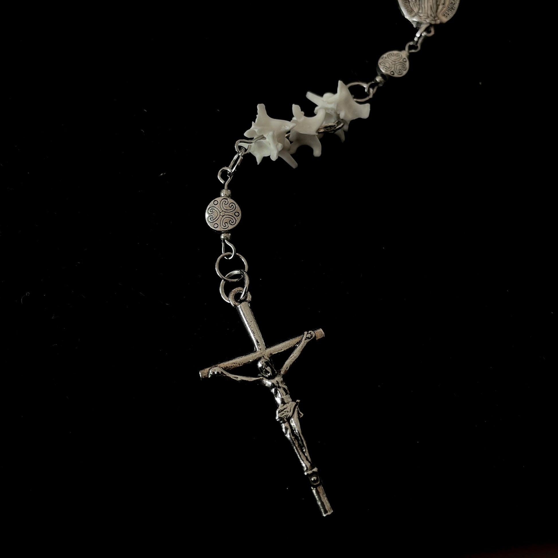 ✧ Rosary style necklace made of real rattlesnake vertebrae, inscribed metal separator beads, and crucifix pendant.