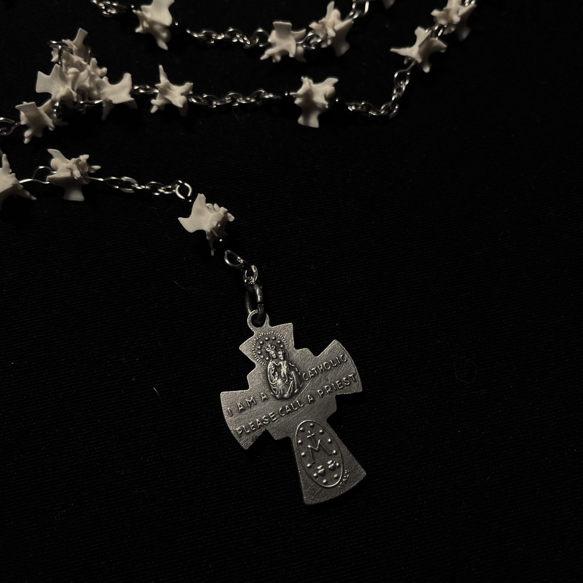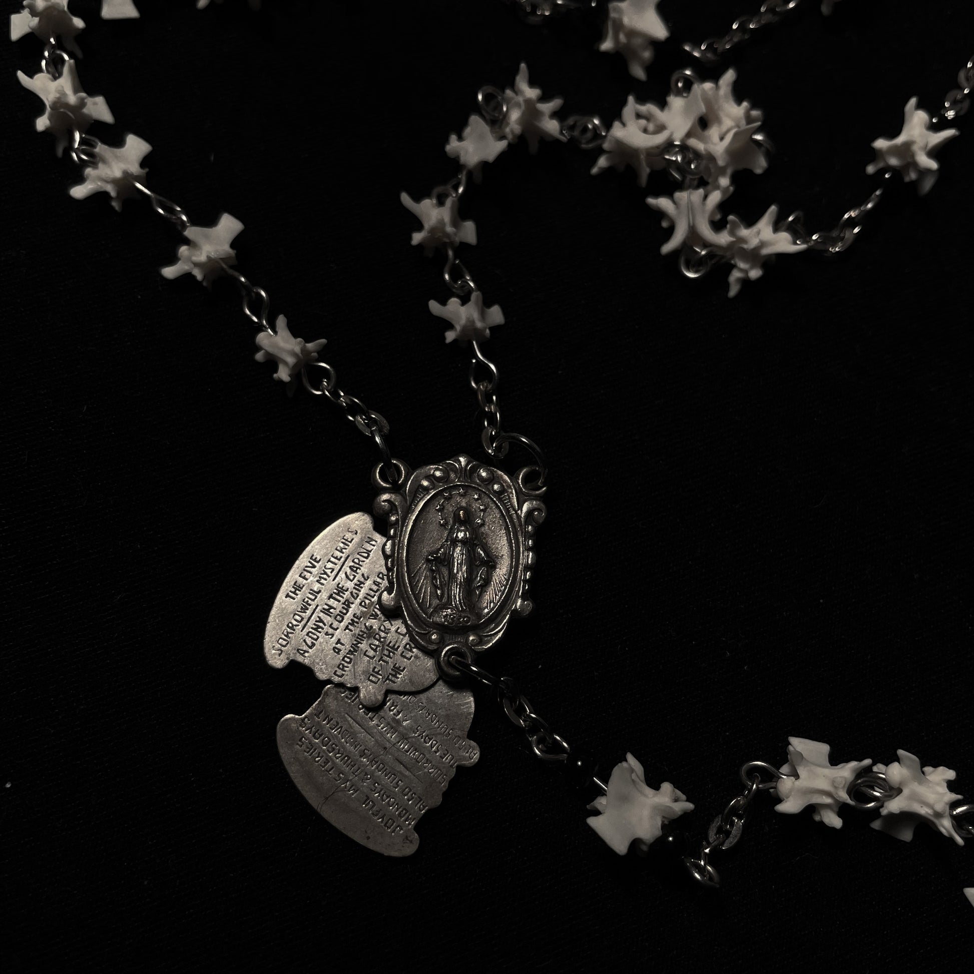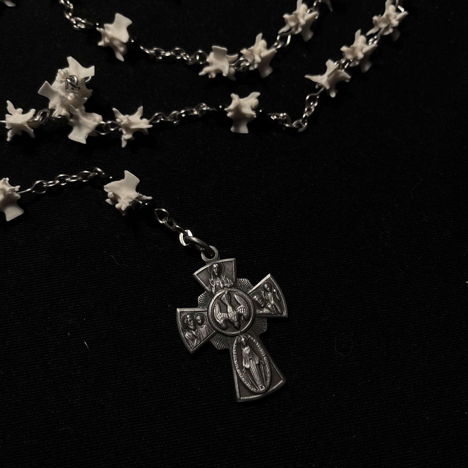✧ Bone rosary style necklace featuring real rattlesnake vertebrae bones, accent chains connecting bones, vintage sliding catholic centerpiece, and vintage pendant