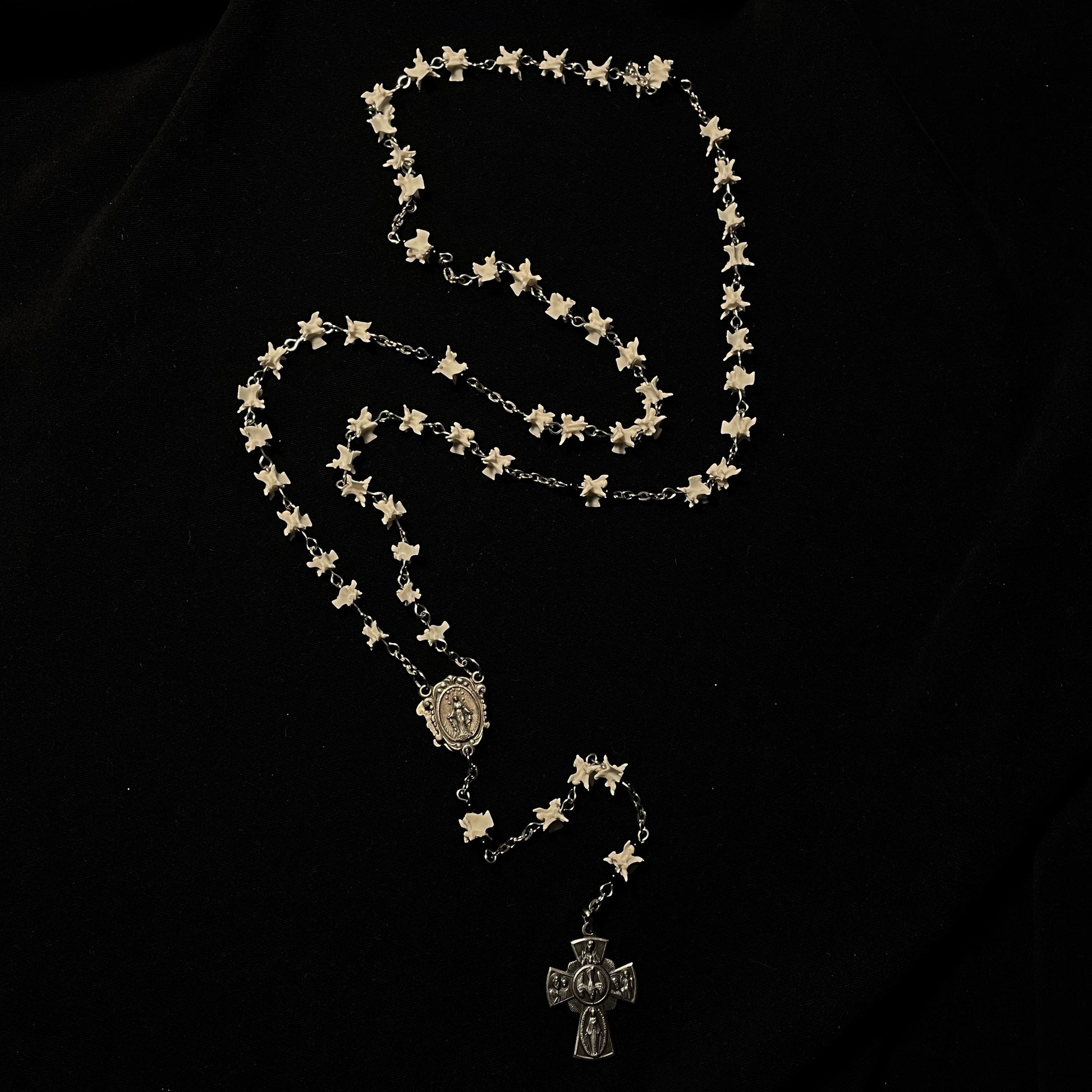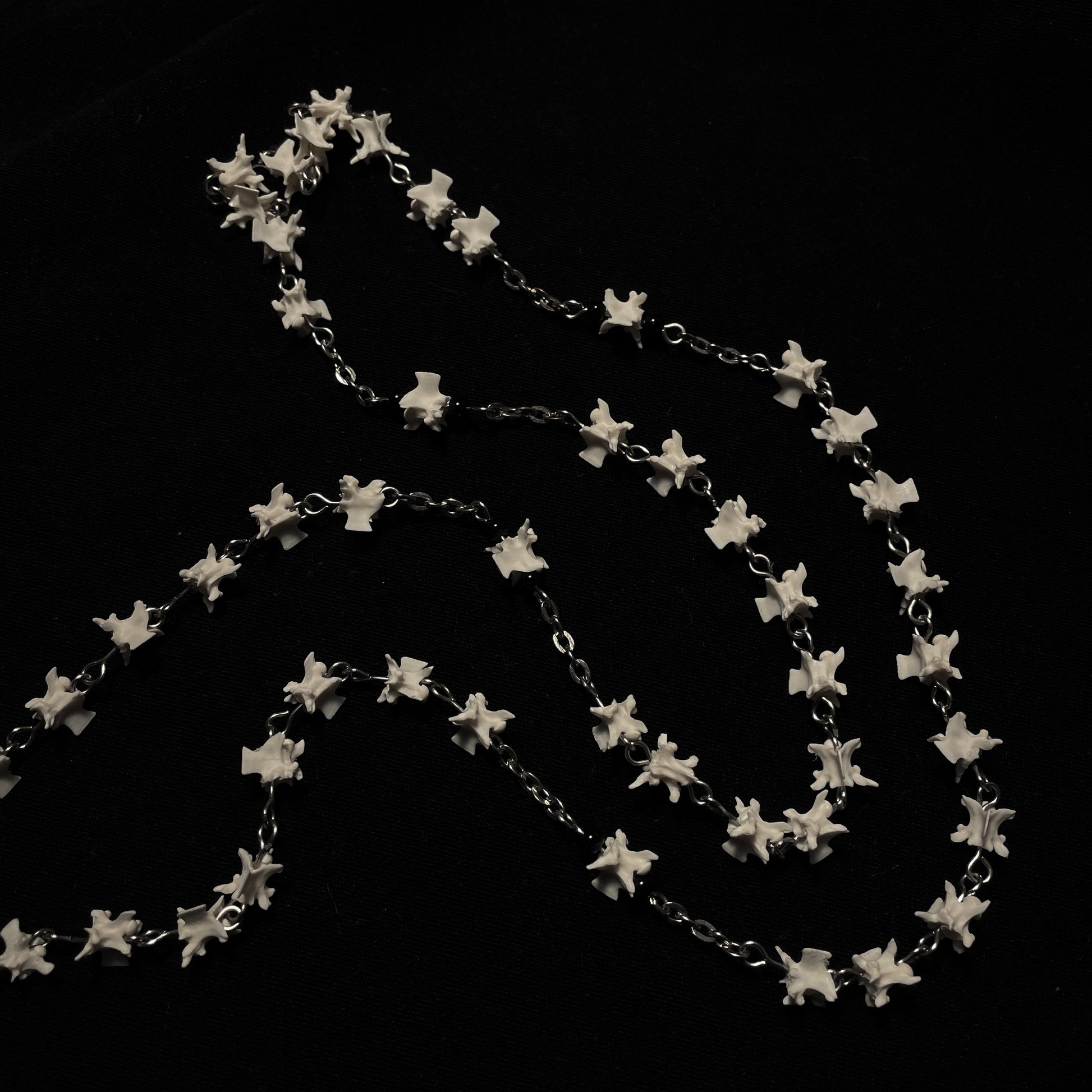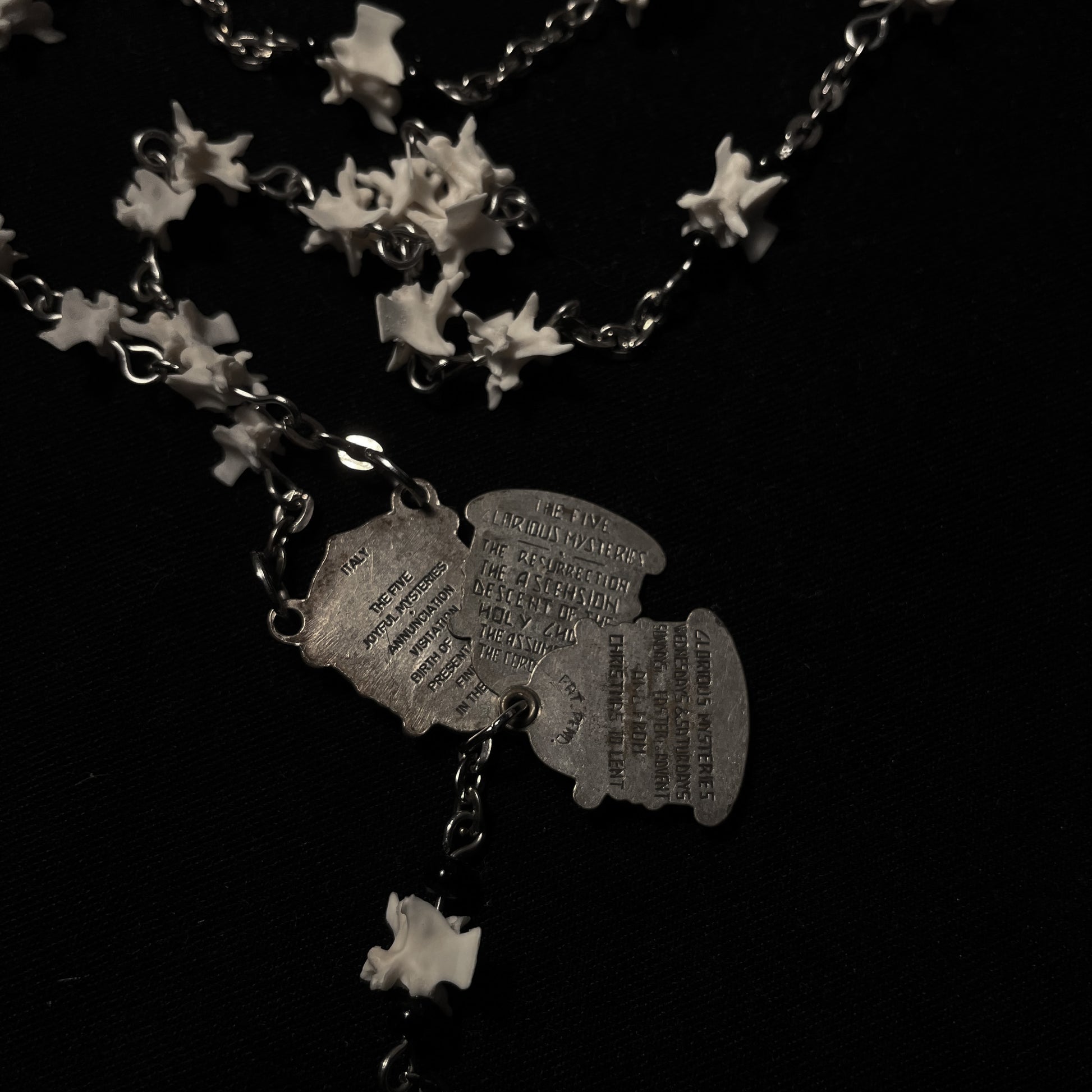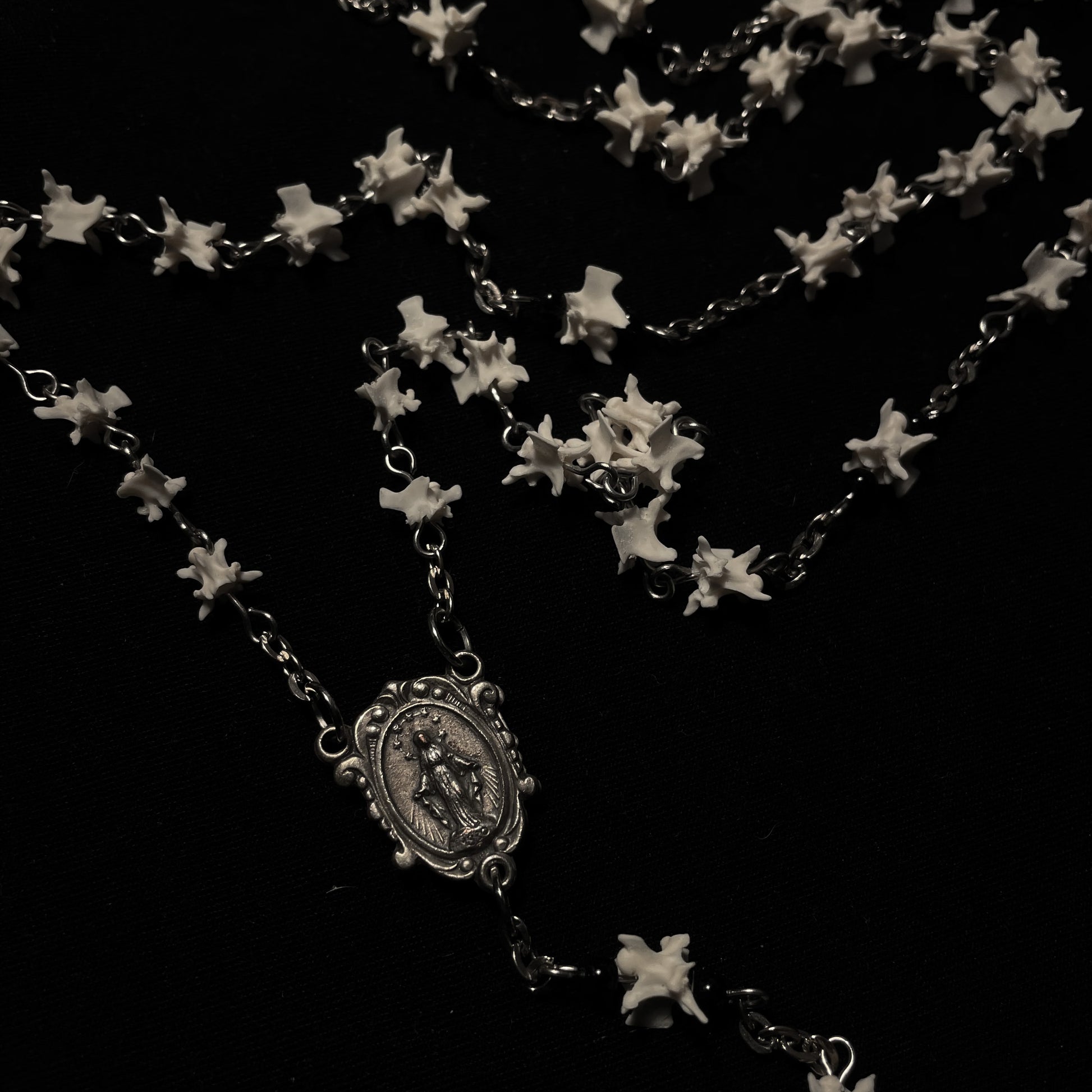 ✧ Bone rosary style necklace featuring real rattlesnake vertebrae bones, accent chains connecting bones, vintage sliding catholic centerpiece, and vintage pendant