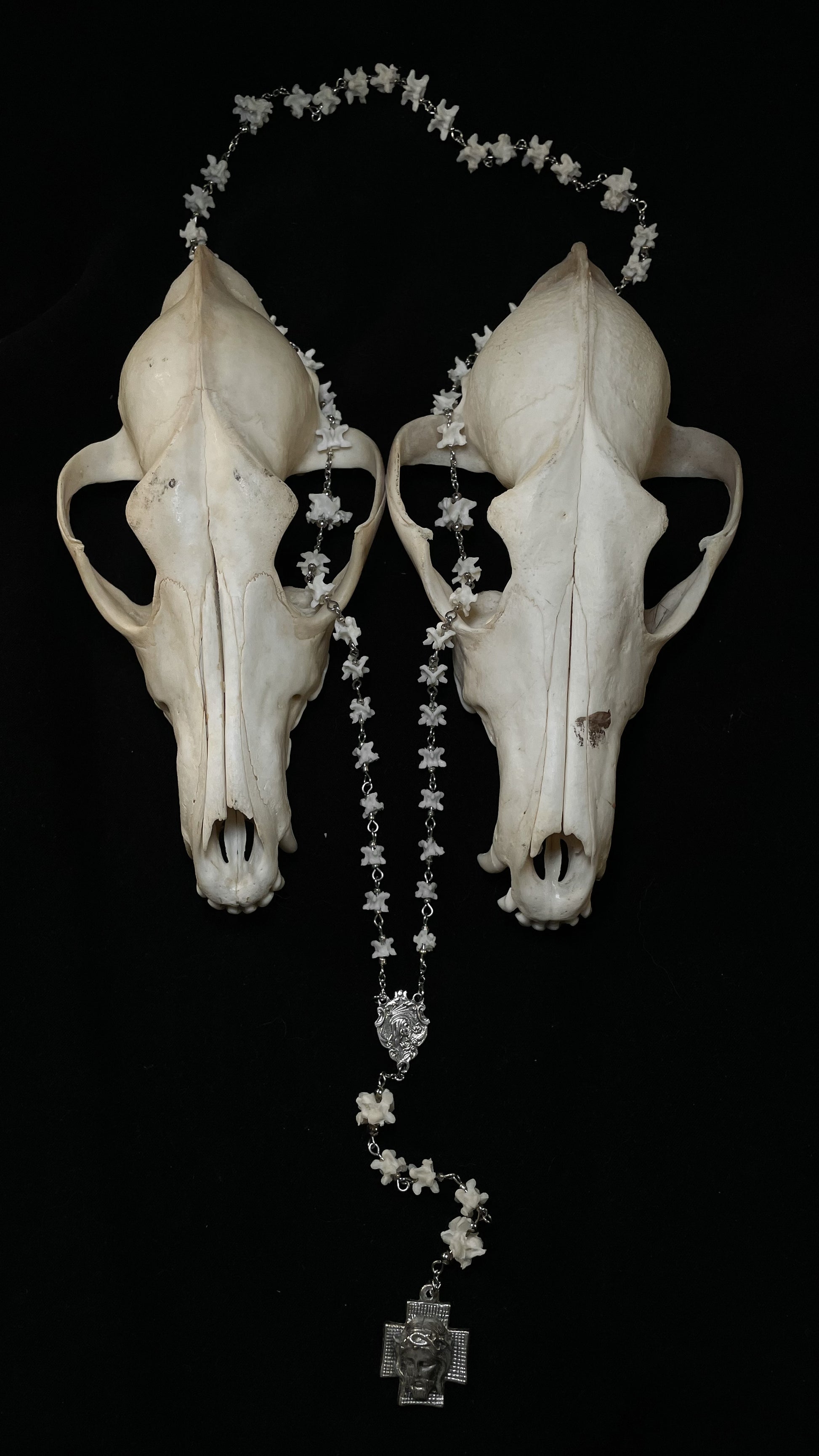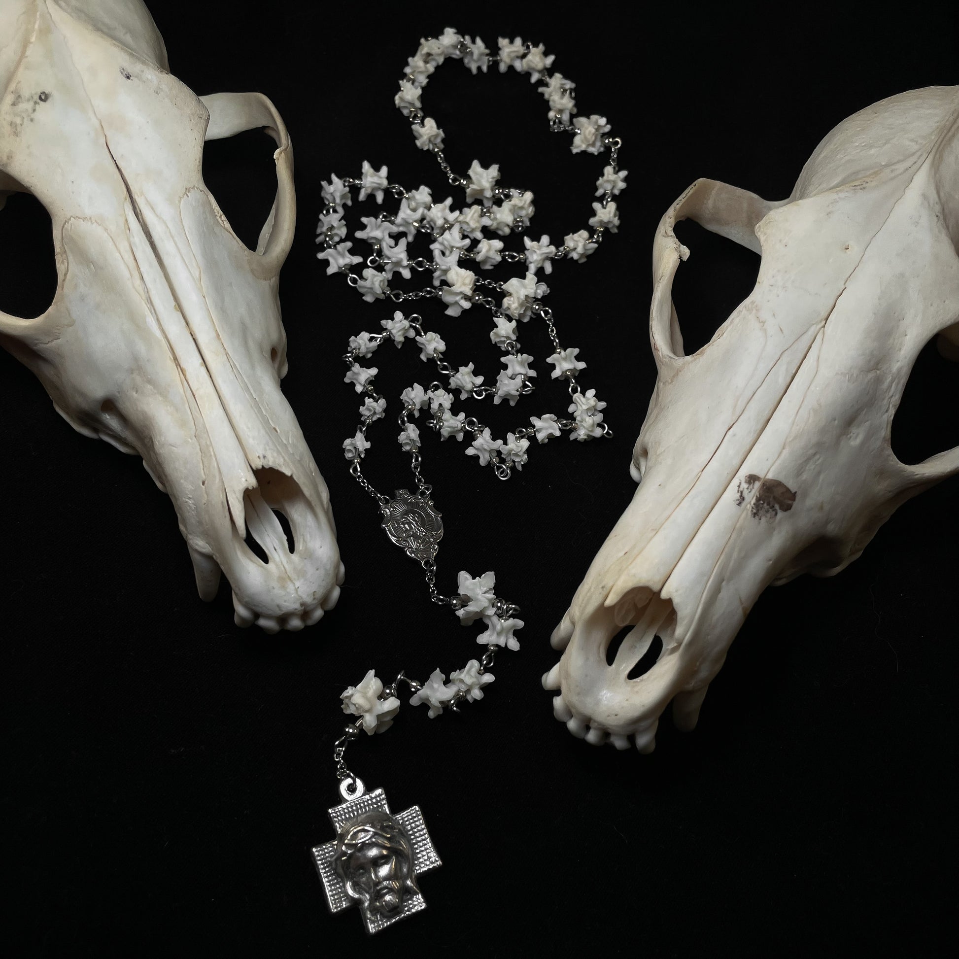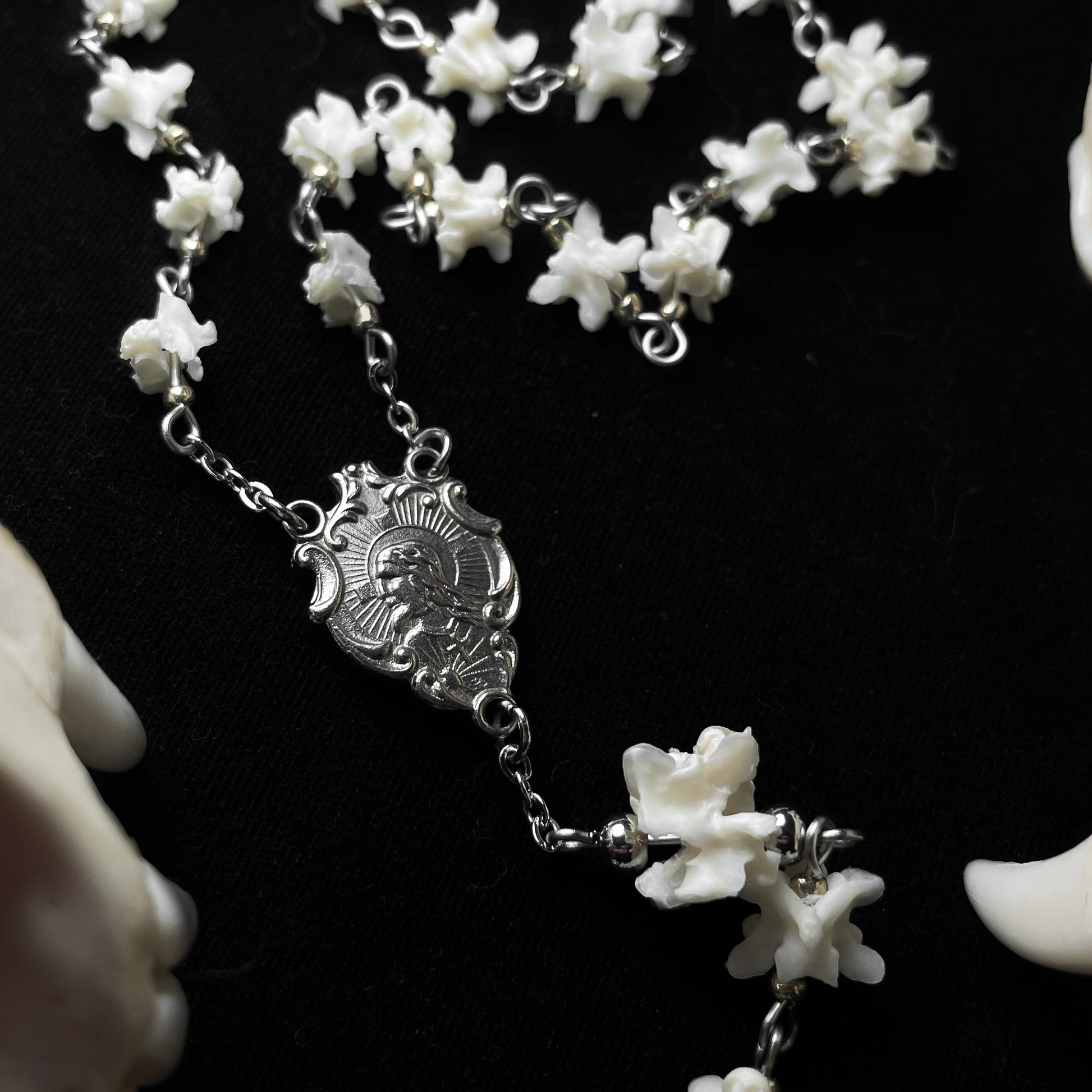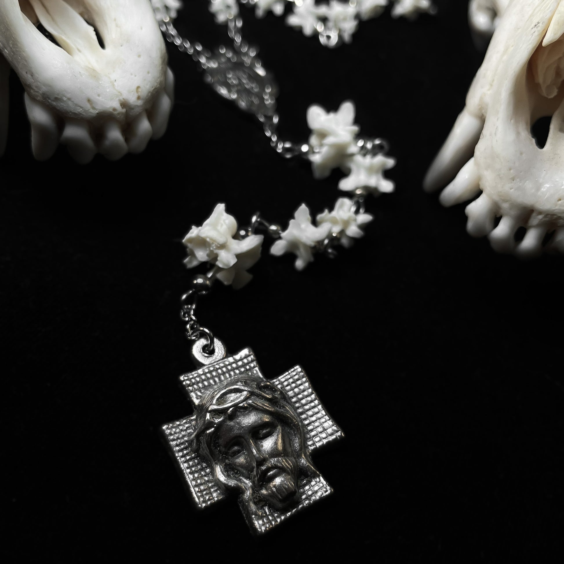 ✧ The signature bone rosary, made with real snake vertebrae bones, all stainless steel wire, and vintage rosary centerpiece and cross charm featuring the image of Jesus.