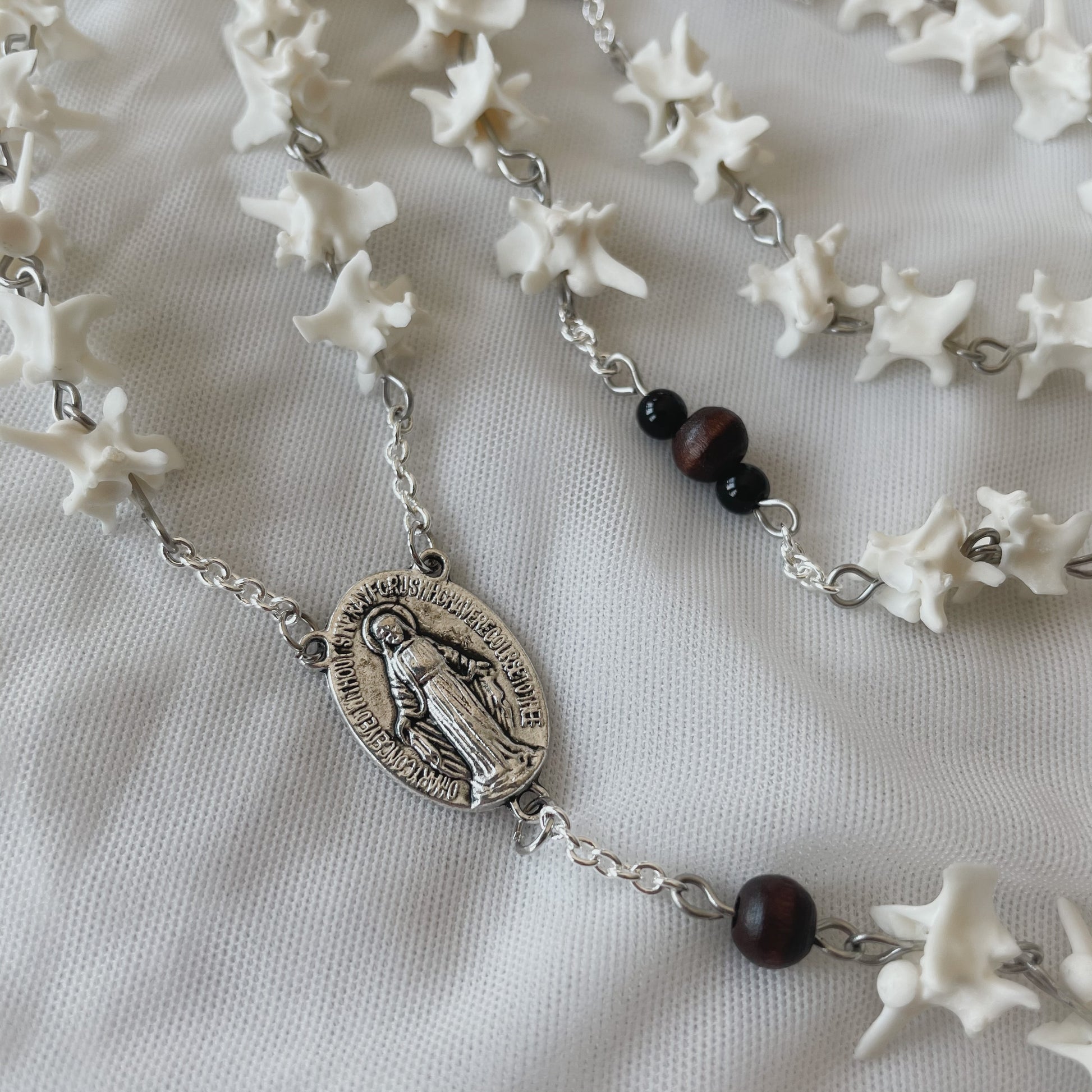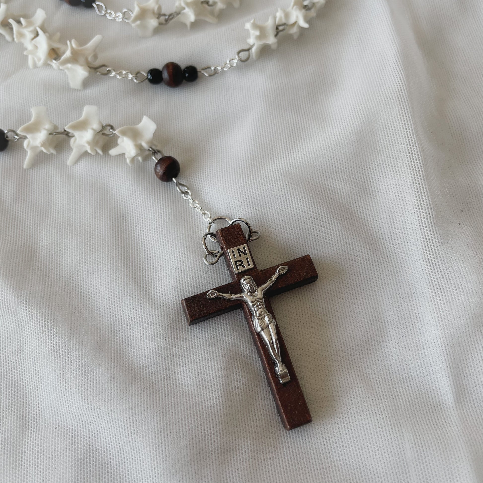 ✧ Rosary style necklace made of real rattlesnake vertebrae, wooden and black separator beads, and wooden crucifix pendant.
