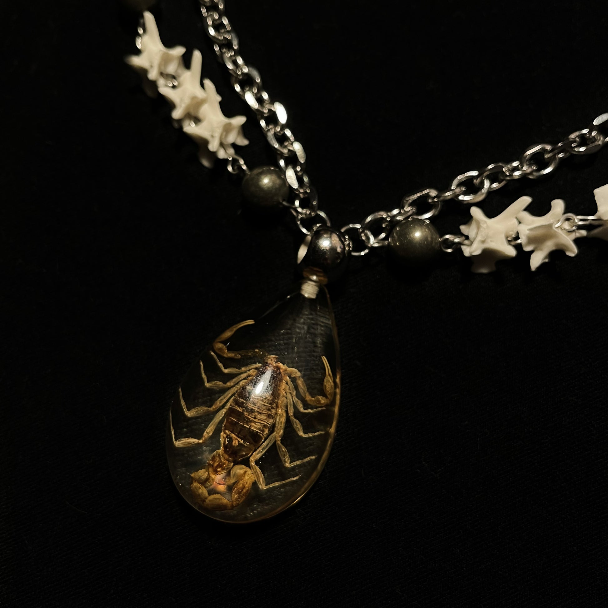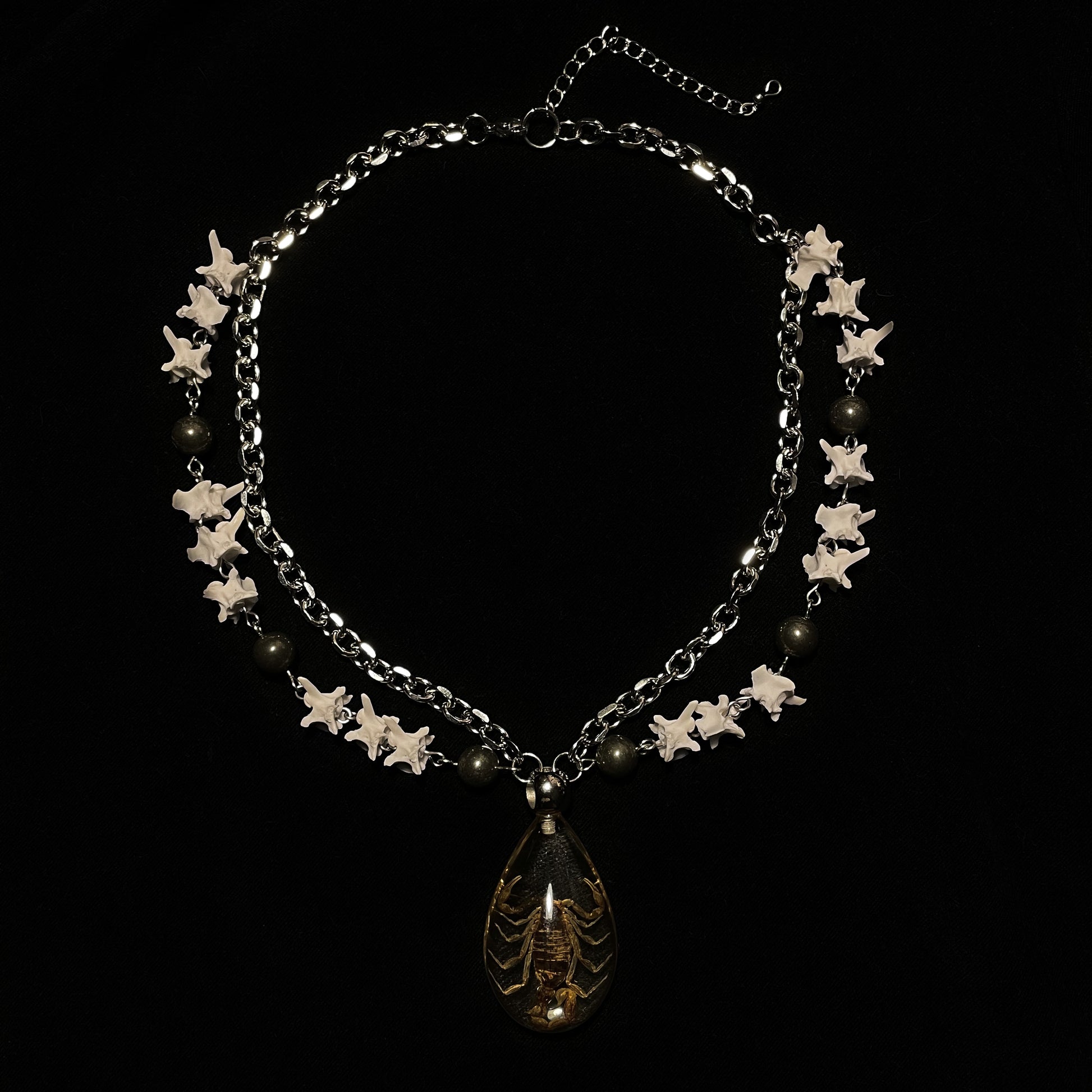 ✧ Choker/short necklace featuring real rattlesnake vertebrae segments separated by pyrite beads, layered with chain and preserved scorpion in clear resin pendant.
