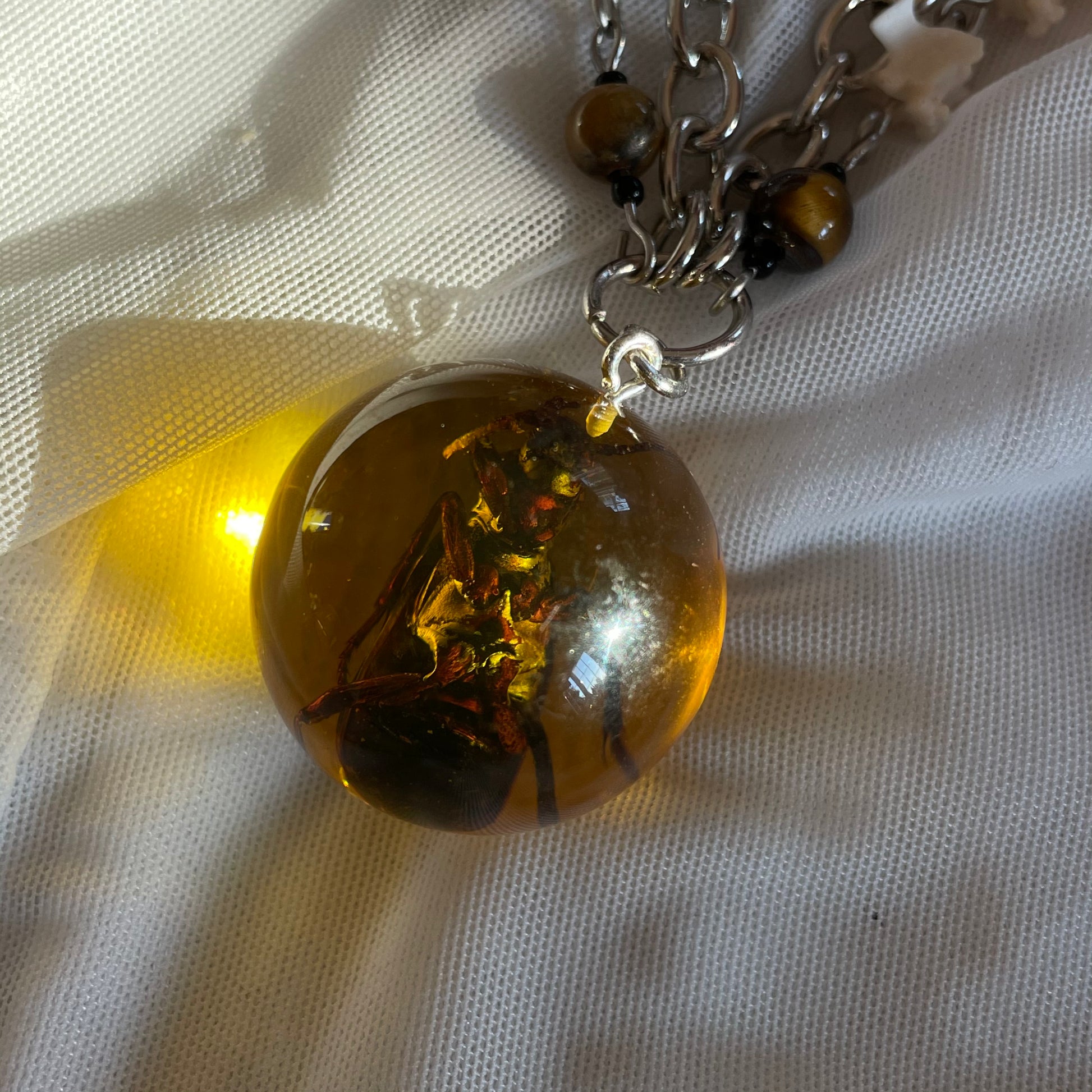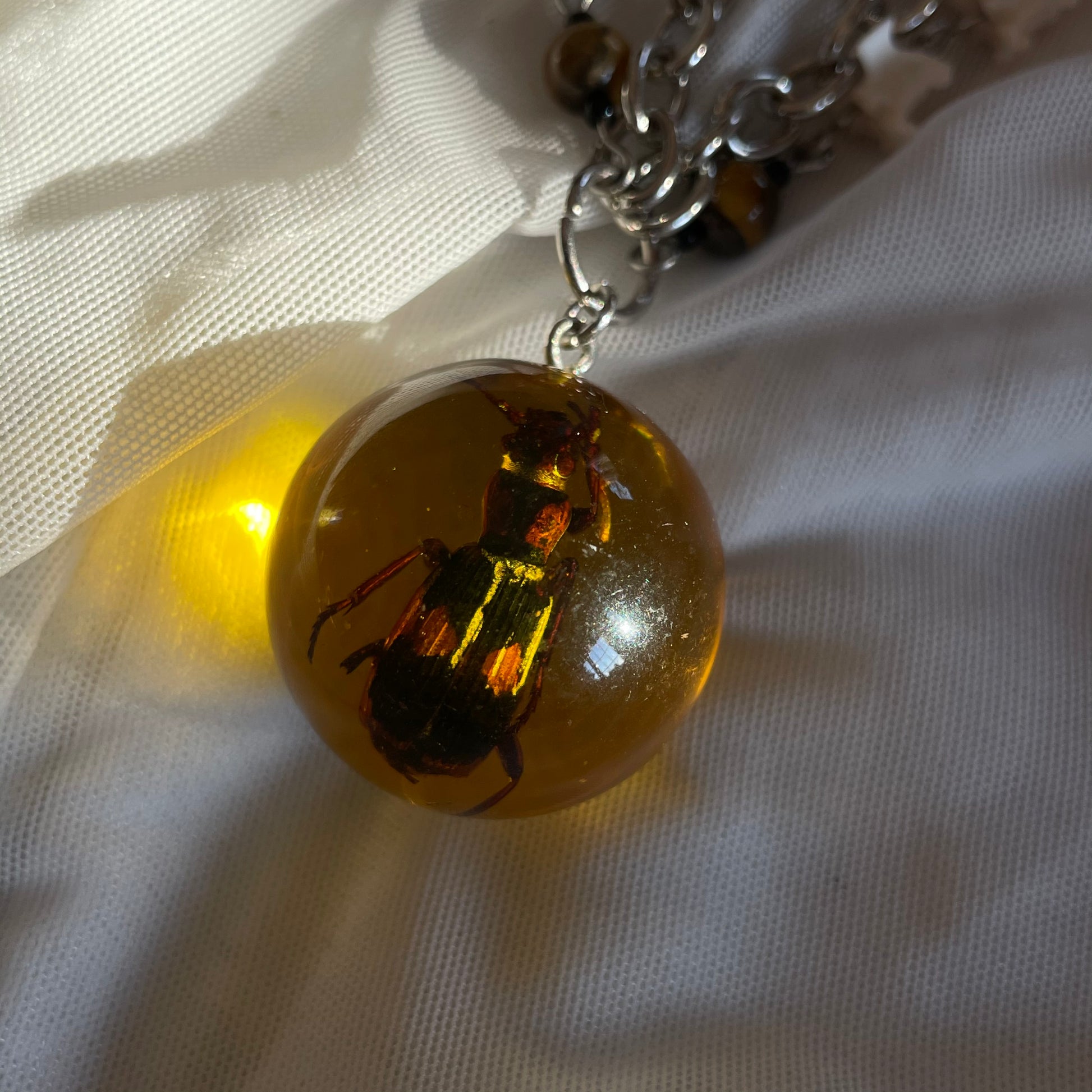 ✧ Second iteration of the buggybone choker. Chain and bone choker featuring tiger's eye beads, real rattlesnake vertebrae bones, and beetle encased in golden yellow resin orb.