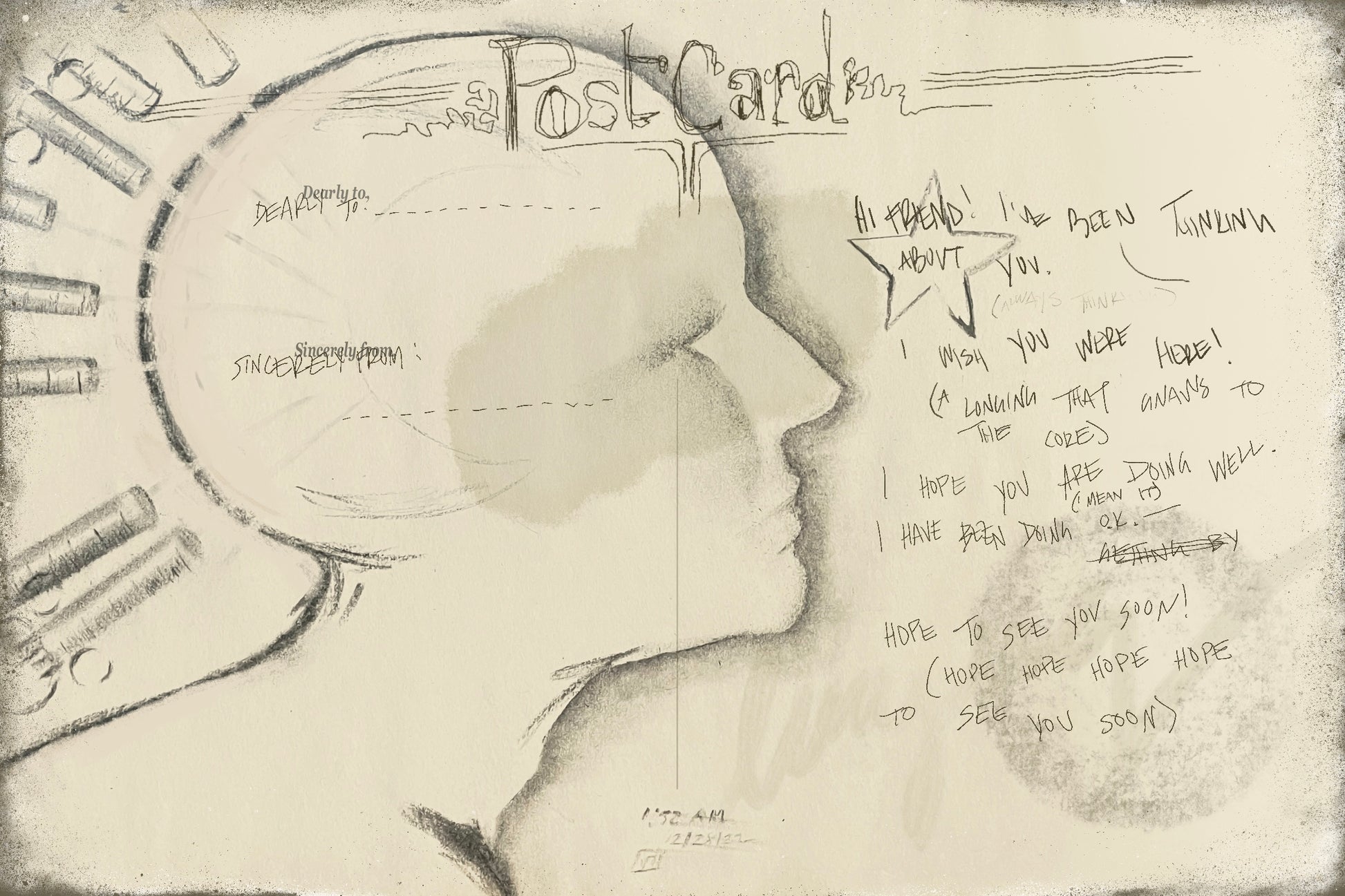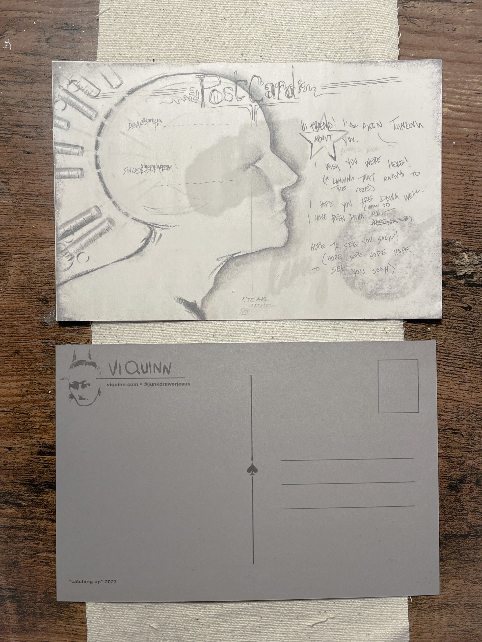 4x6 postcard of “catching up” charcoal drawing on soft finish matte cardstock
