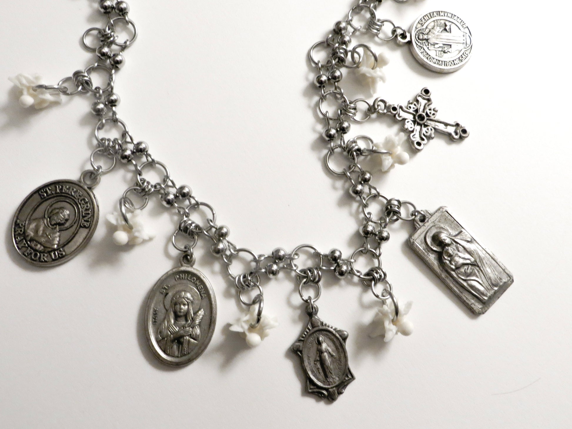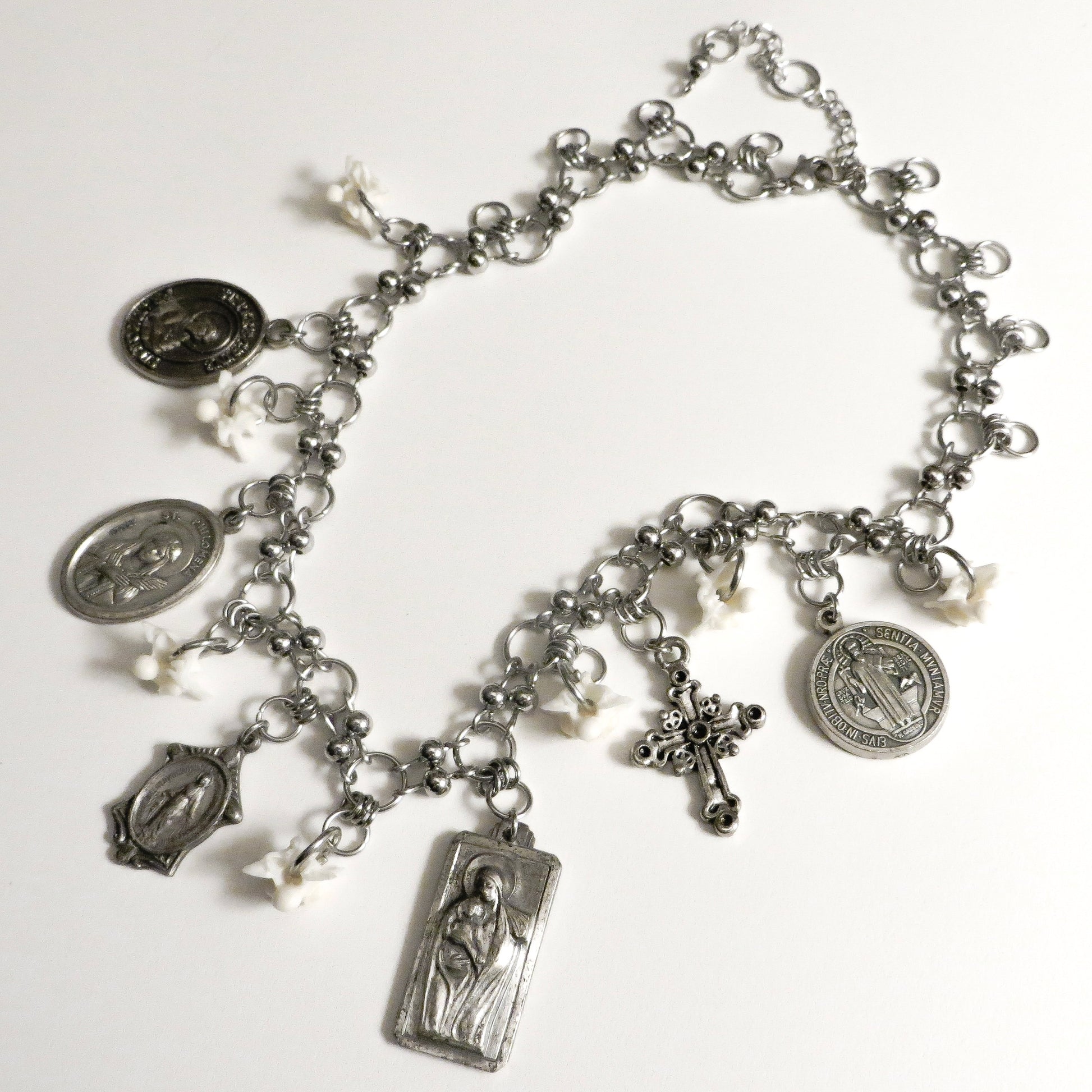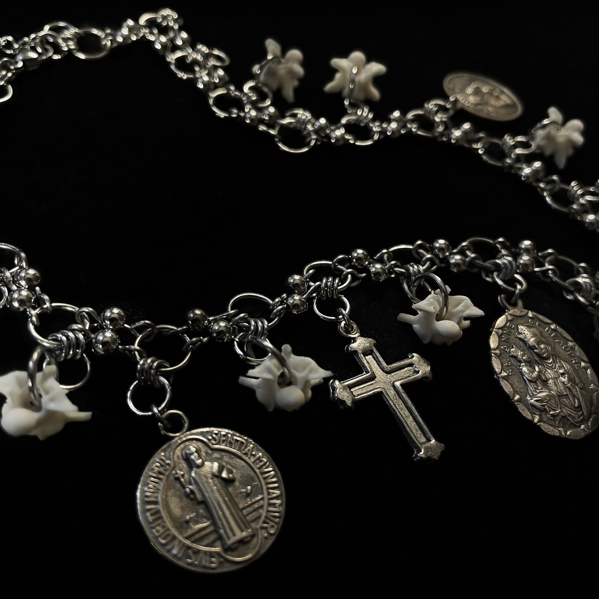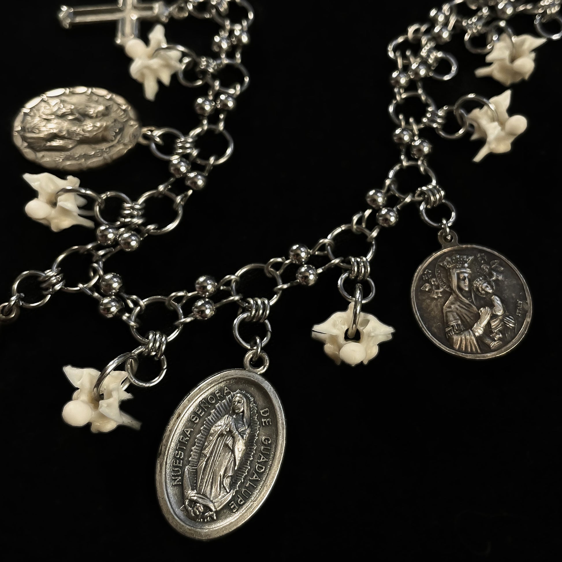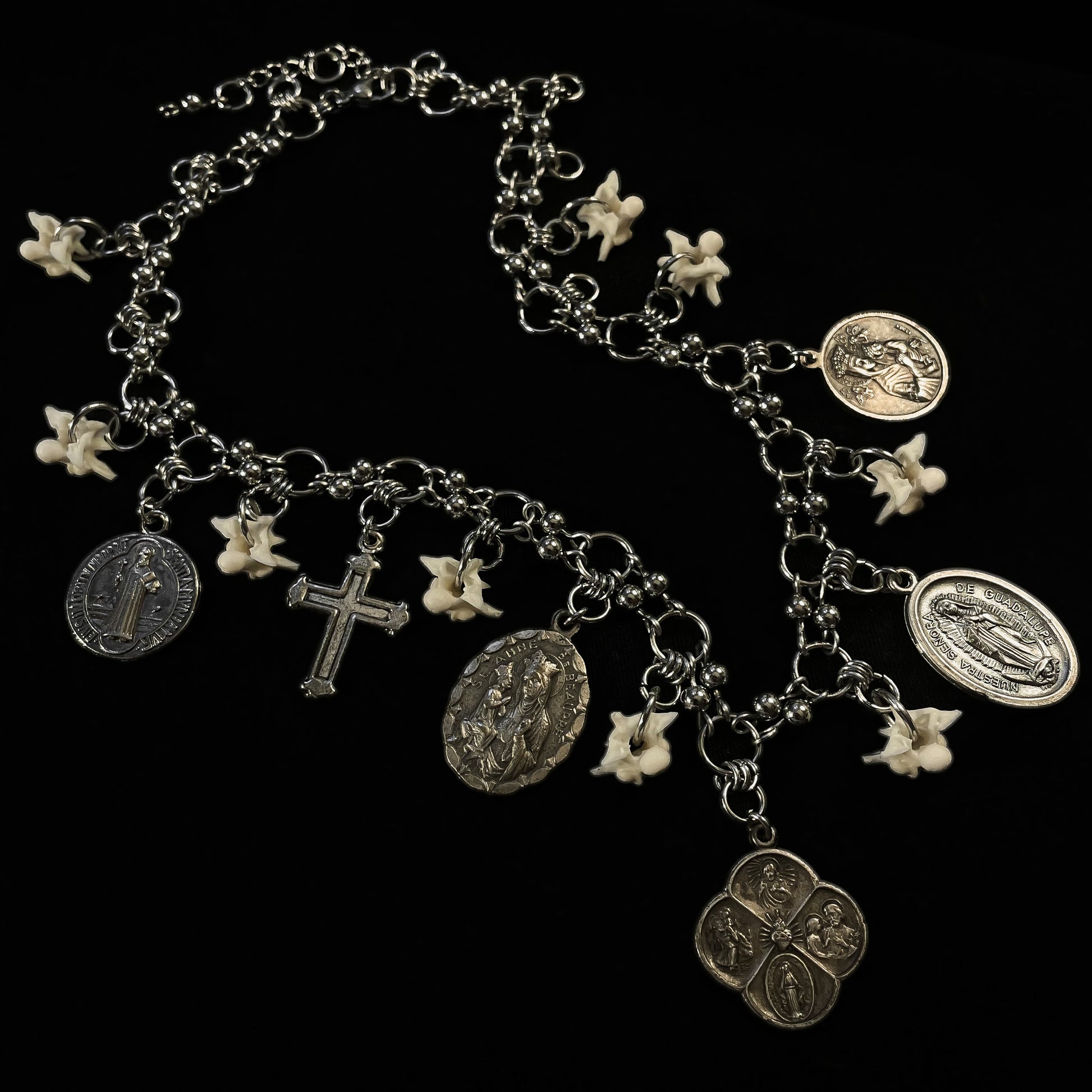 ✧ One of a kind stainless steel choker including vintage religious charms and real snake vertebrae bones. Photos shown are examples of the Conclave choker—the piece you receive will have the same design, but with varying charms.