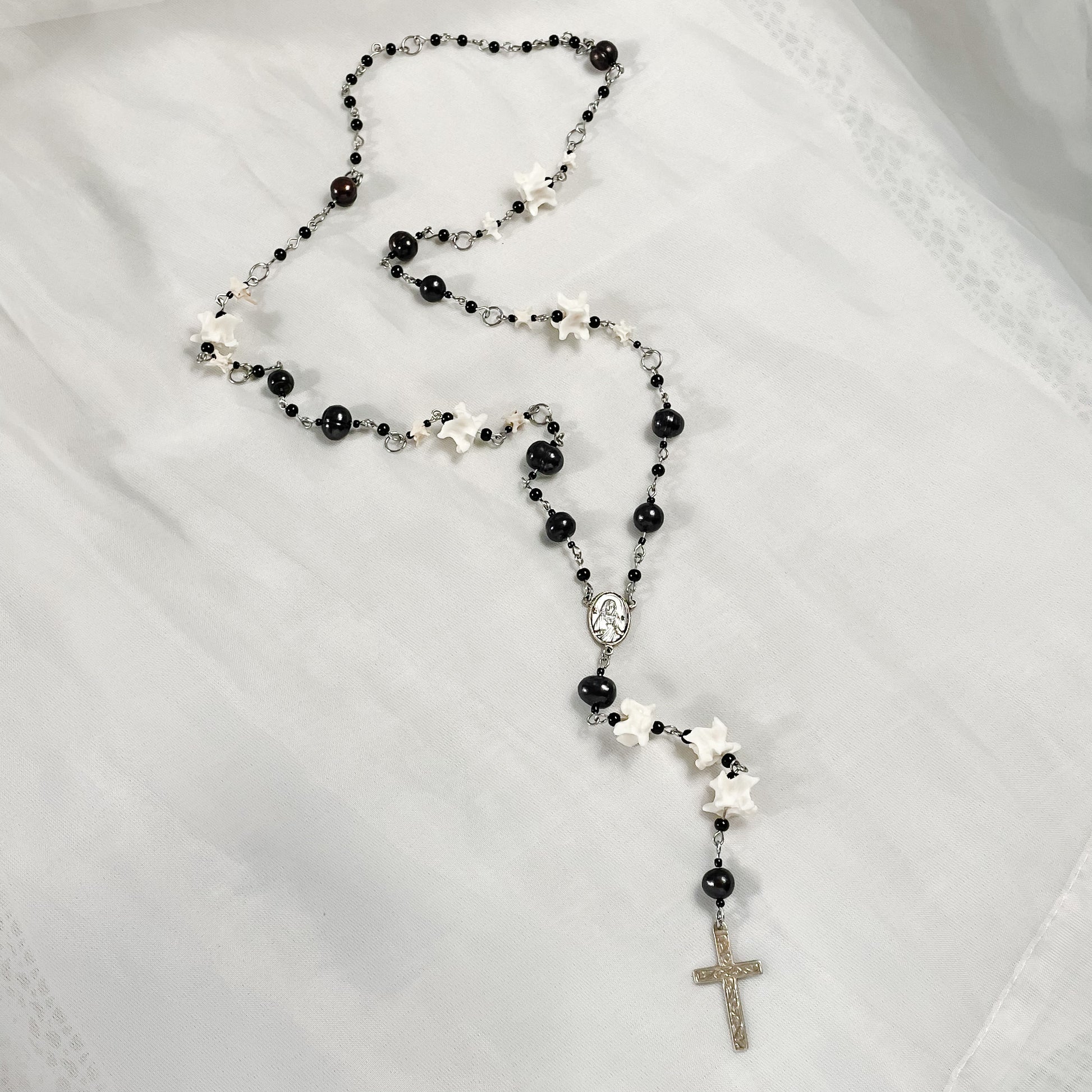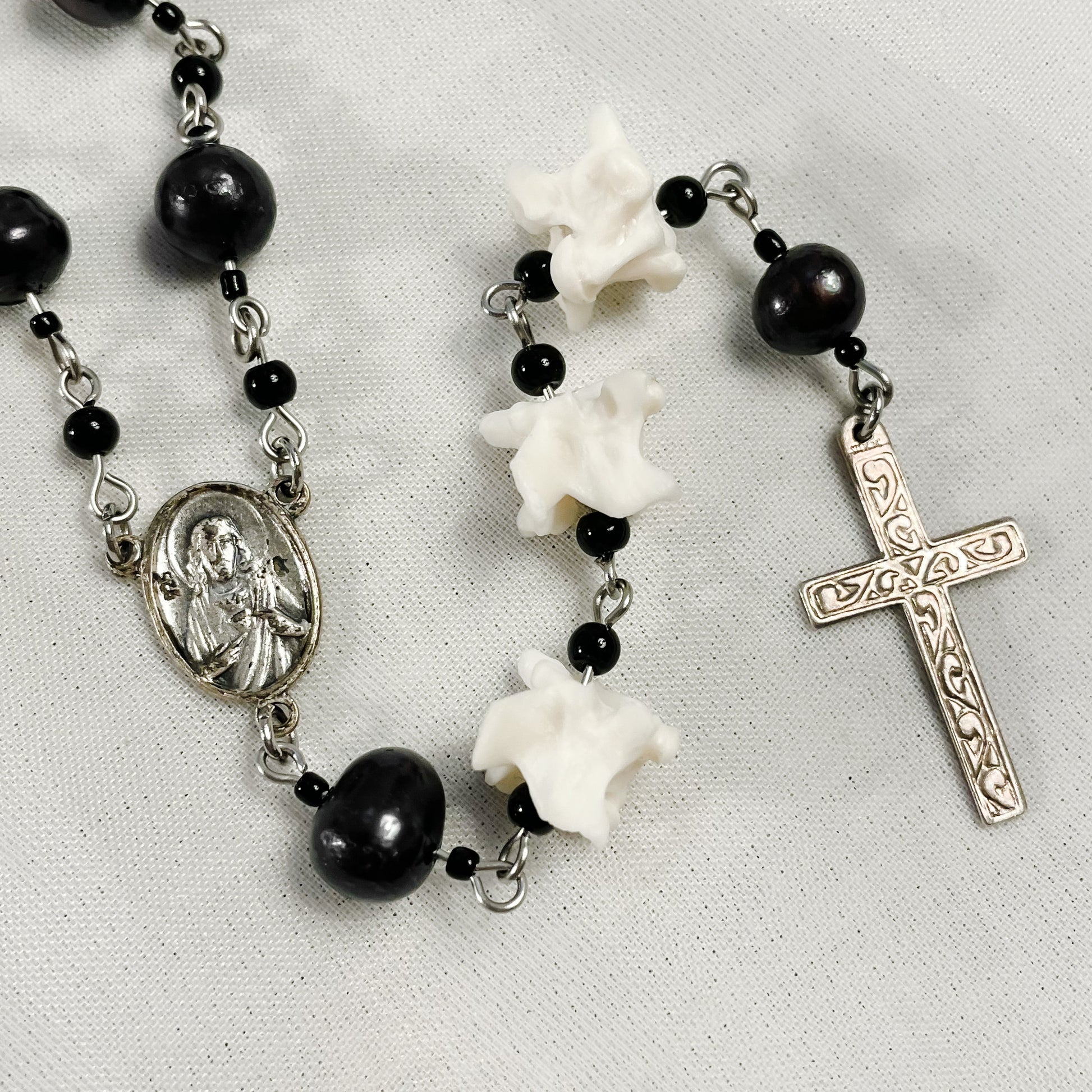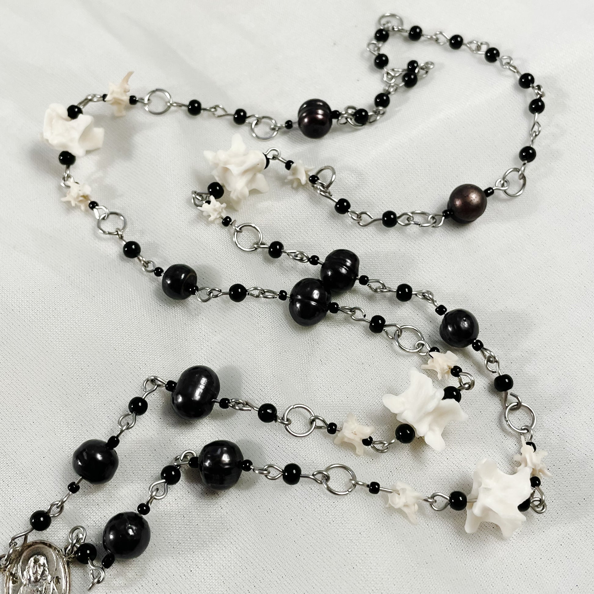 ✧ Rosary style necklace made of real dark freshwater pearls, black beads, real snake vertebrae bones, and vintage centerpiece and cross