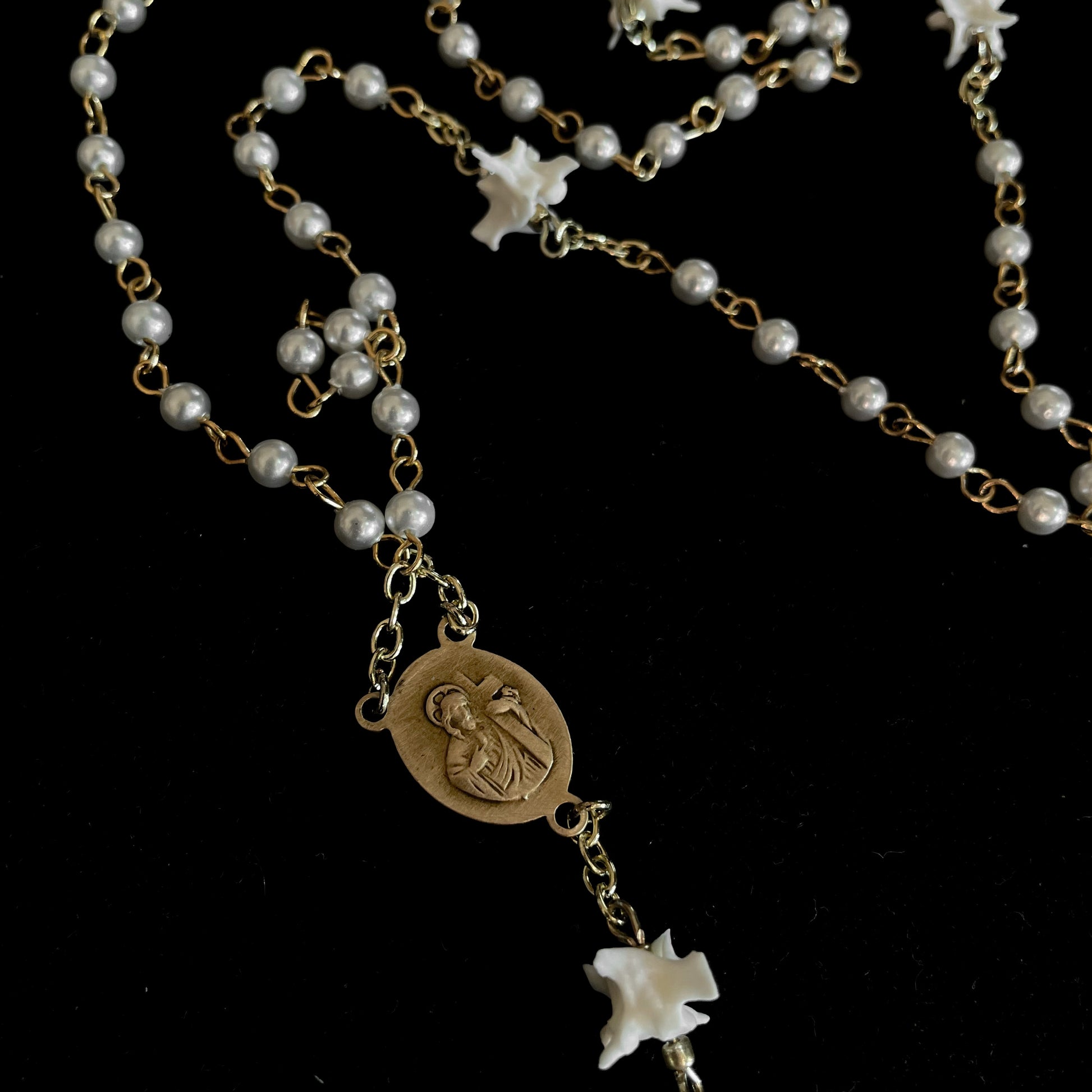 ✧ Rosary made up of faux pearl beads on gold colored wire, with real rattlesnake vertebrae accent, vintage centerpiece, and cross pendant.