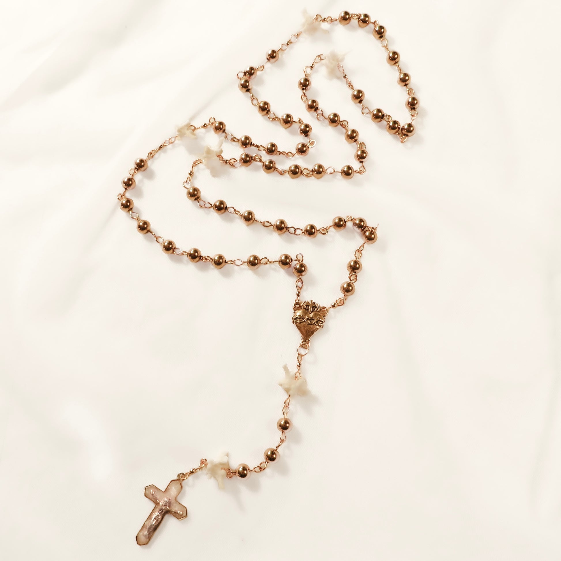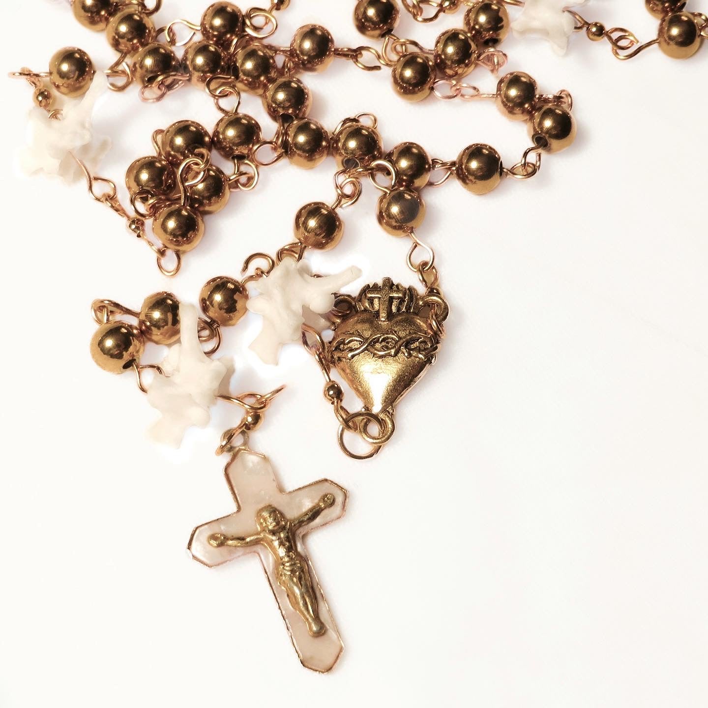 ⋆ Rosary made from real snake vertebrae, gold plated wire, gold colored stainless steel beads, sacred heart centerpiece, and vintage crucifix pendant with real mother of pearl inlay.