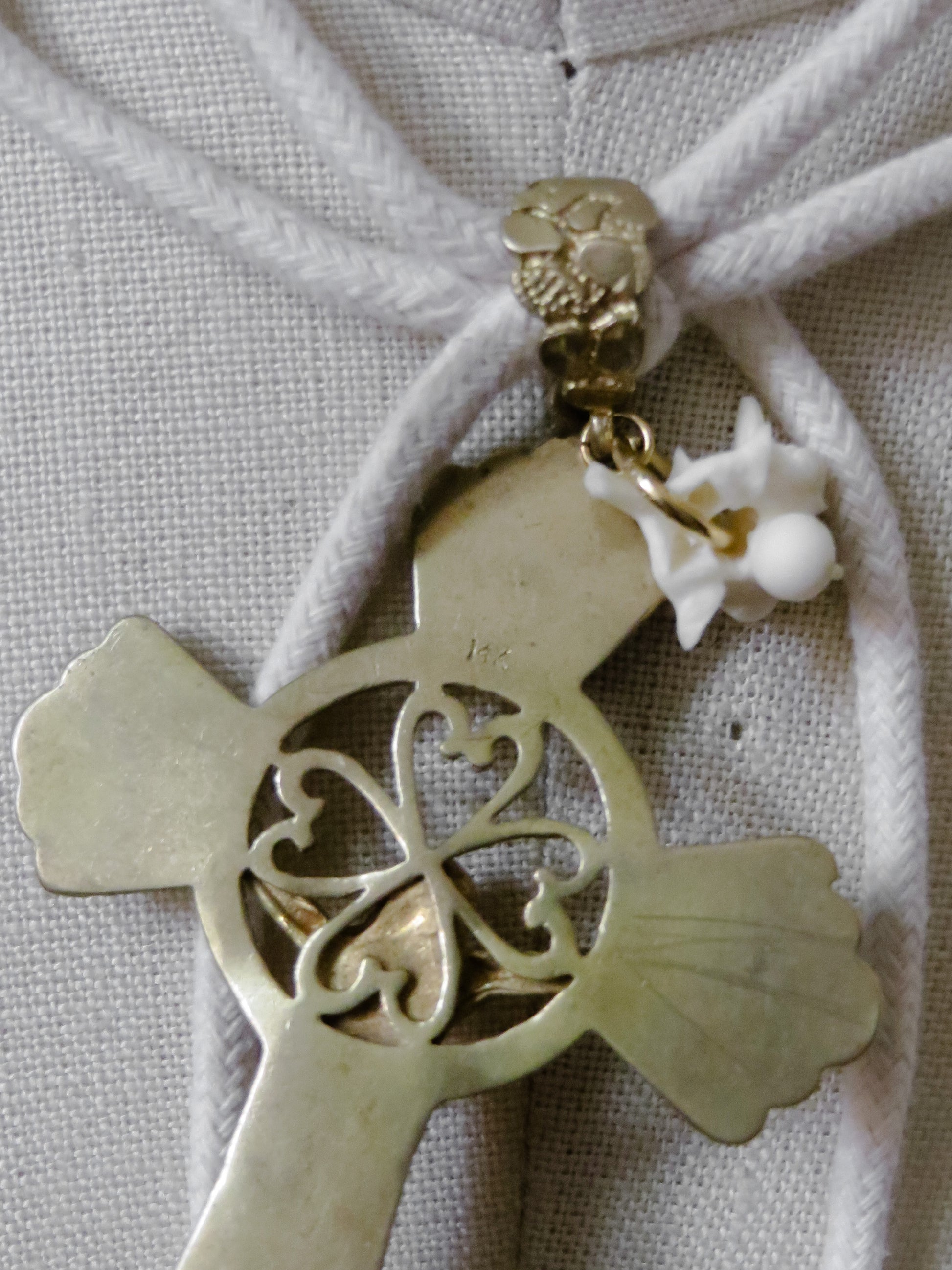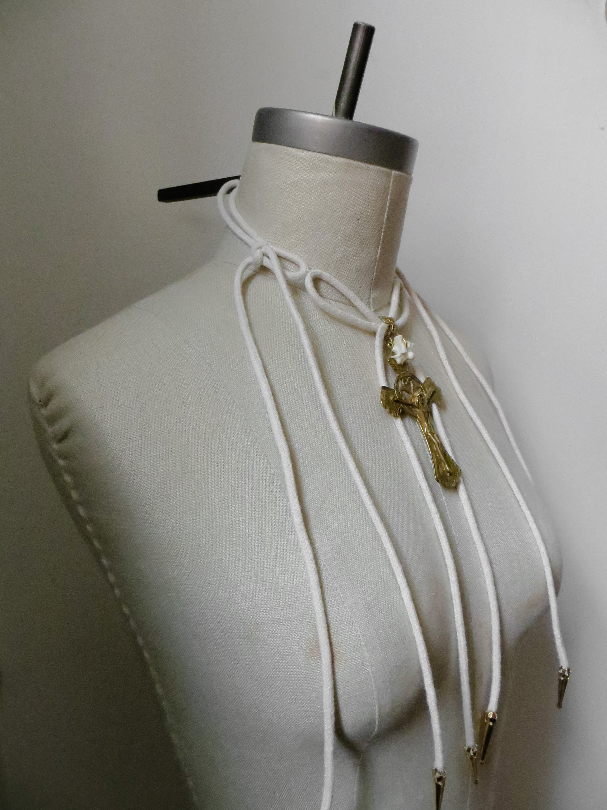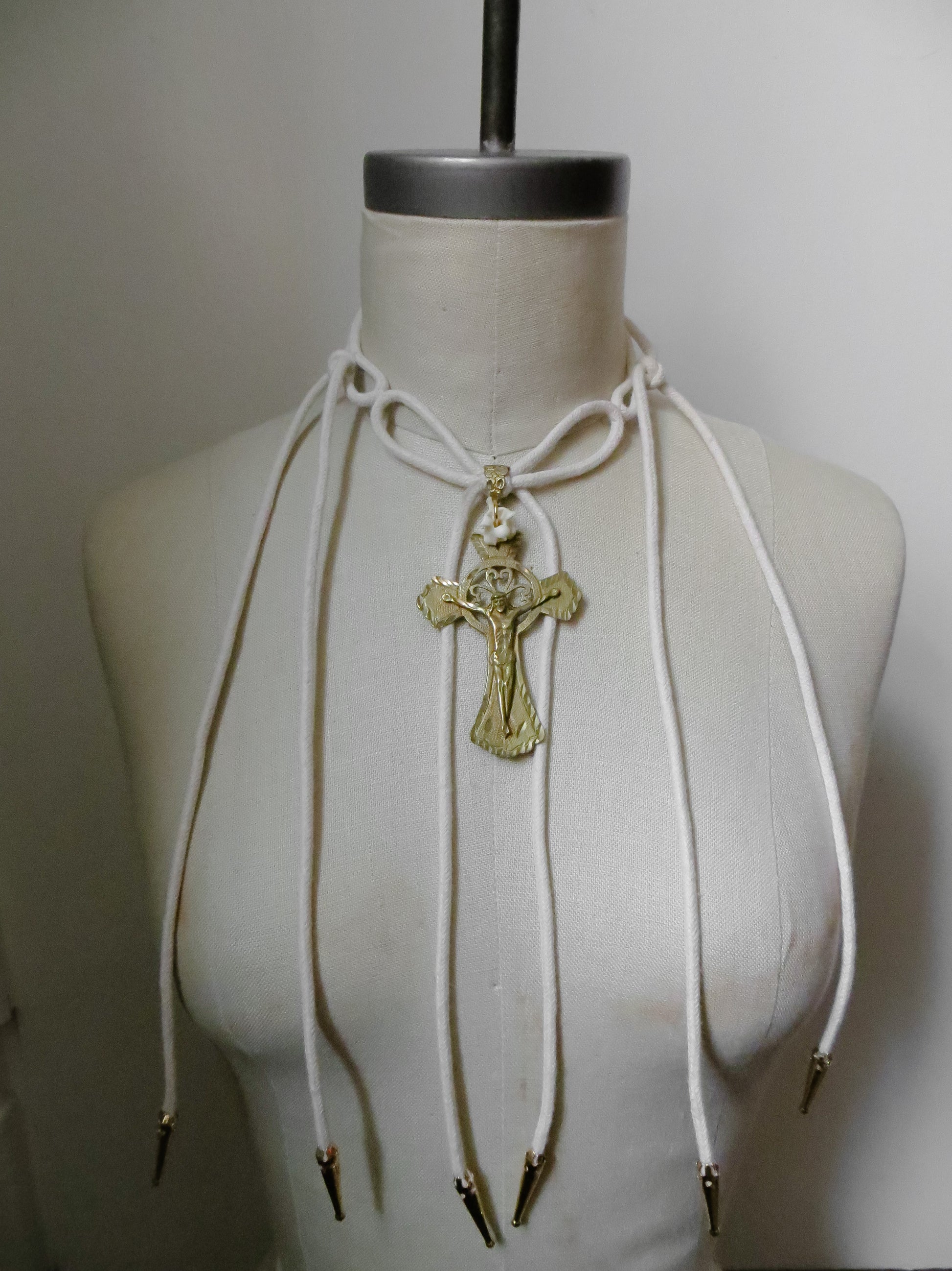 ⟡ A linen cord necklace comprised of three connected bows with gold bolo tie tips on the ends, real snake bone charm, and cross marked 14k gold pendant measuring approx. 3.5”