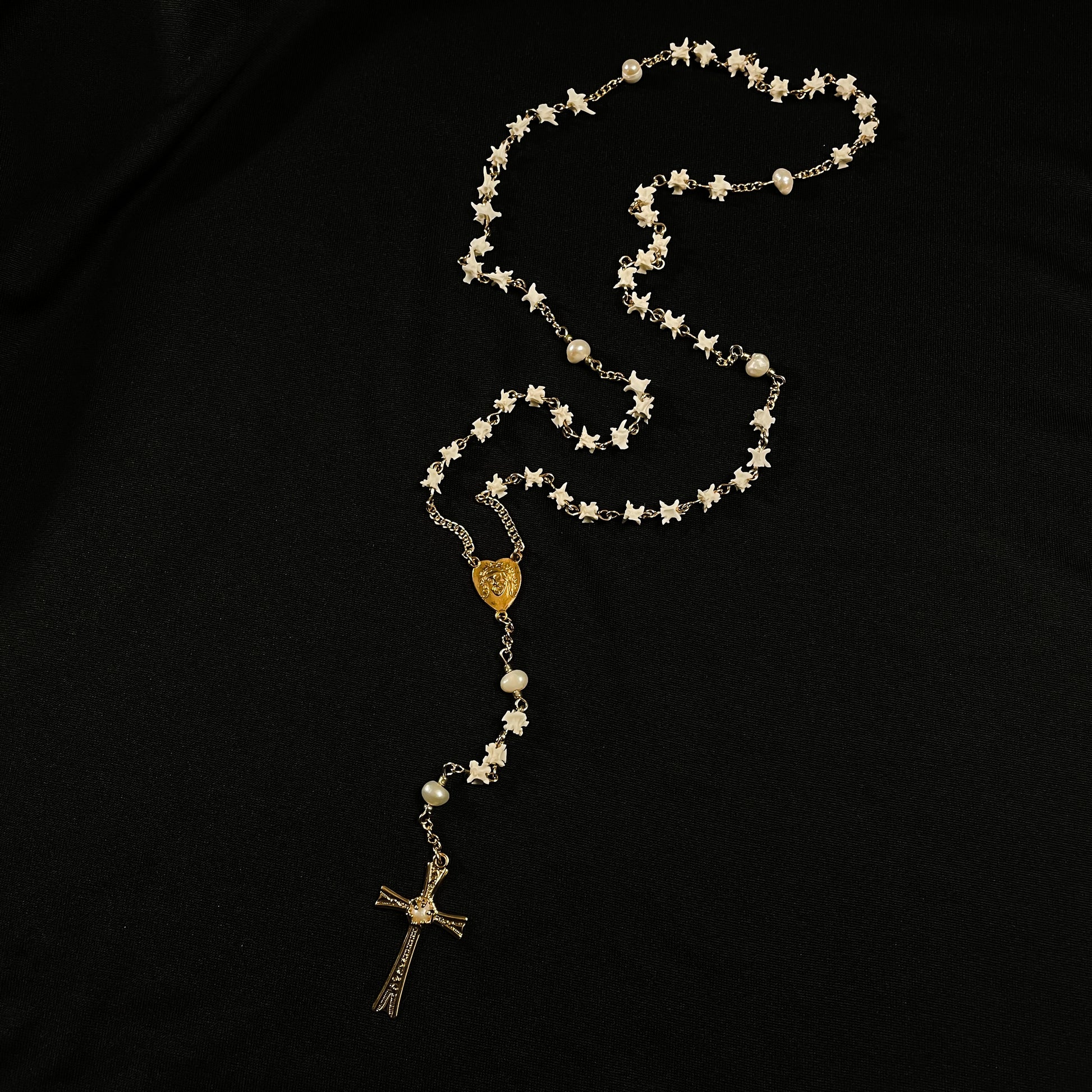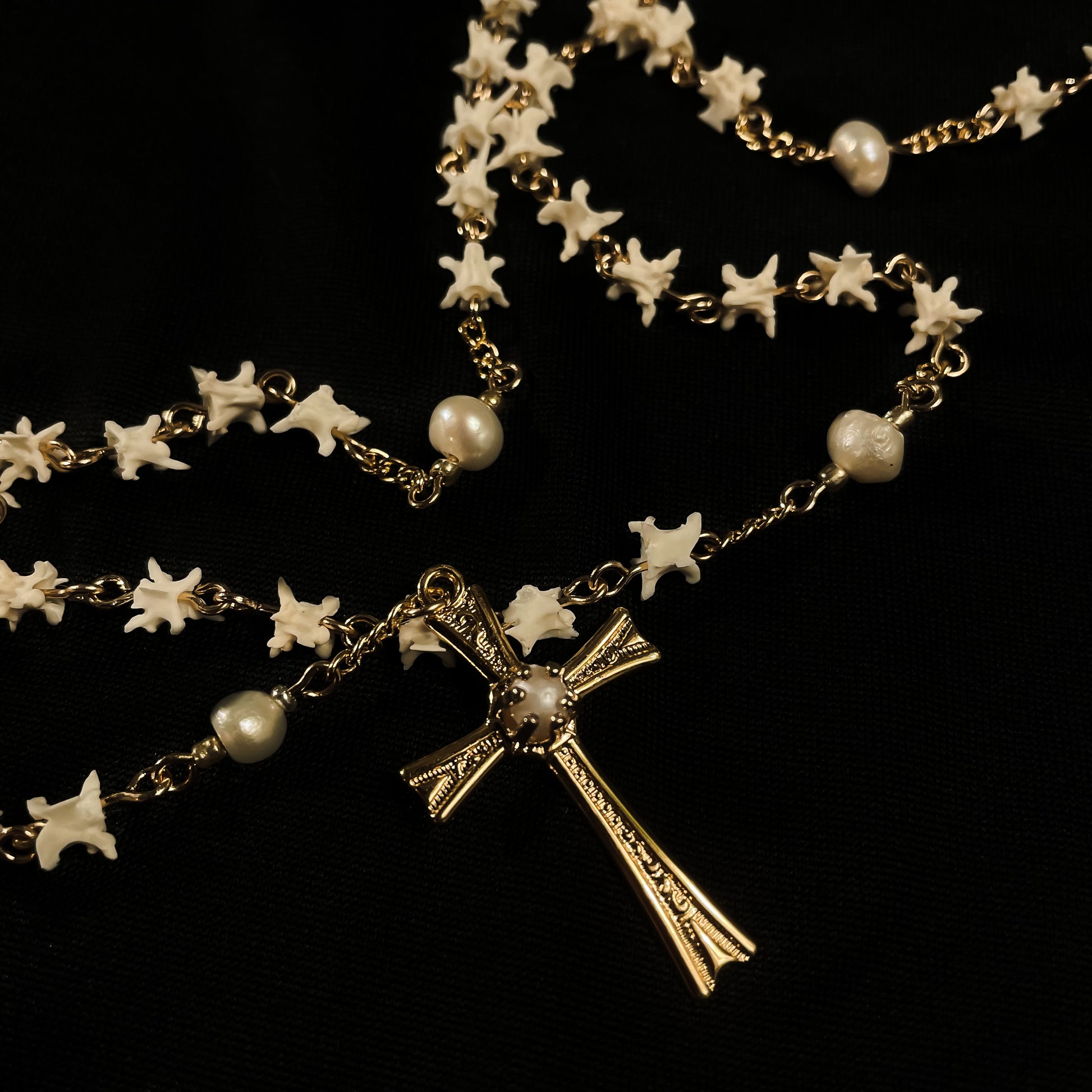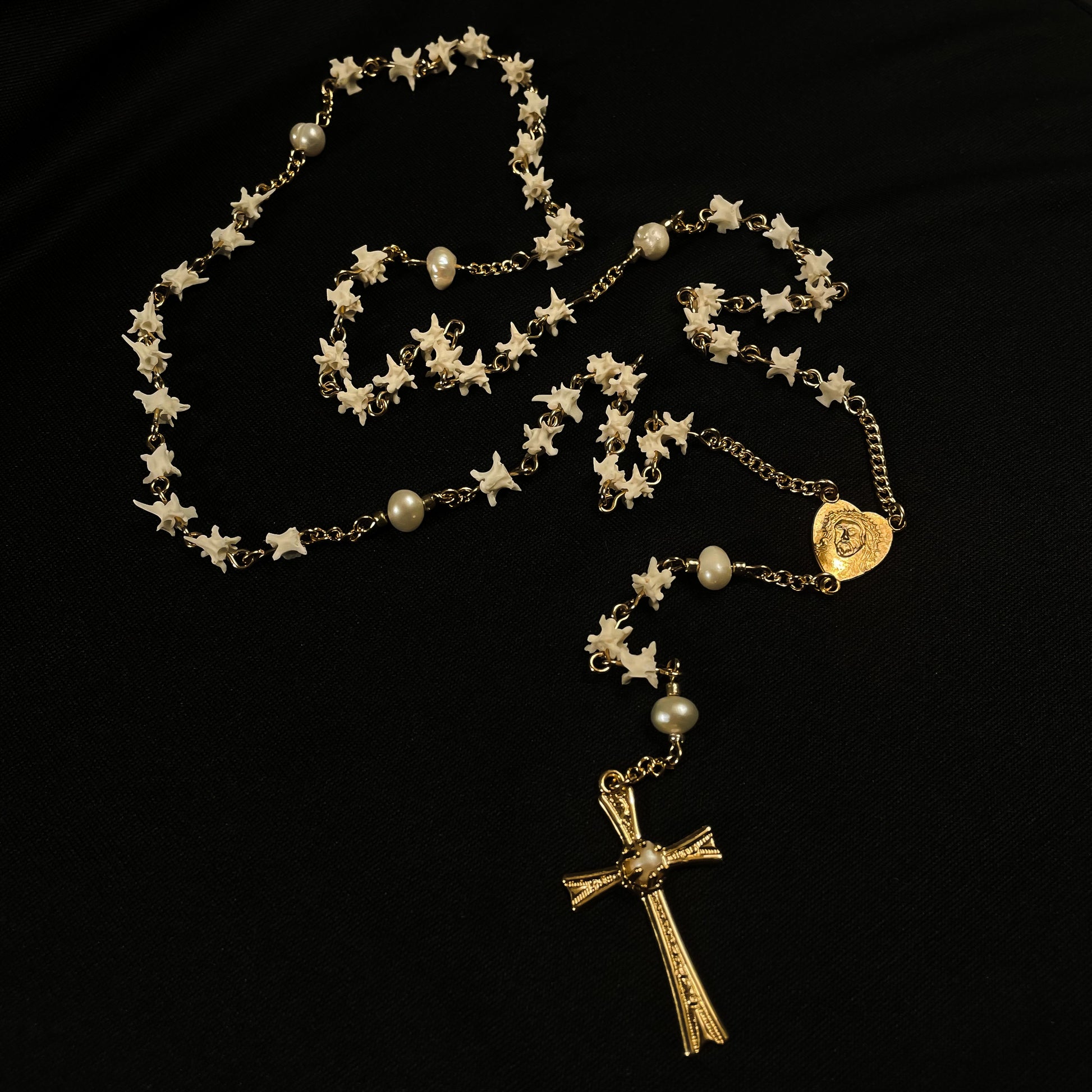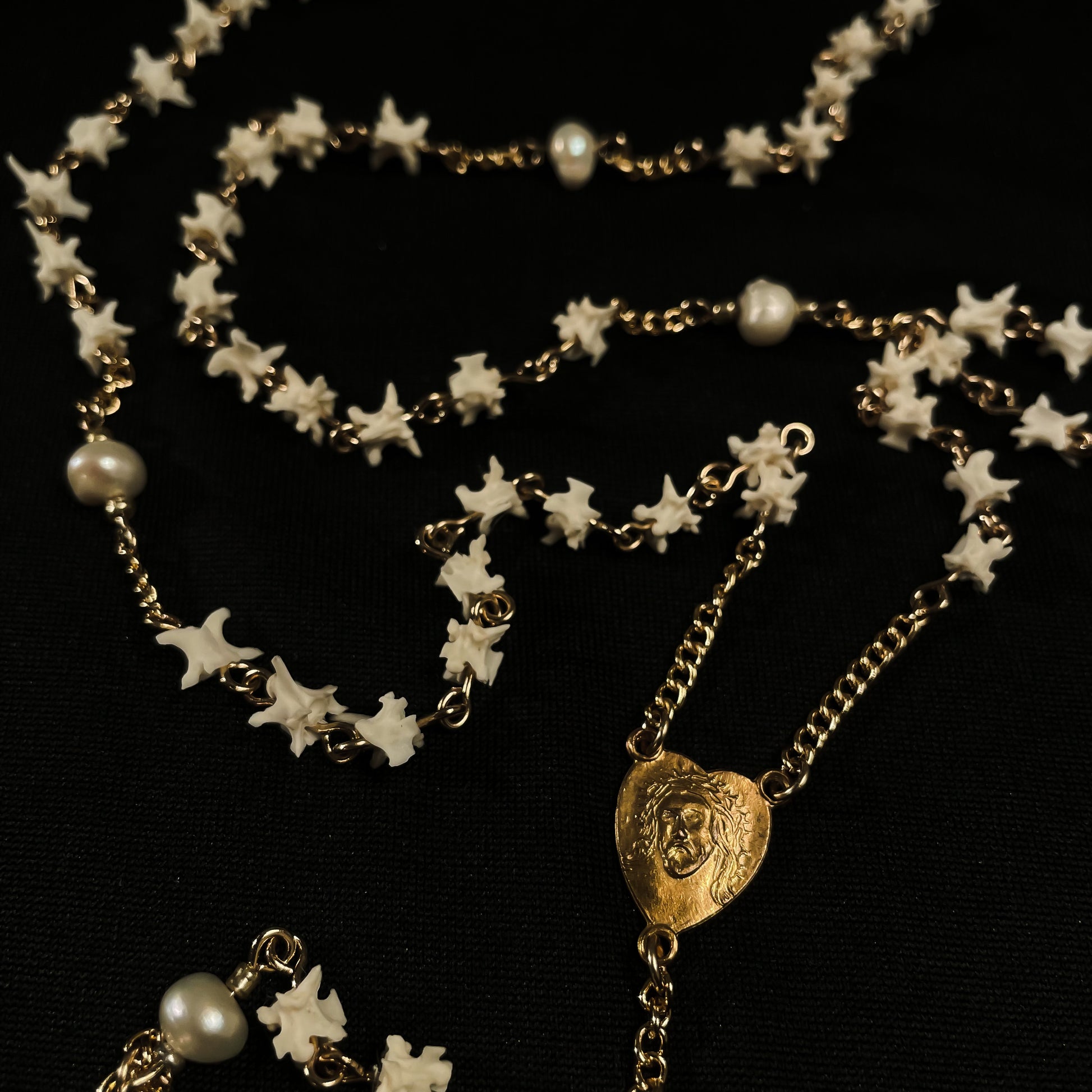 ✧ Bone rosary made of real rattlesnake vertebrae bones, freshwater pearl seperator beads, vintage gold colored heart shaped centerpiece with an image of jesus, and vintage 14KGE gold cross with freshwater pearl. All gold wiring and chain is real gold filled.