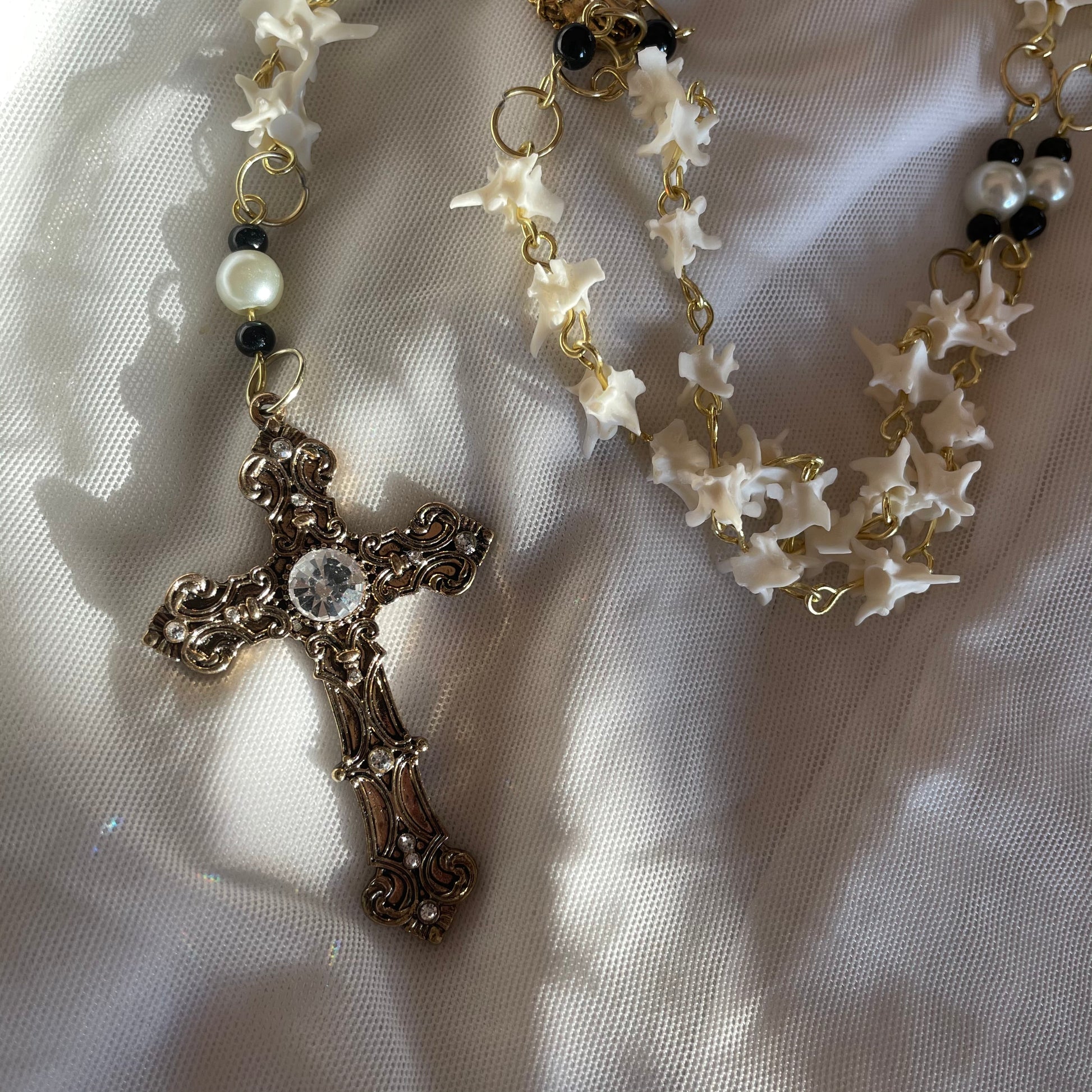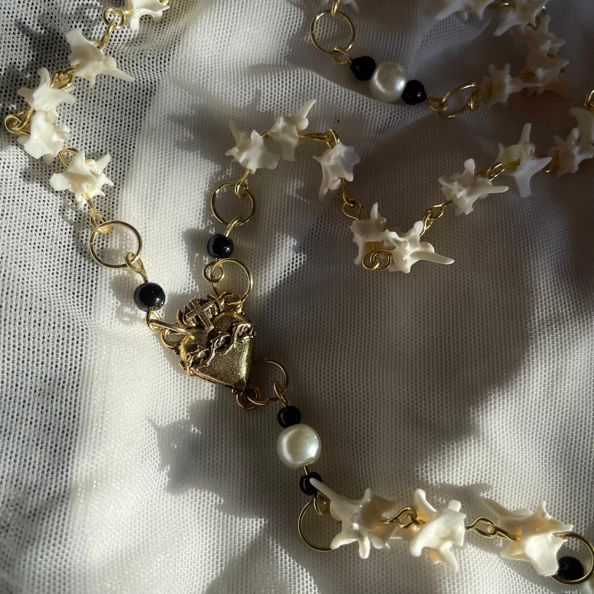 ✧ Rosary style necklace made of real rattlesnake vertebrae, faux pearl and black separator beads, and golden sacred heart connector, and gold cross pendant.