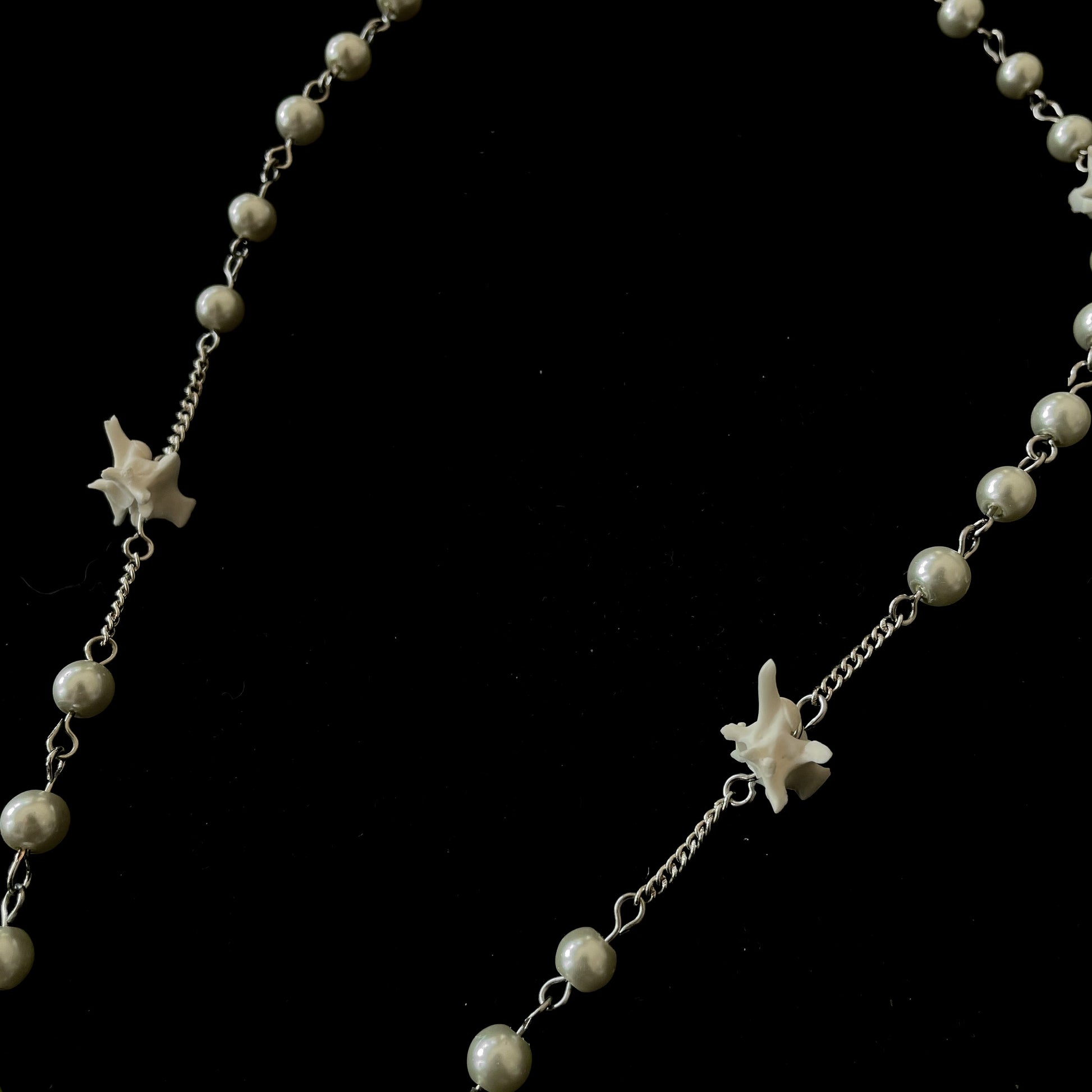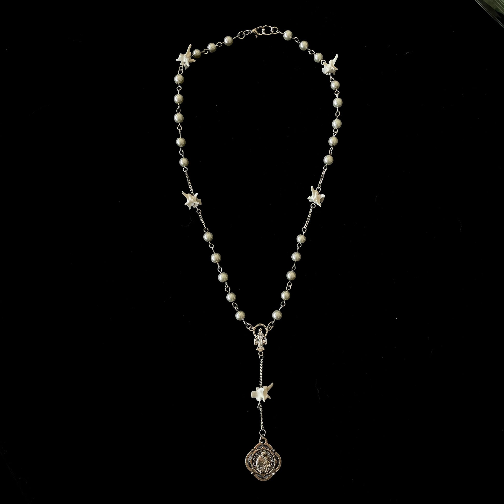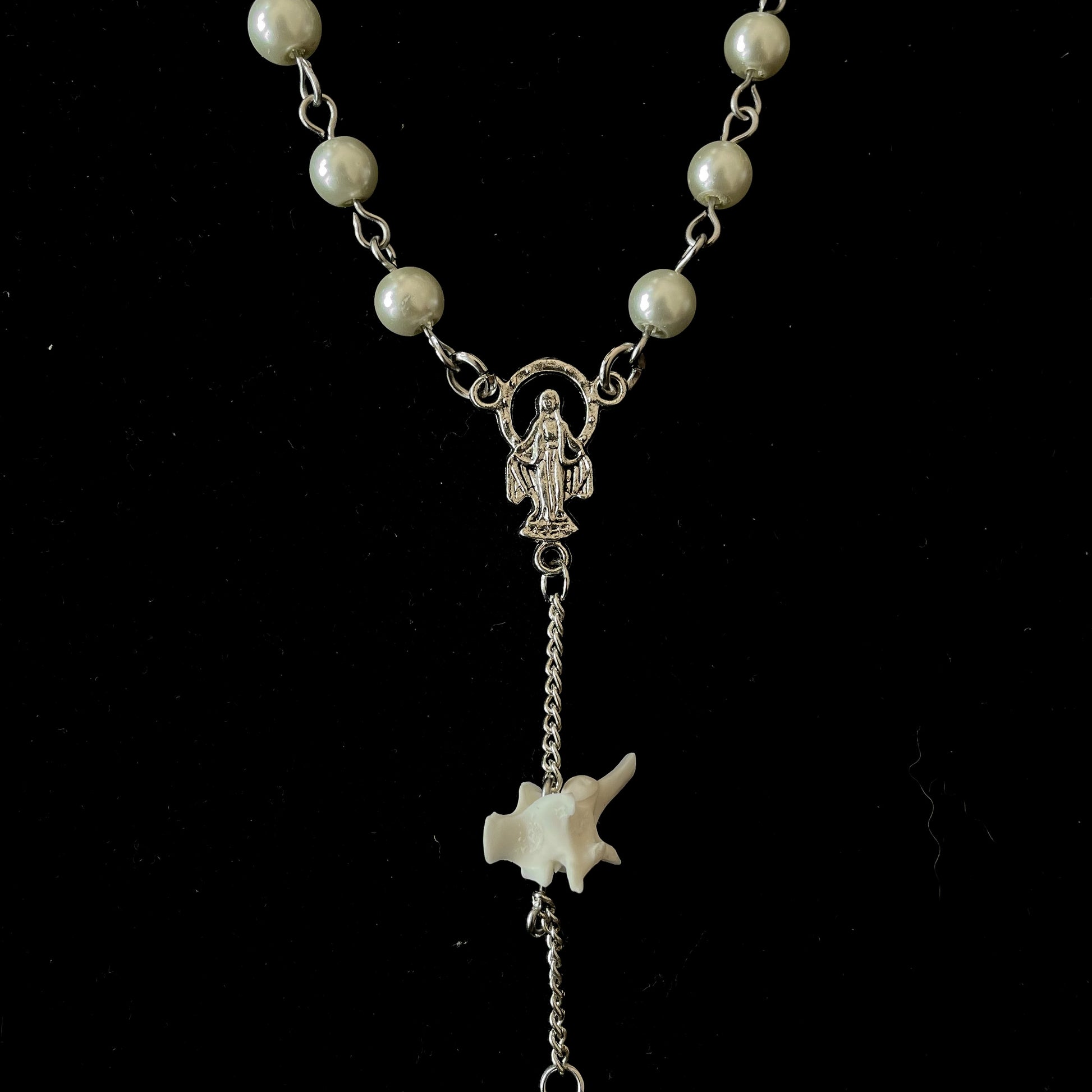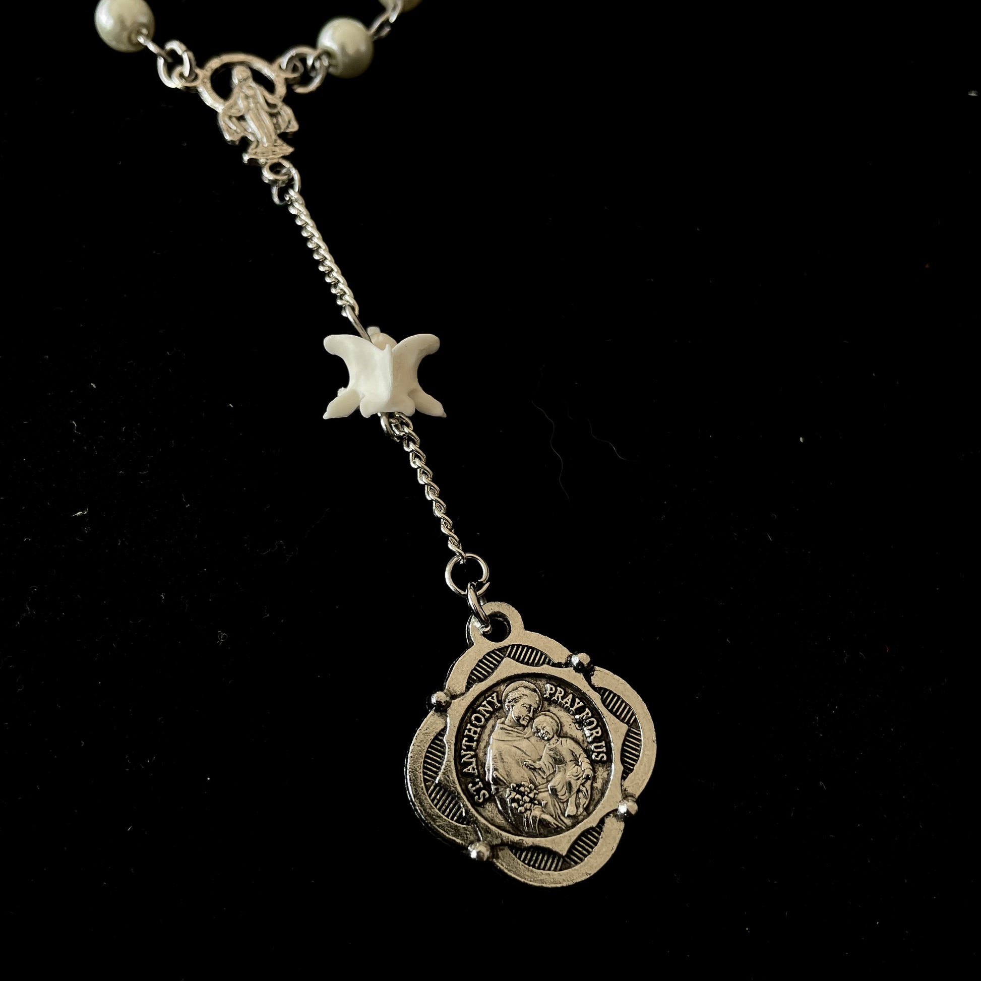✧ This necklace is half the length of a traditional rosary, meaning it has half the amount of beads. Made of real rattlesnake vertebrae, faux pearl beads, and vintage St. Anthony charm