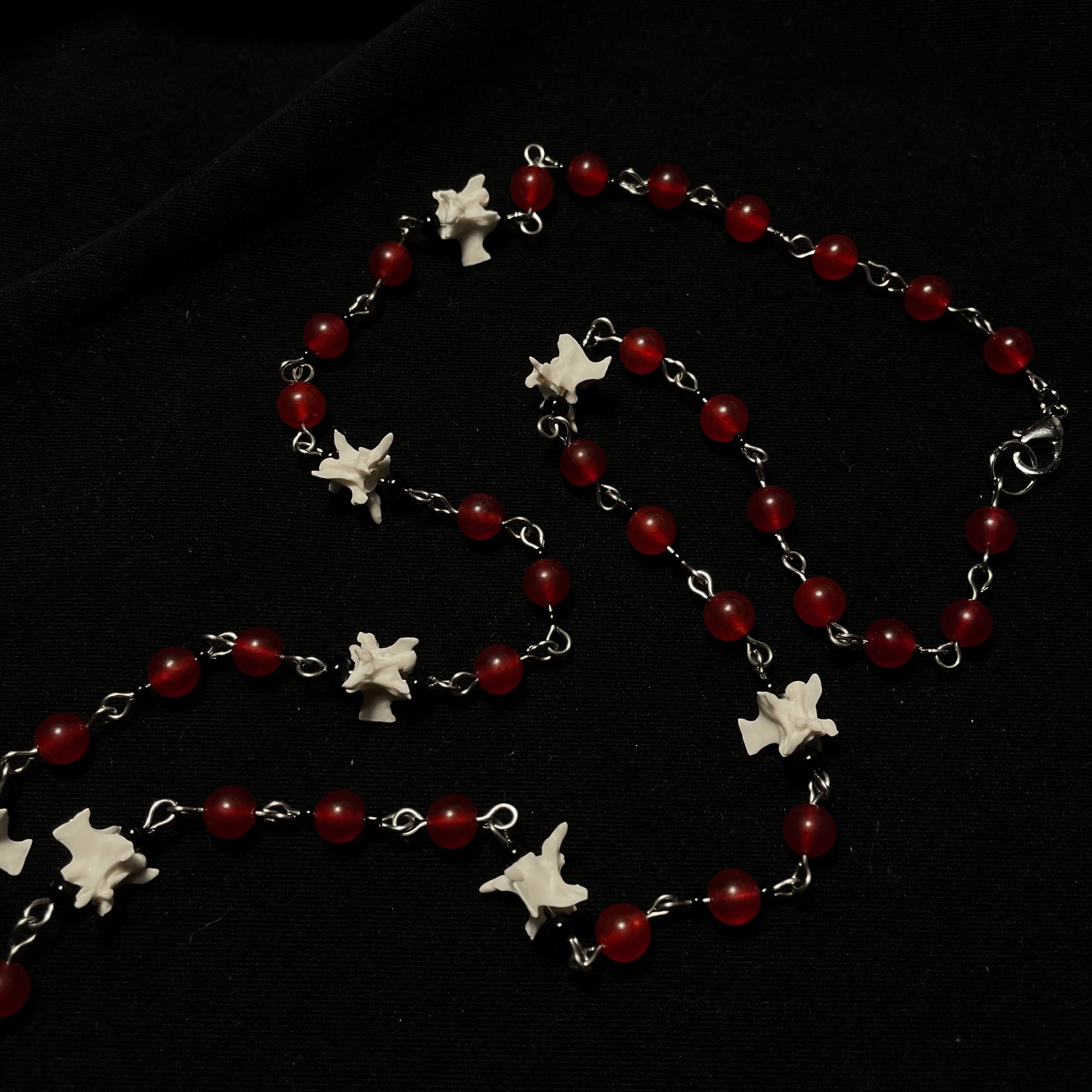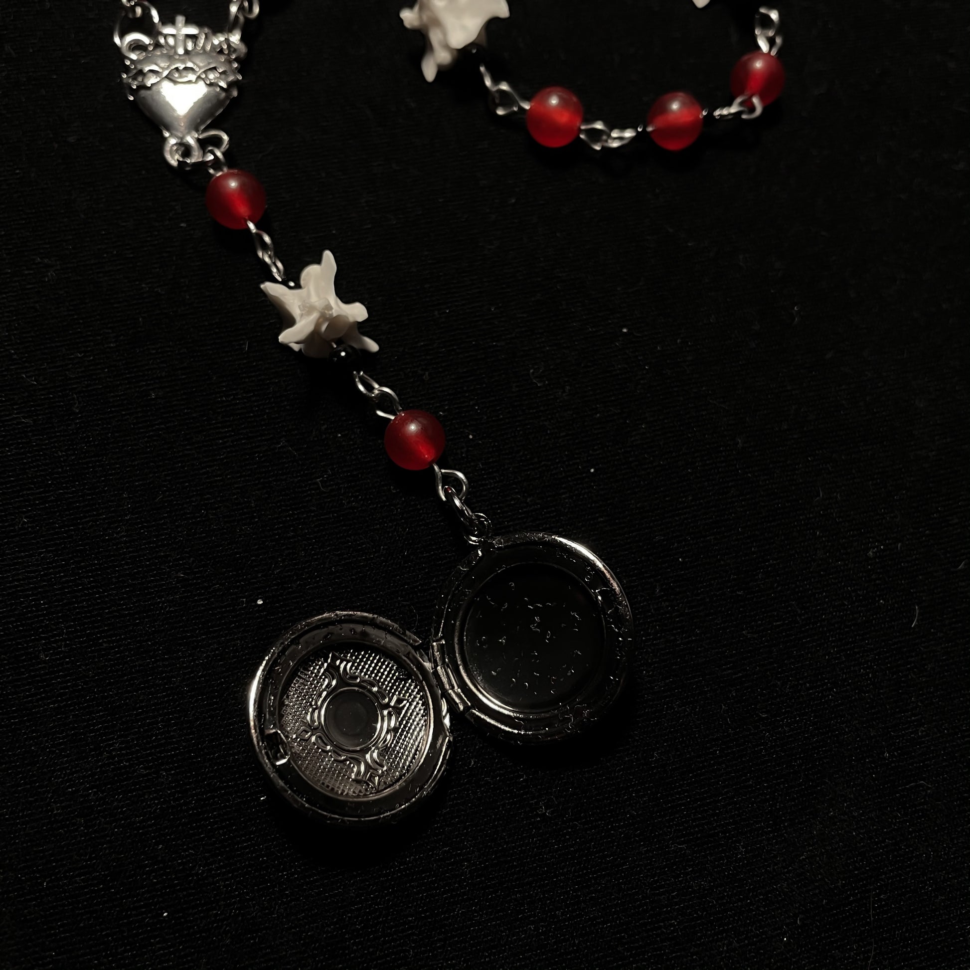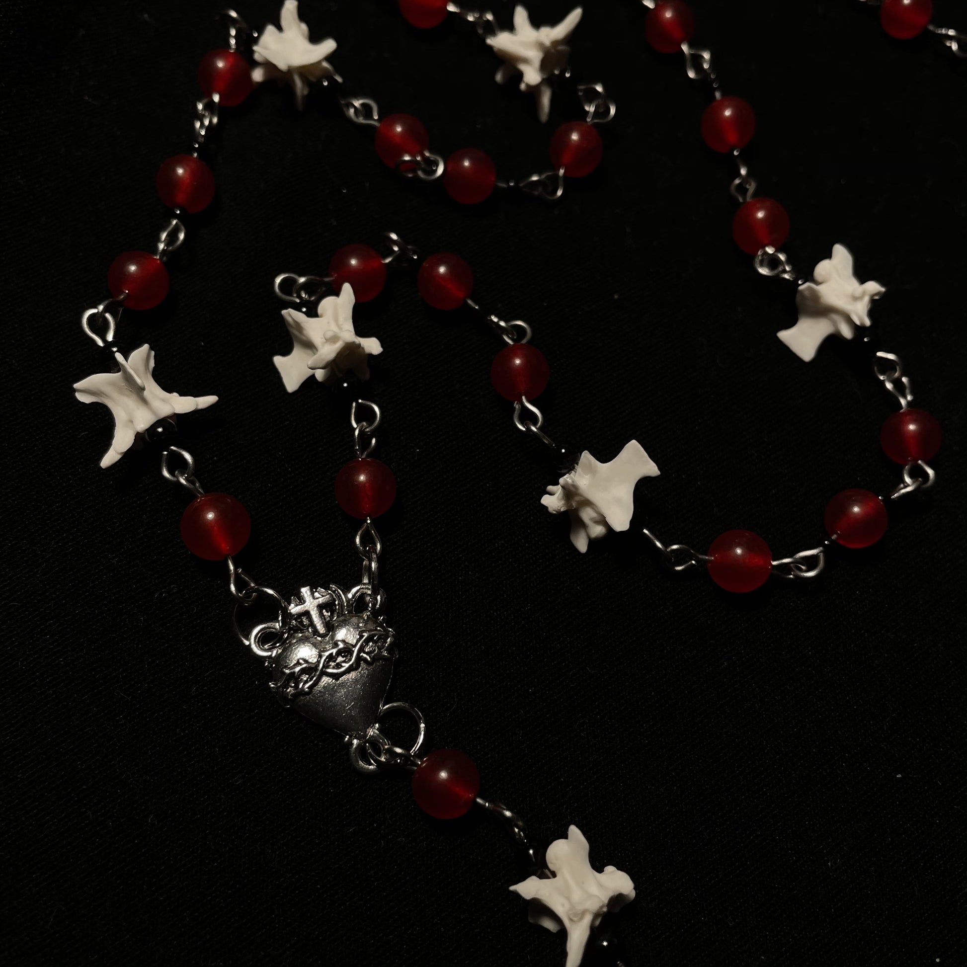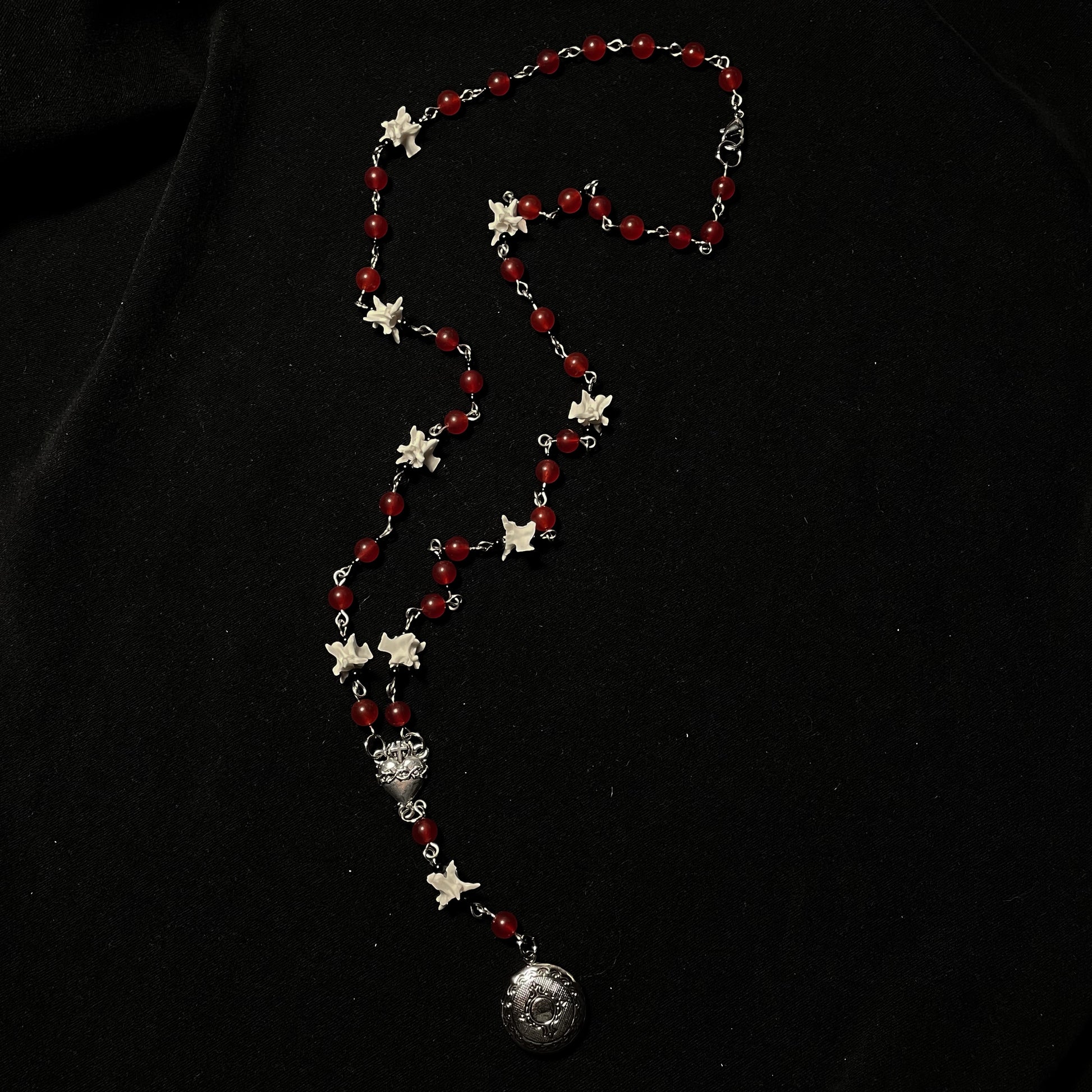✧ Red and black beaded necklace featuring real rattlesnake vertebrae bones, sacred heart centerpiece, and locket pendant