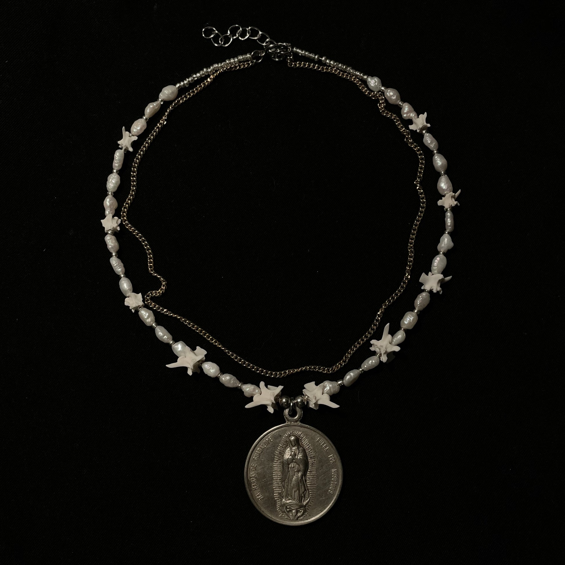 ✧ Choker made of real rattlesnake vertebrae and freshwater pearls, layered with a gold colored chain and silver Our Lady of Guadalupe pendant