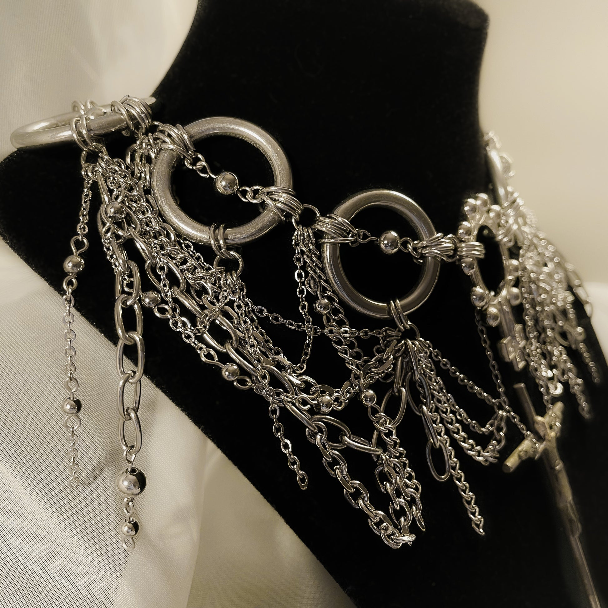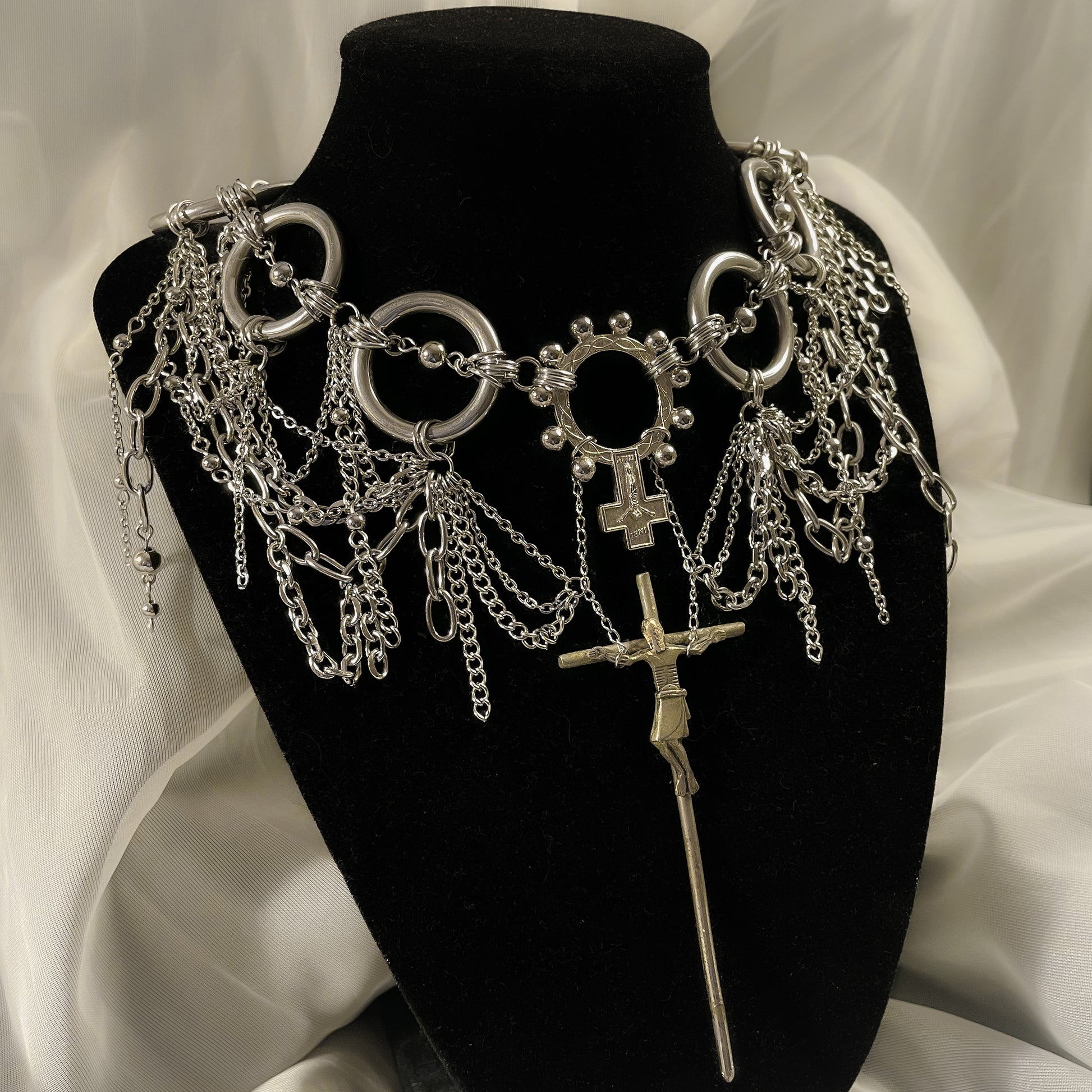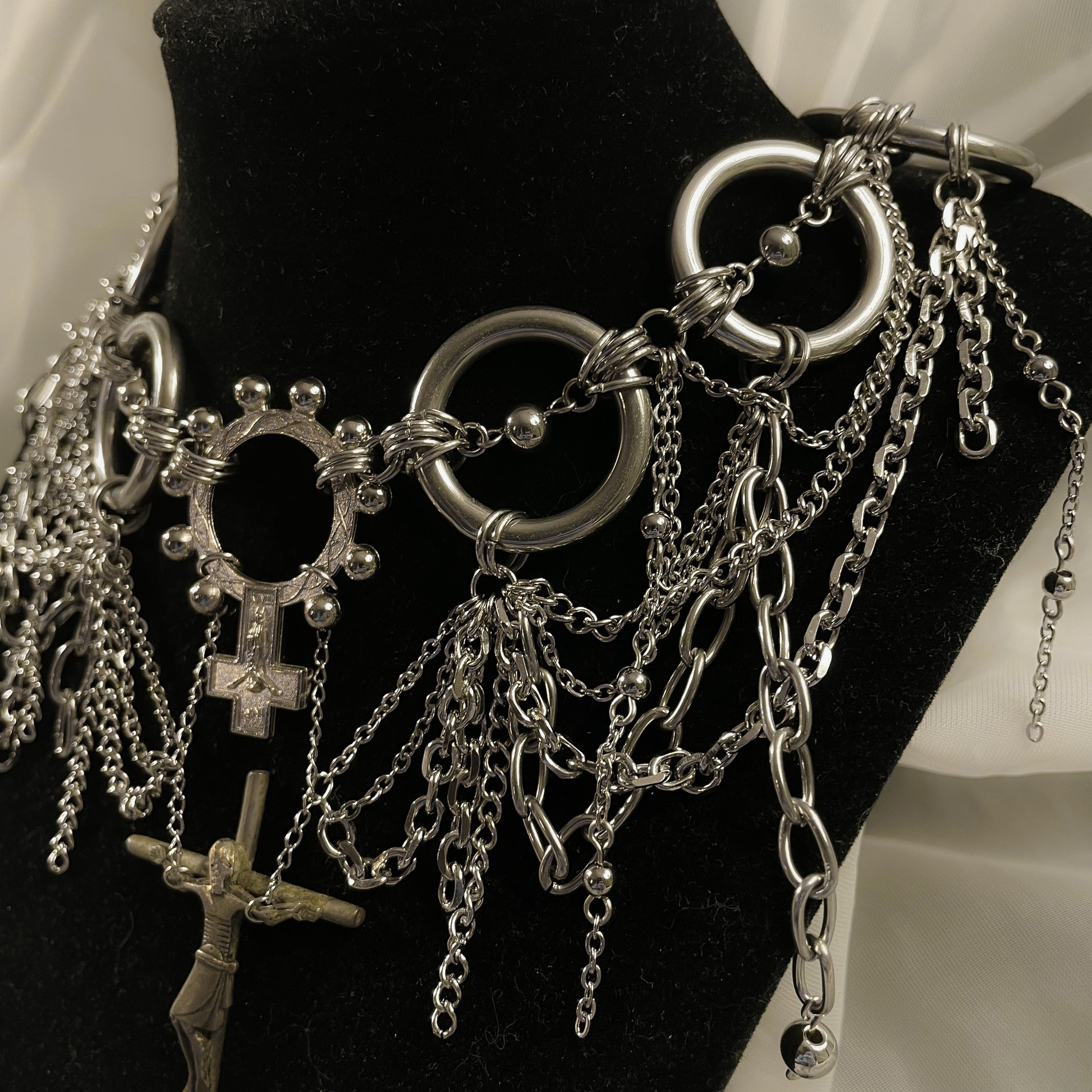 ✧ Choker and chain style necklace made of 1" stainless steel o-rings, chains, beads, and wire, with long vintage crucifix measuring 3.5", and vintage pocket rosary as a centerpiece--from top of pocket rosary to bottom of crucifix measures approximately 5.5".