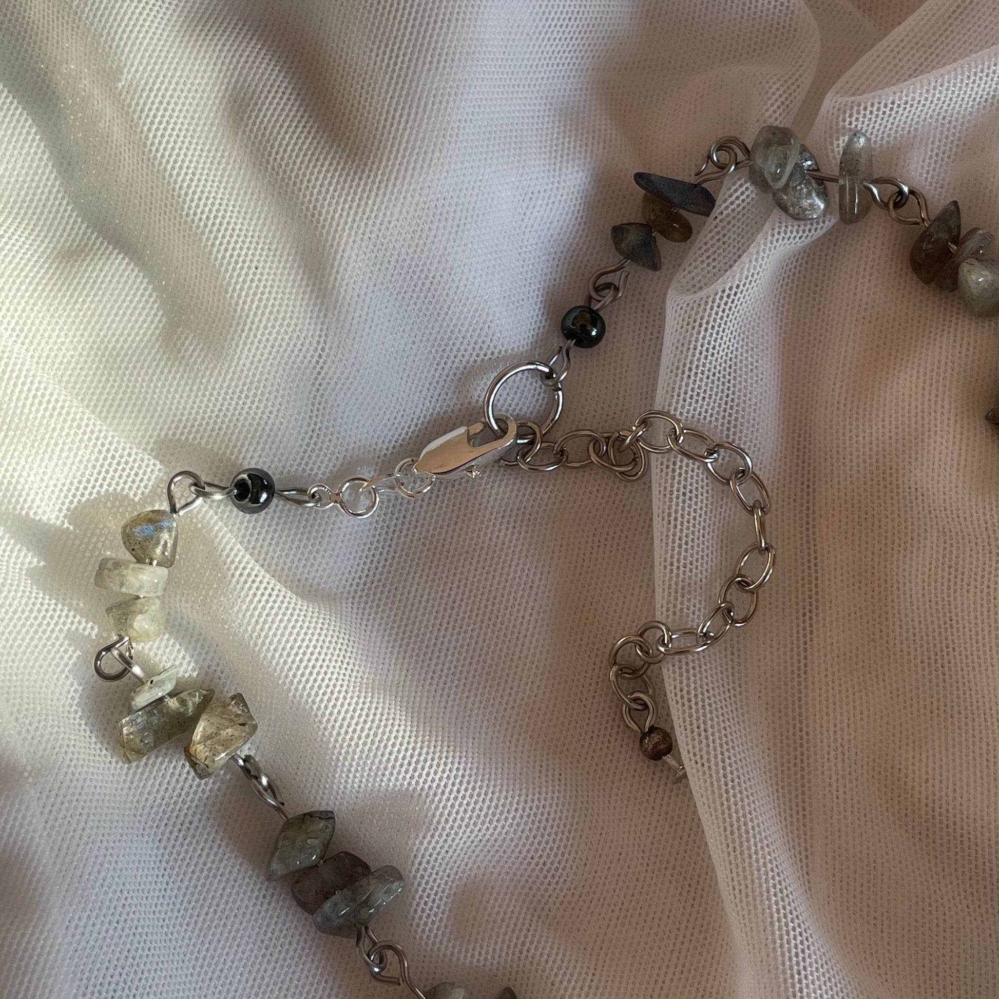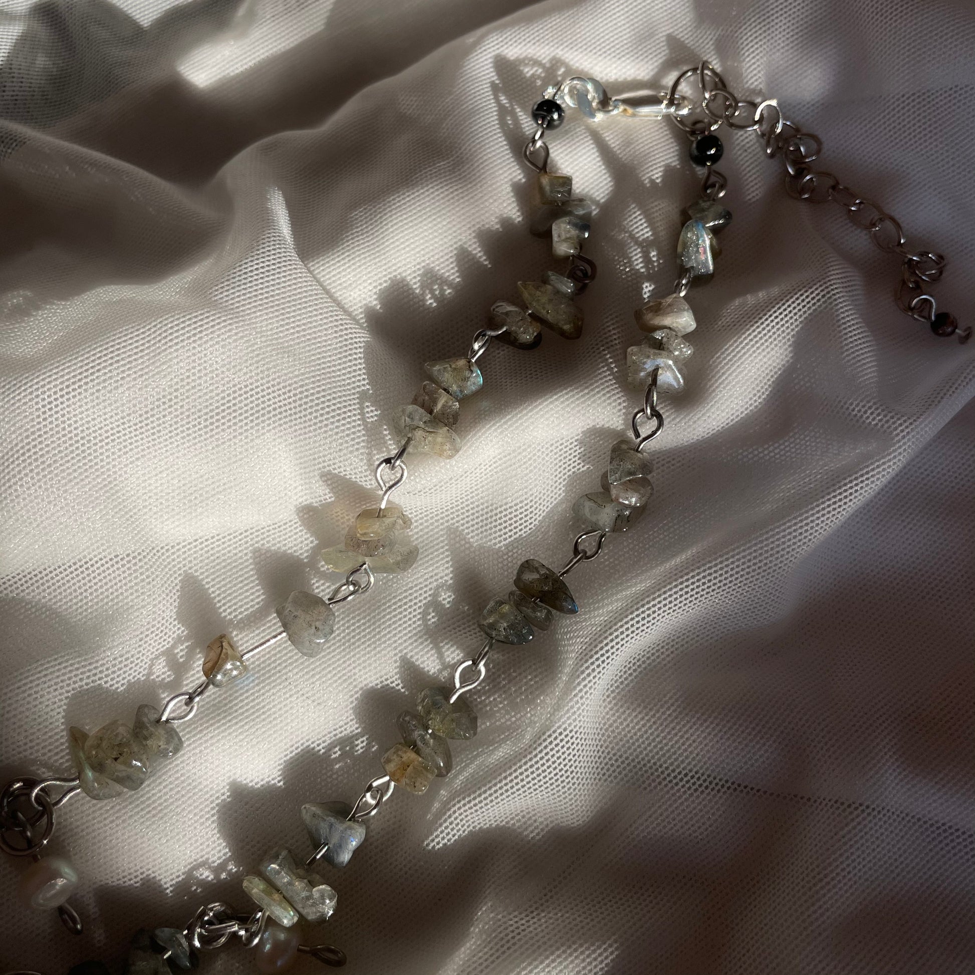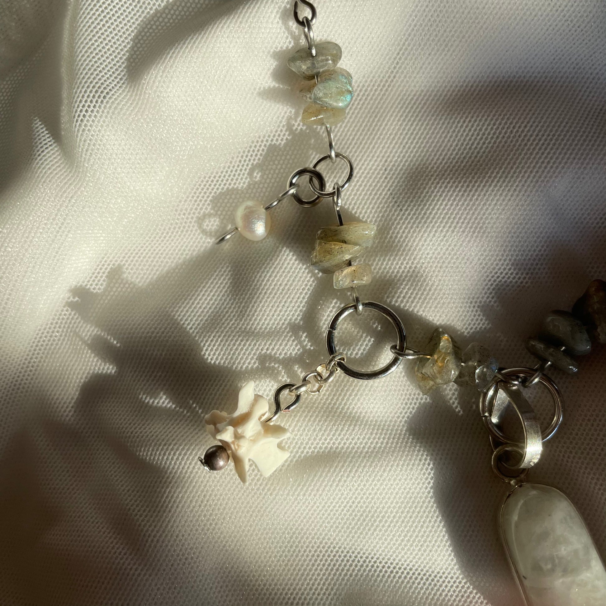 ✧ Choker style necklace with shards of labradorite crystal, moonstone pendant, rattlesnake vertebrae and freshwater pearls.