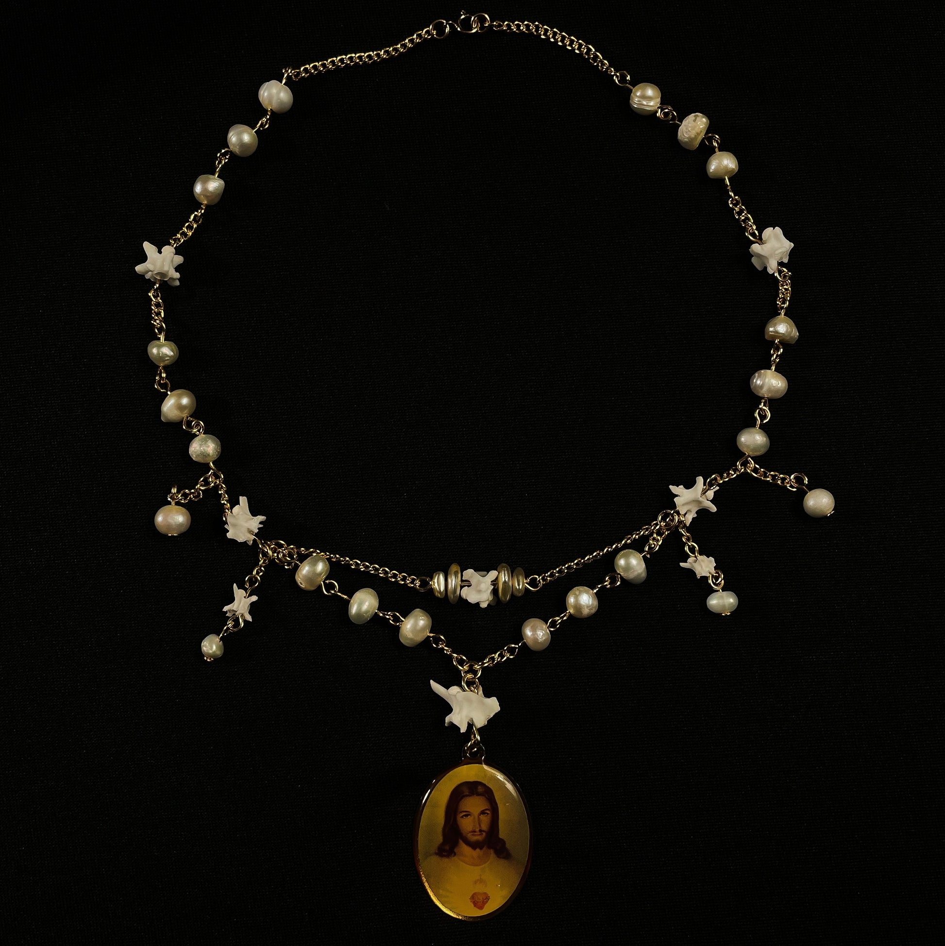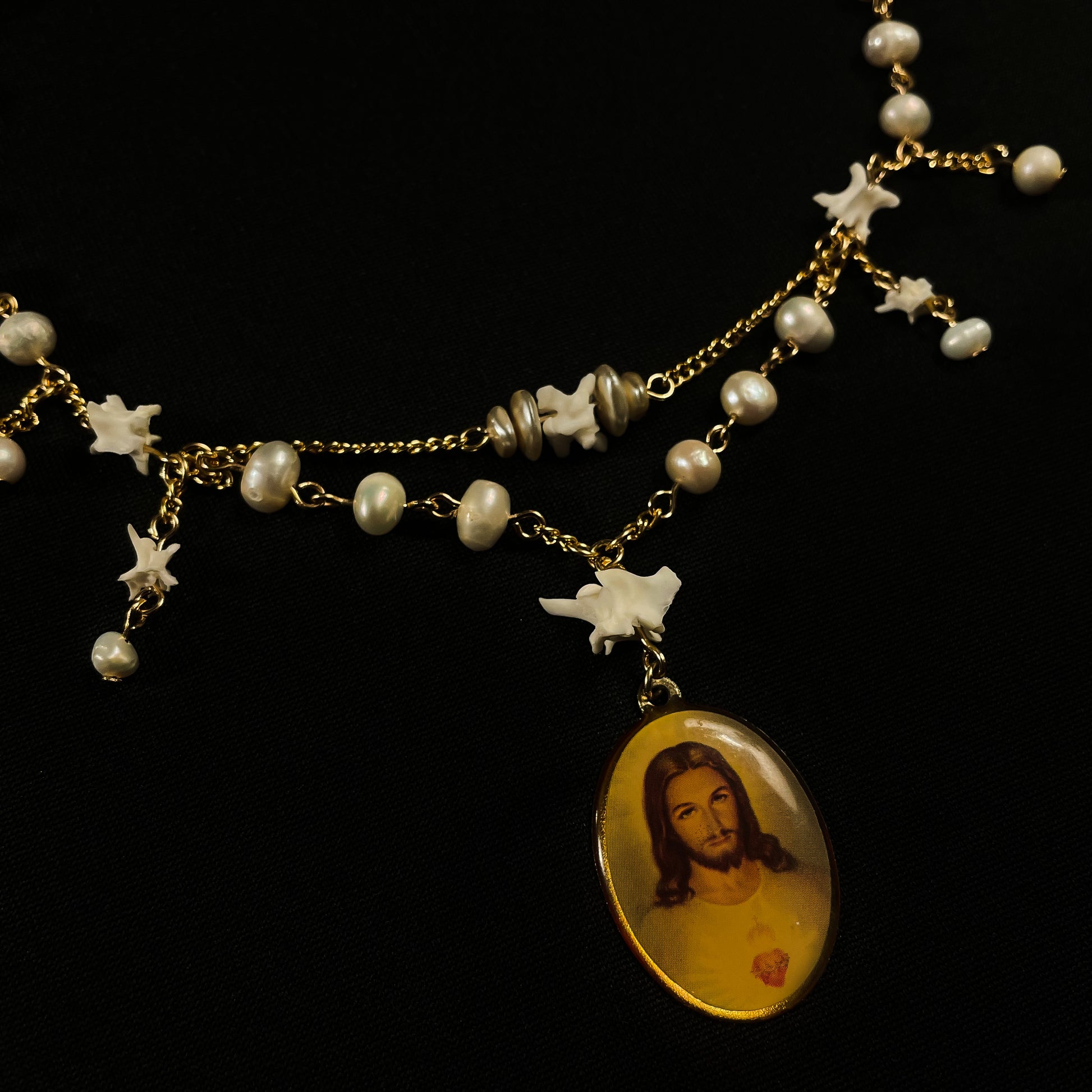 ✧ Gold necklace featuring real snake vertebrae bones, freshwater pearls, and vintage jesus pendant.