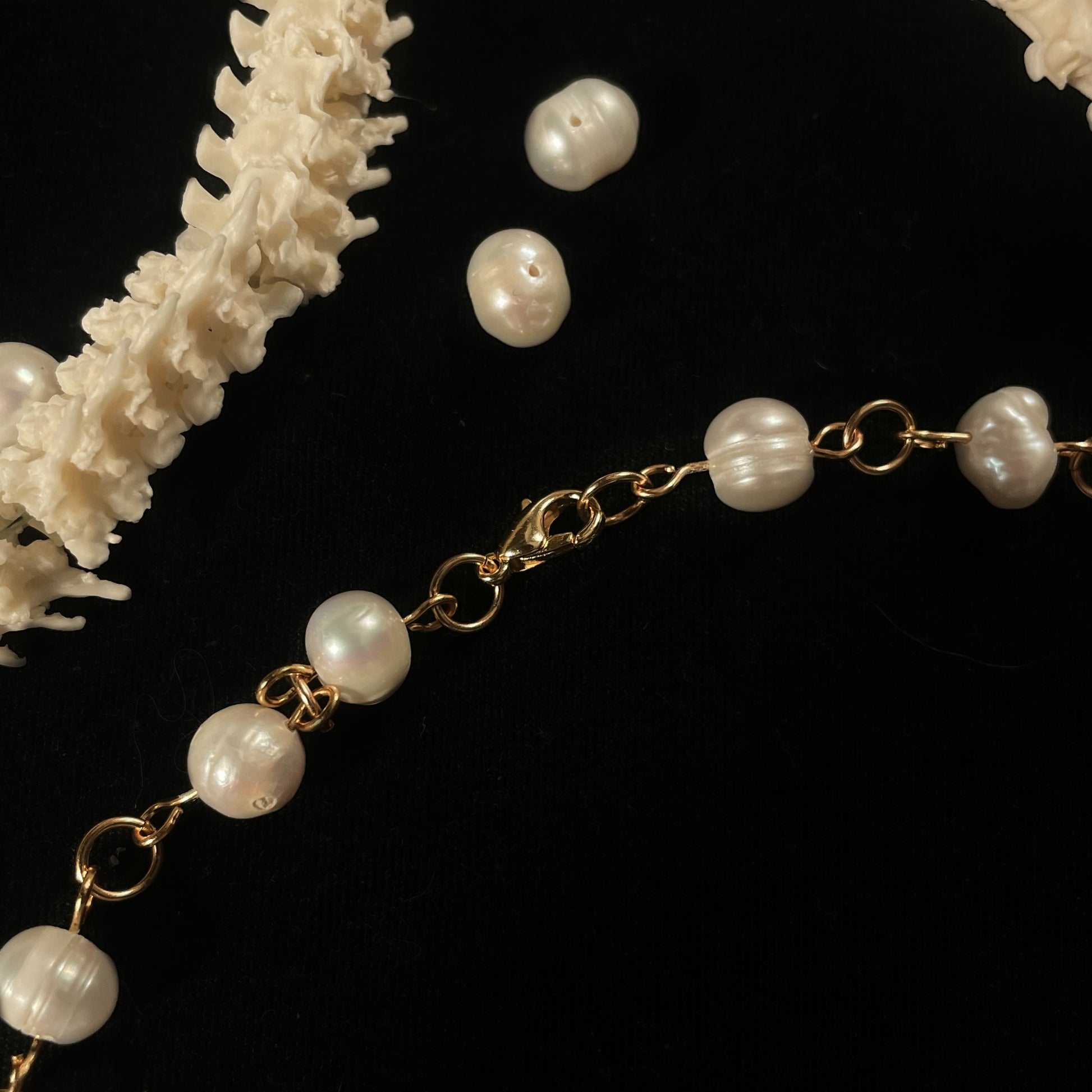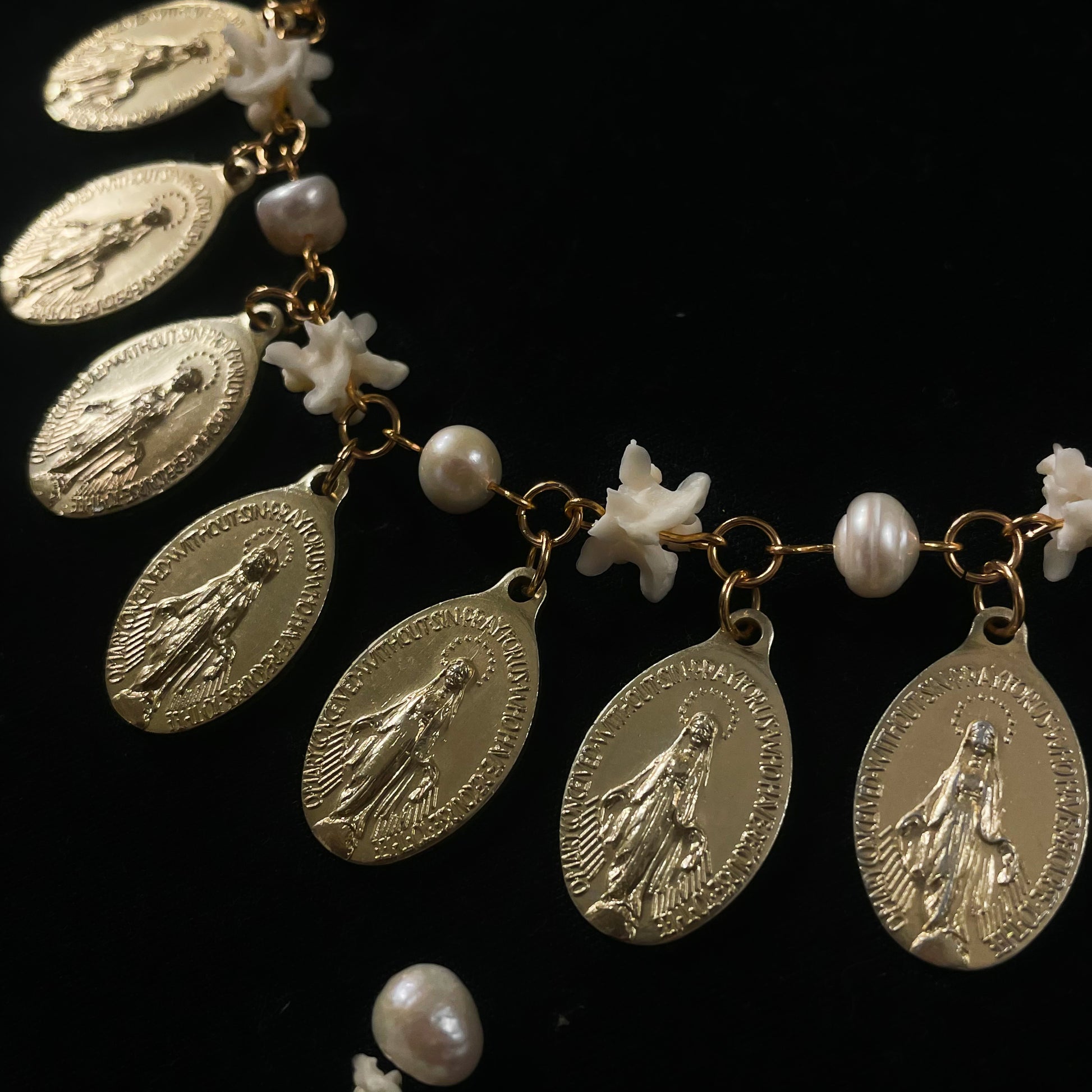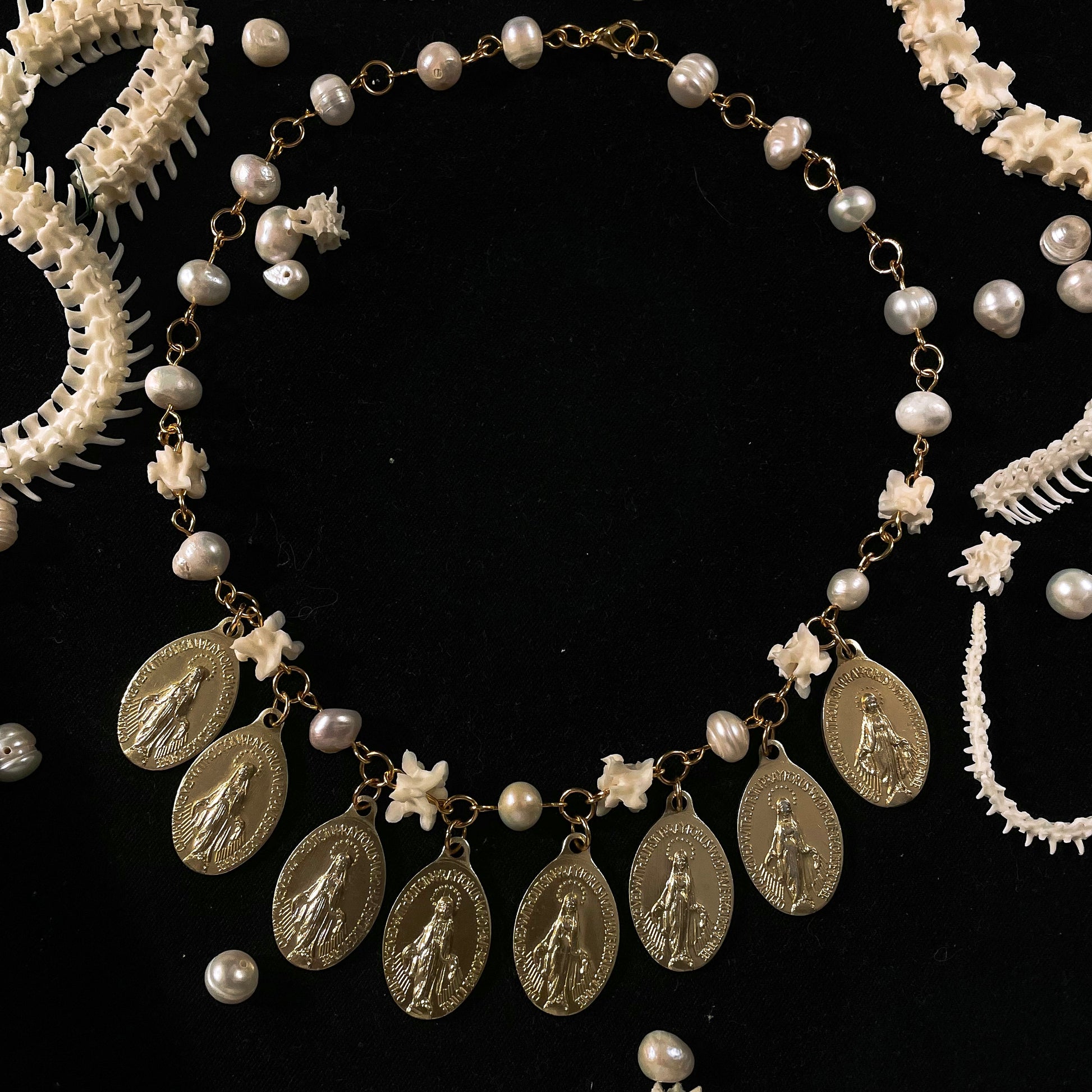 ✧ A one-of-one unique necklace featuring eight repeating mary charms, real snake vertebrae bones, and real freshwater pearls all on gold filled wire.
