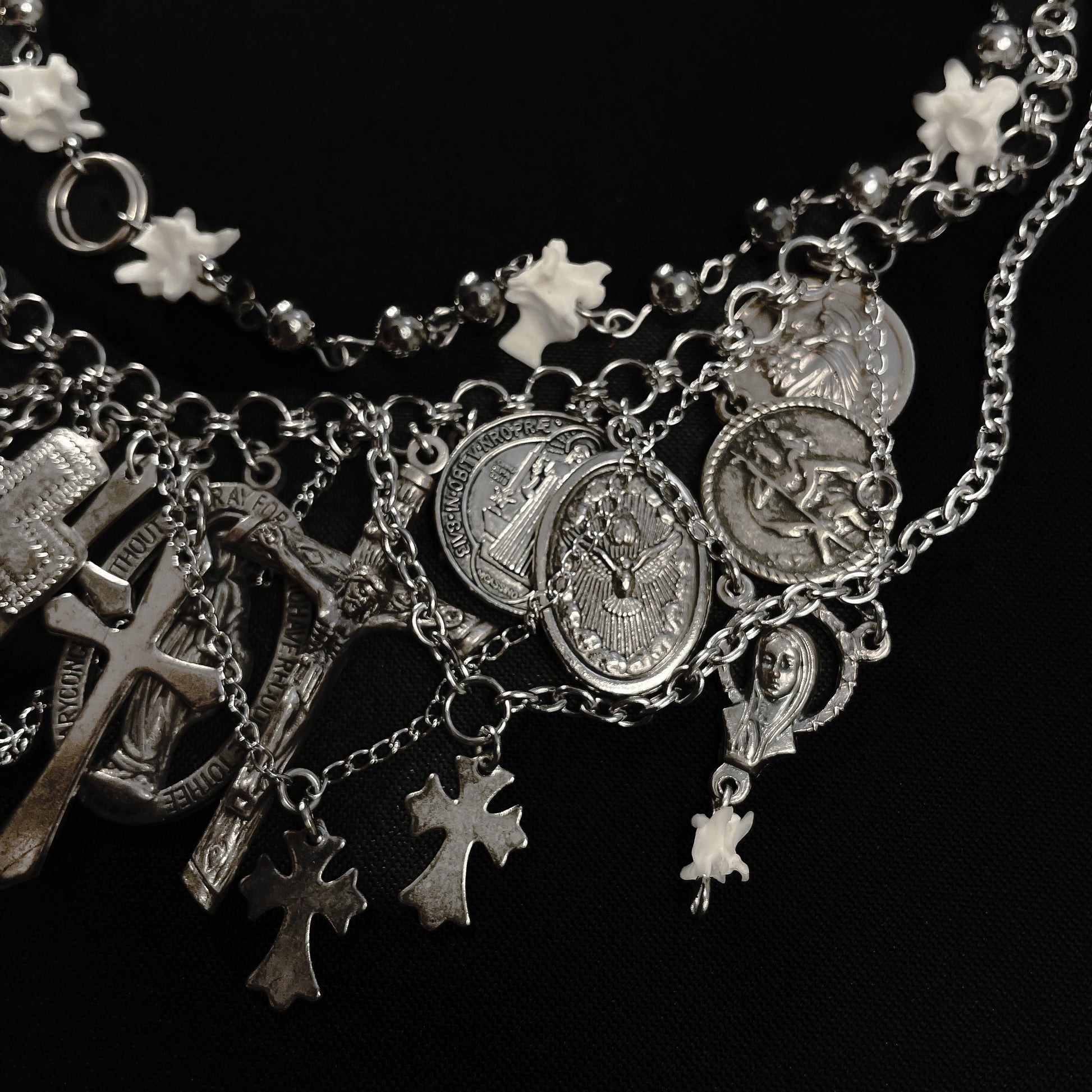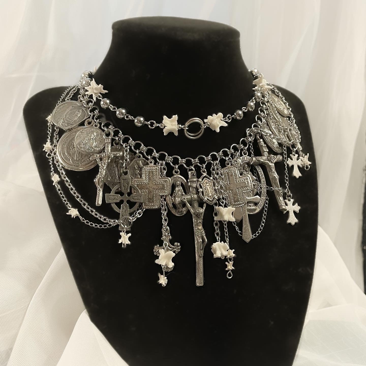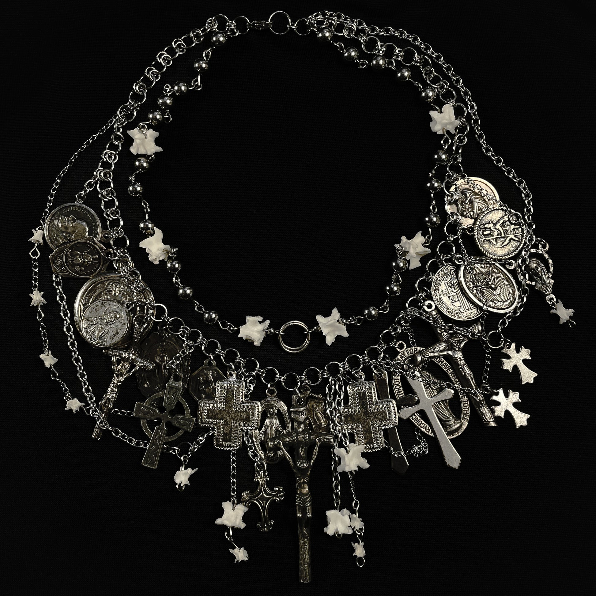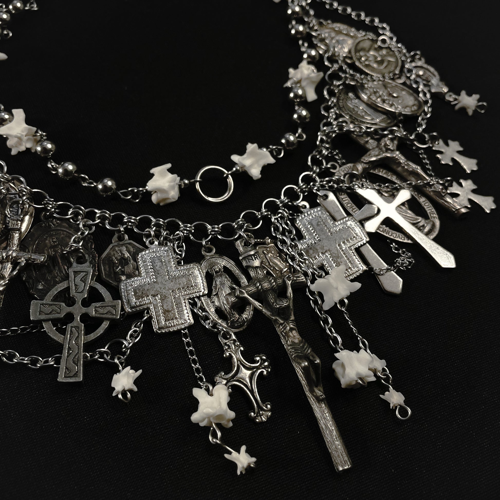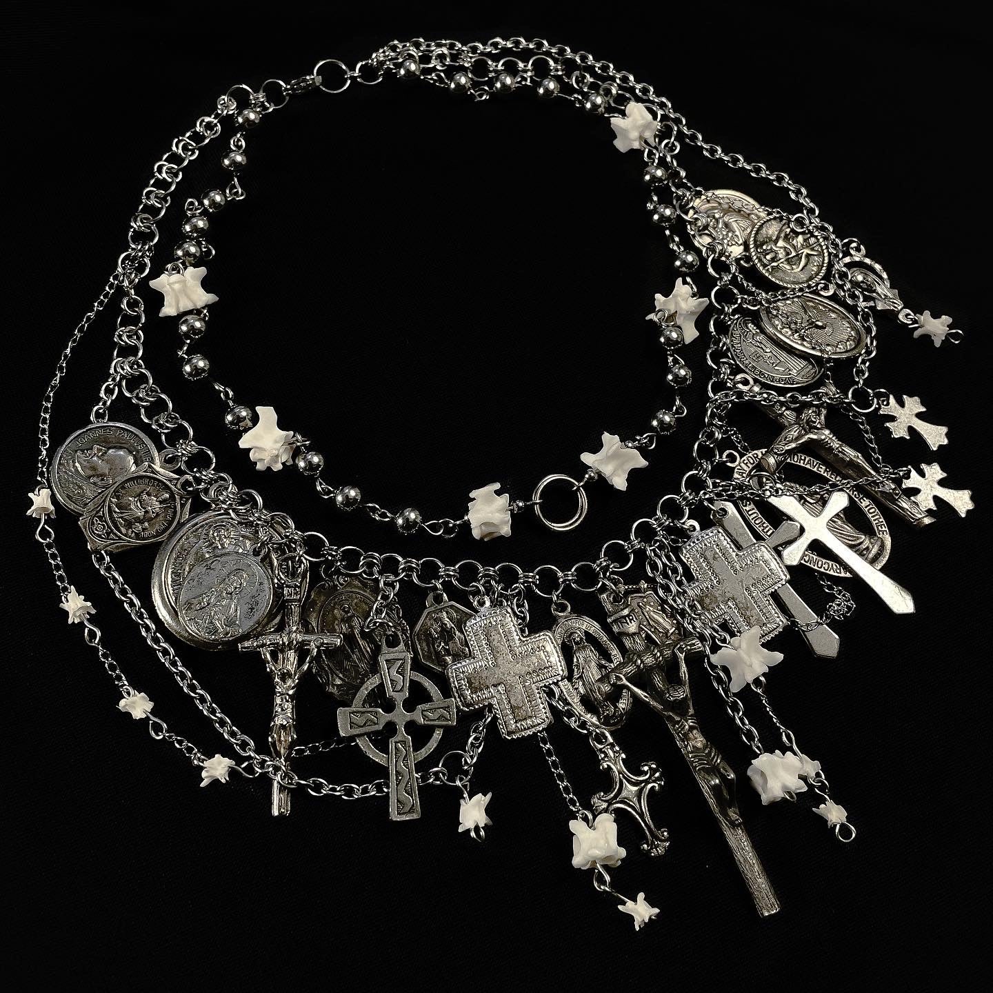 ✧ The eighth version of the metal icons choker. Features two layered chains with real snake vertebrae bones, stainless steel beads, and over 25 vintage religious pendants with various chain segments layered.