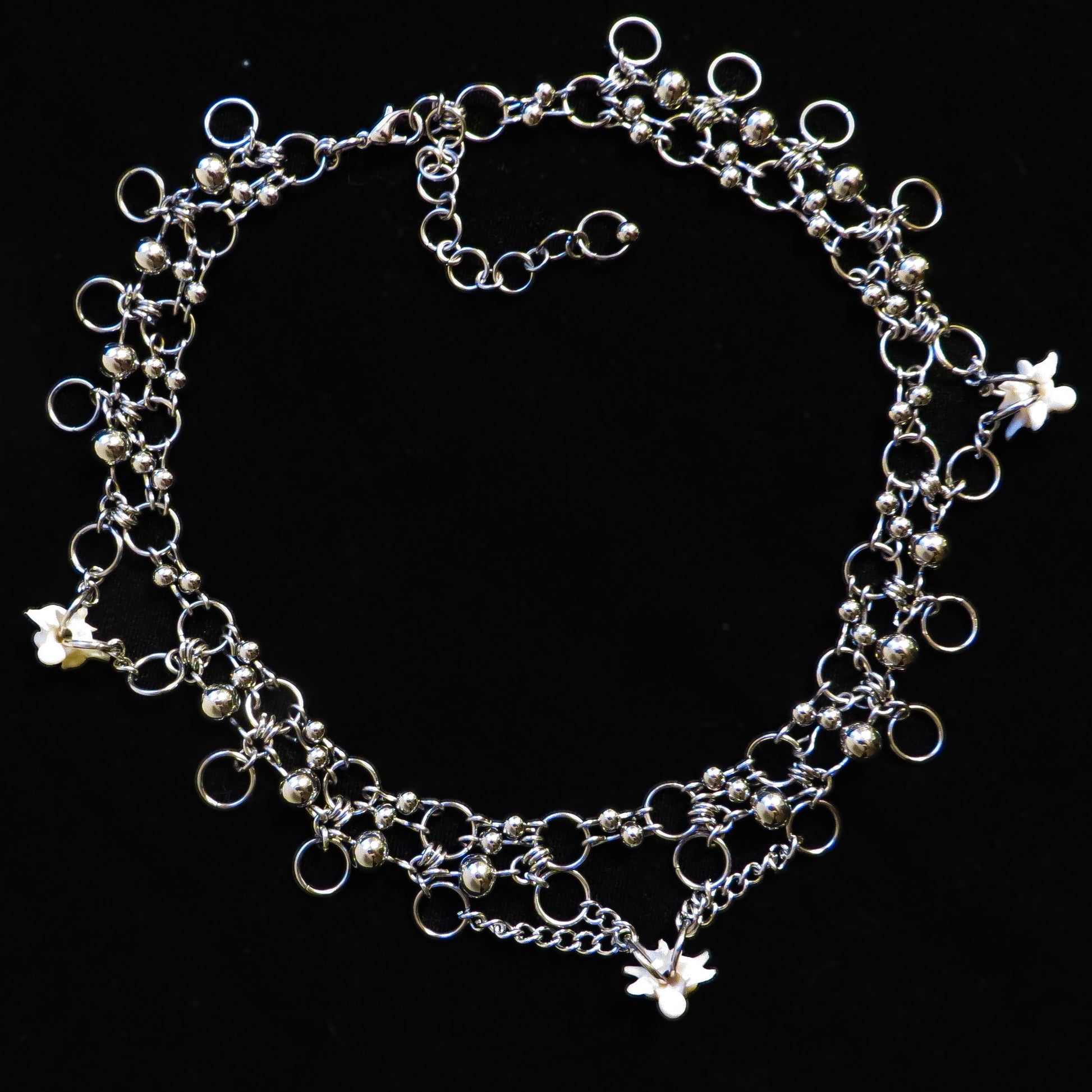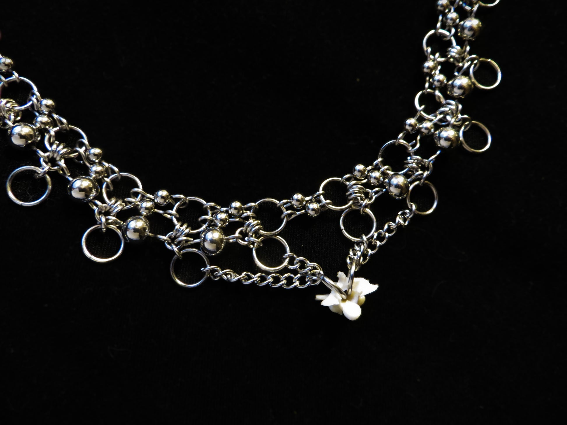 ✧ Choker style necklace made out of real rattlesnake vertebrae bones, stainless steel beads, and all stainless steel wire and chain with a central bone & two accent bones on the sides.