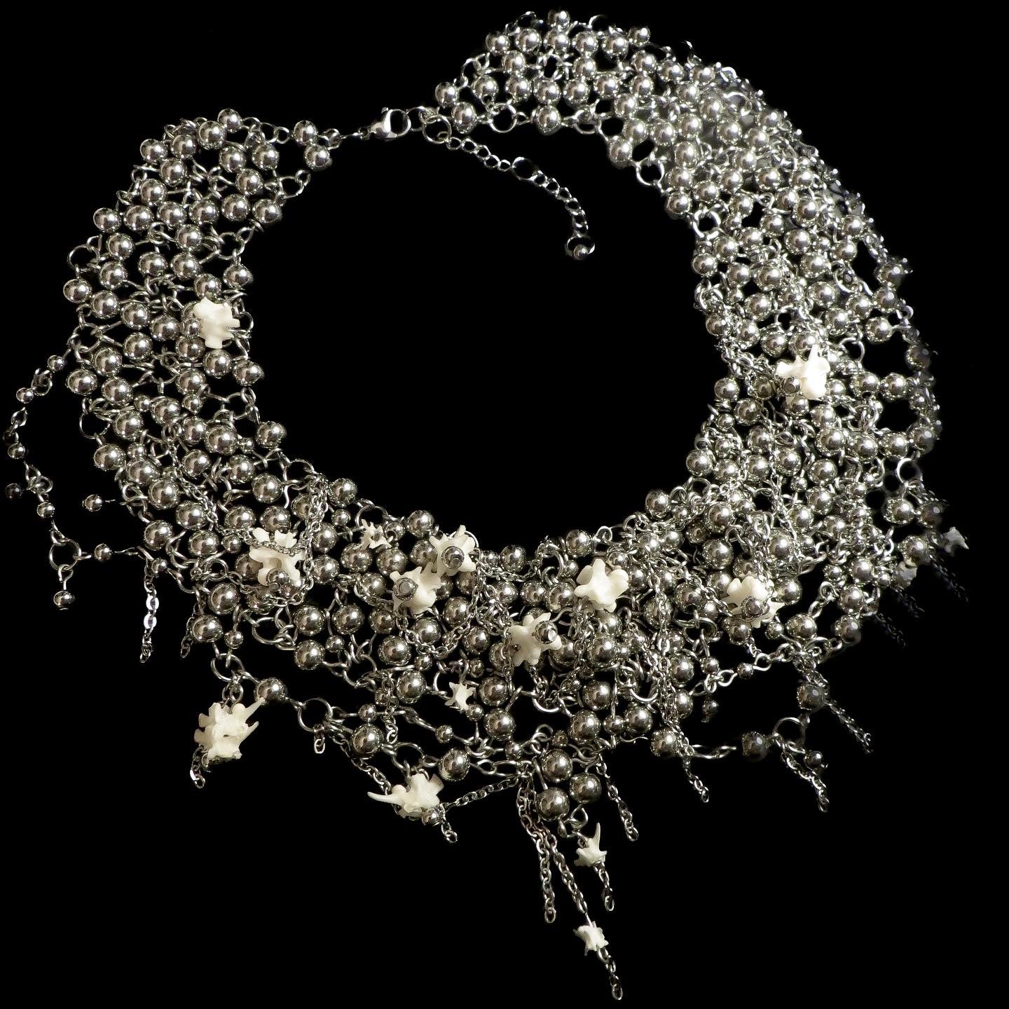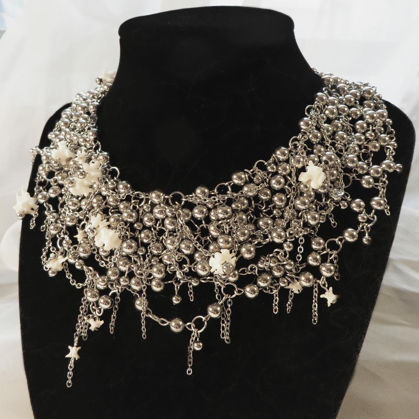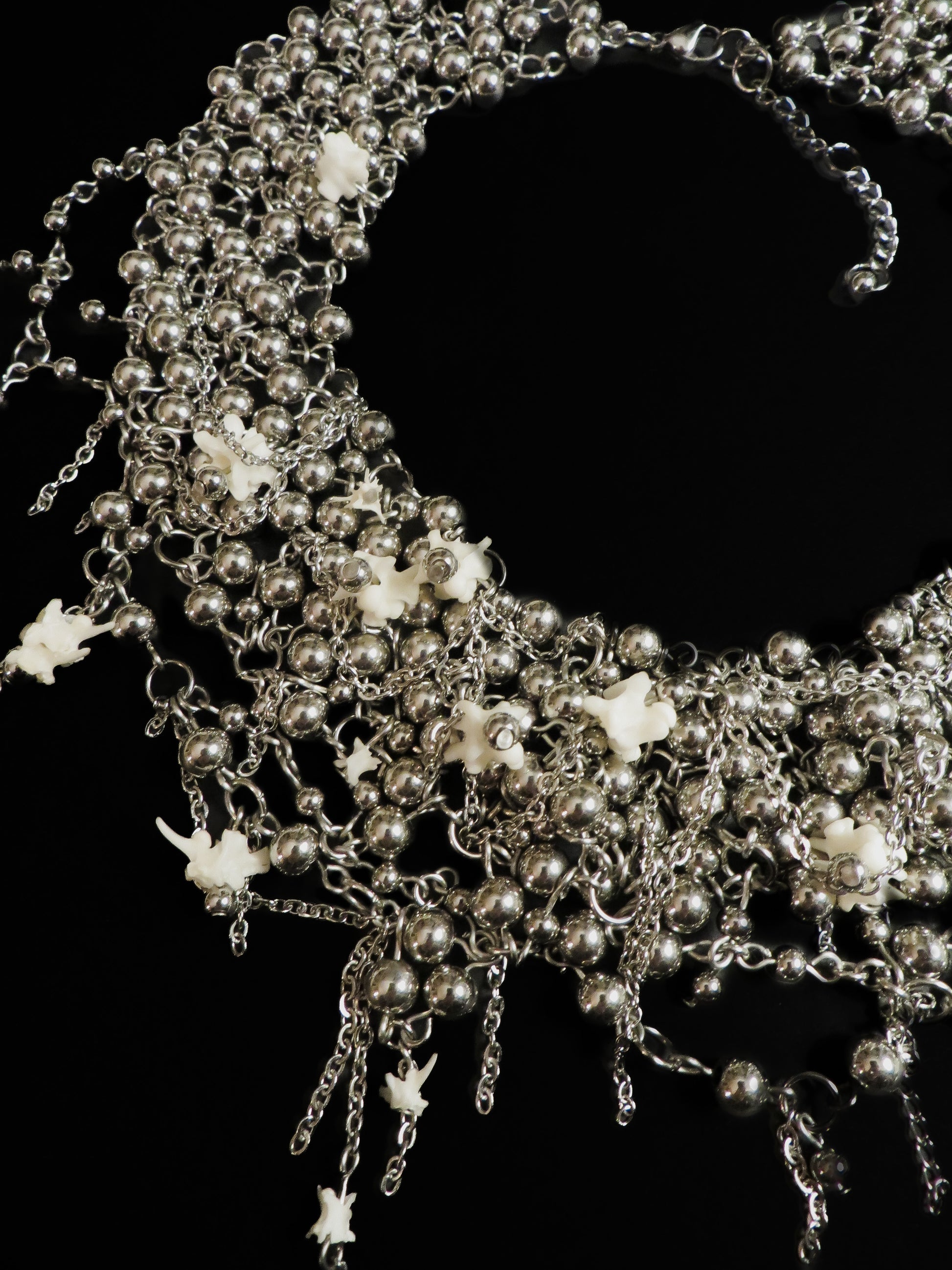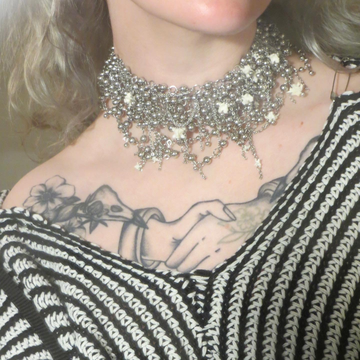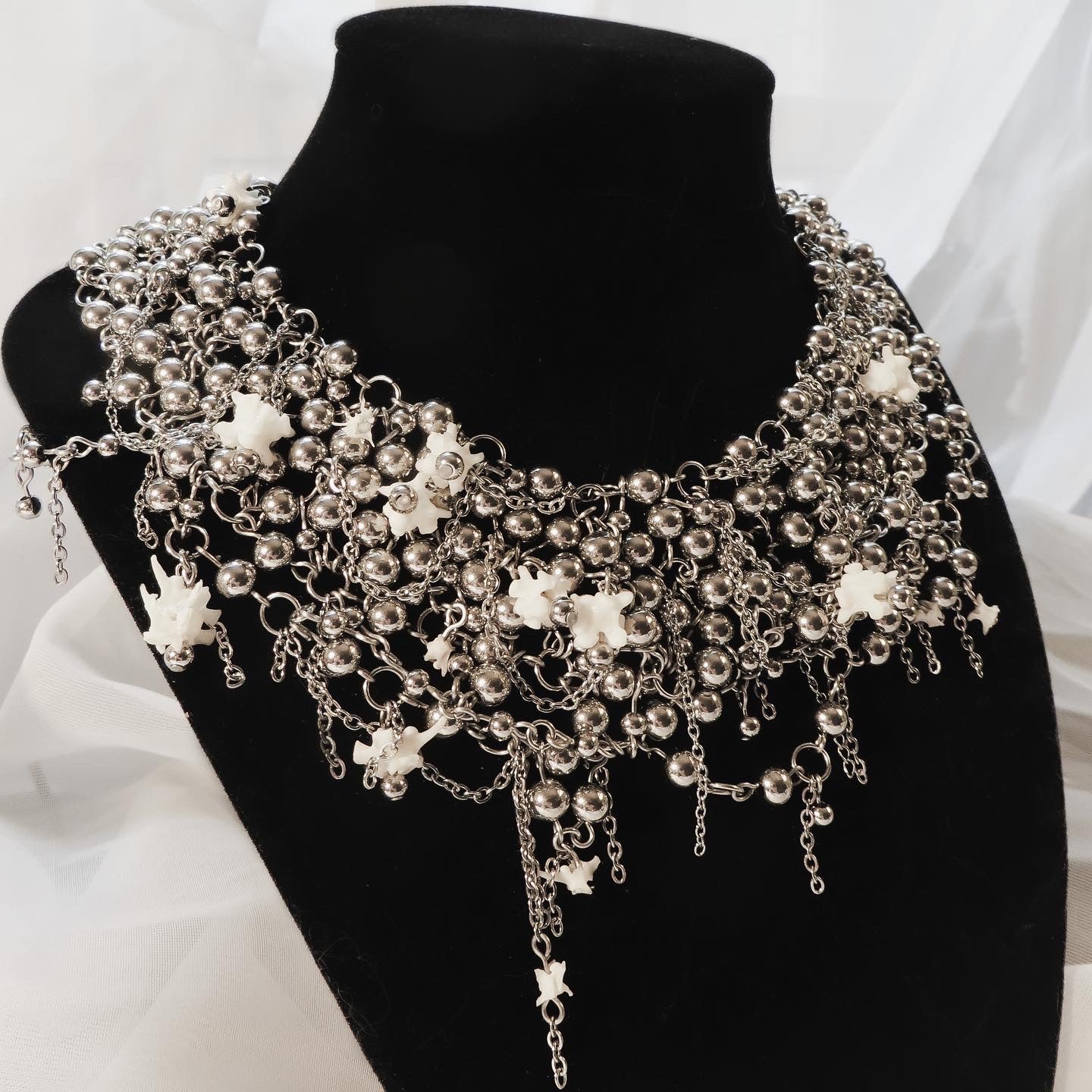 ⋆ The Orbweaver choker was inspired by ornate antique lace collars, dewdrops and egg sacs on spiderwebs, and organic abstractions. Made from hundreds of 100% stainless steel beads, wire, and chain, with real snake vertebrae bones.