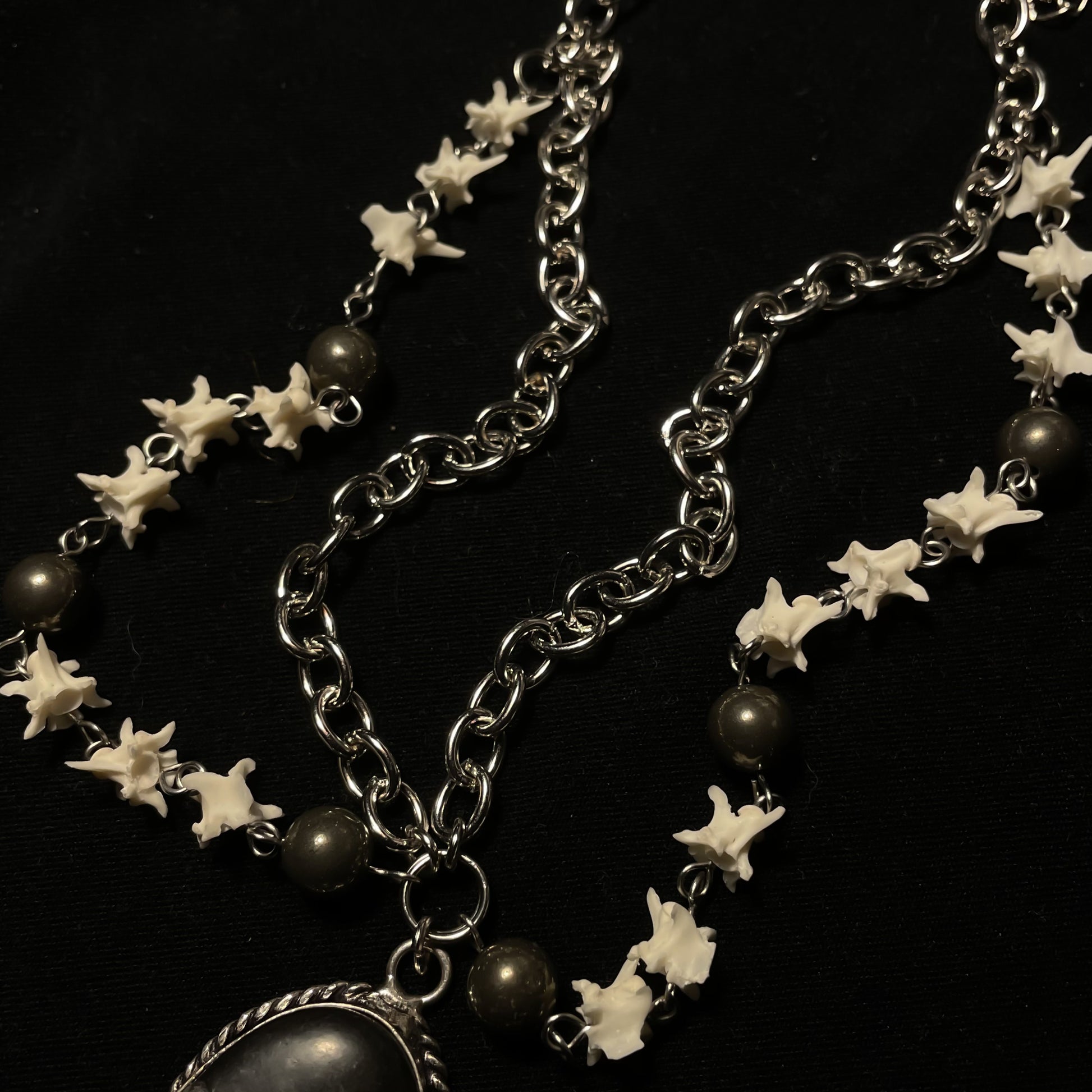 ✧ Short necklace / choker featuring real rattlesnake vertebrae bones, pyrite beads, chain, and black & gold pyrite pendant