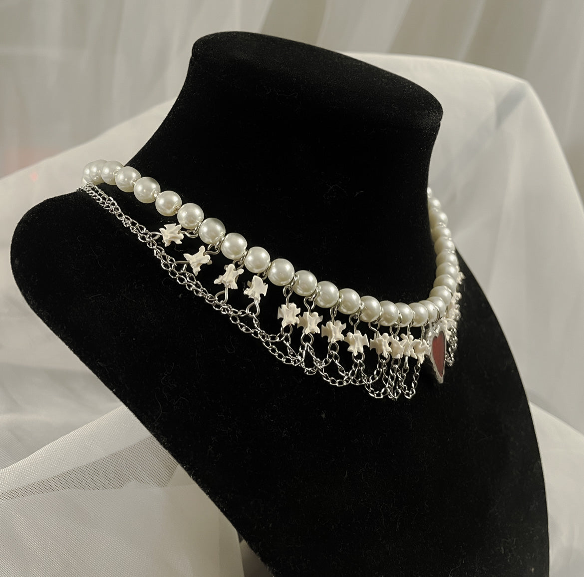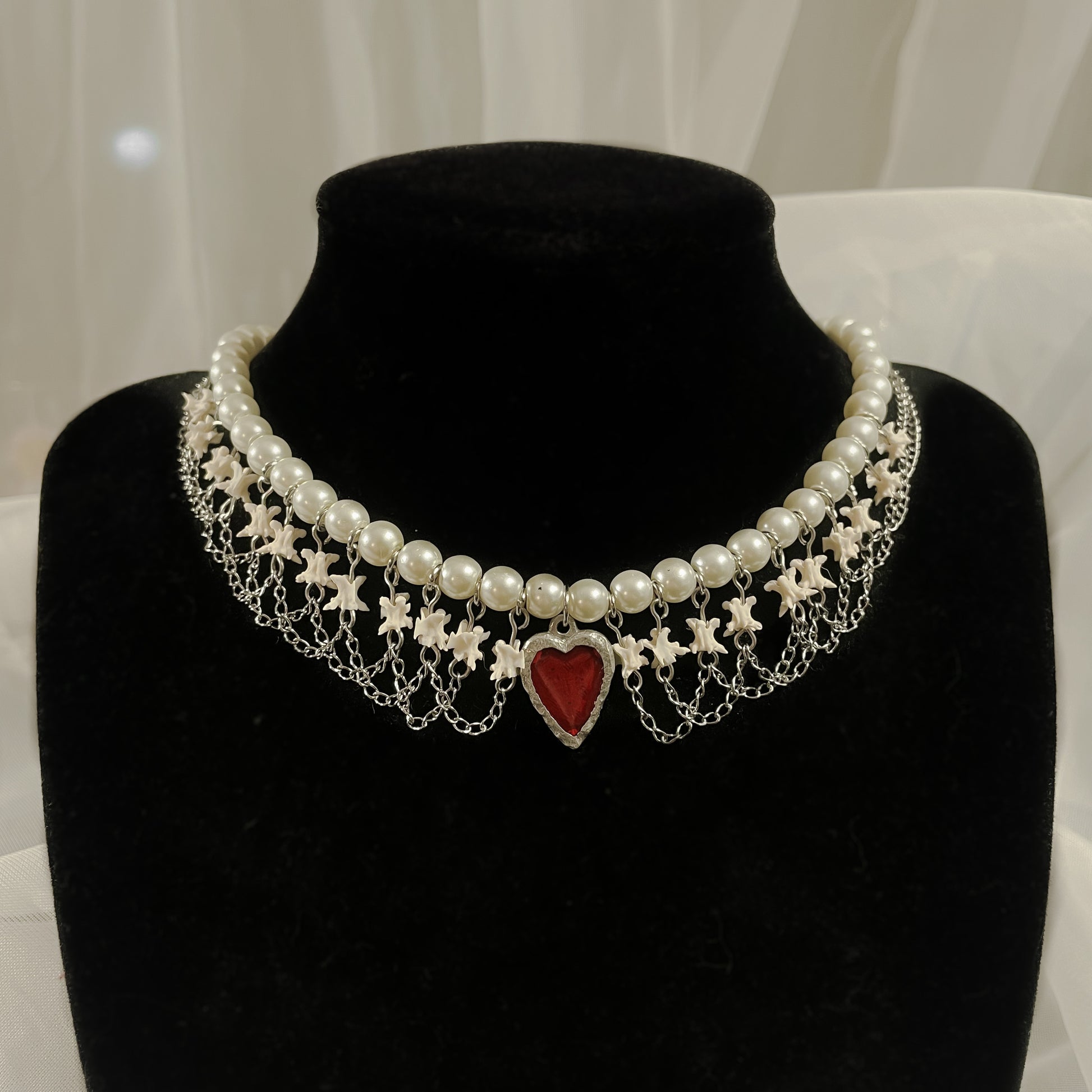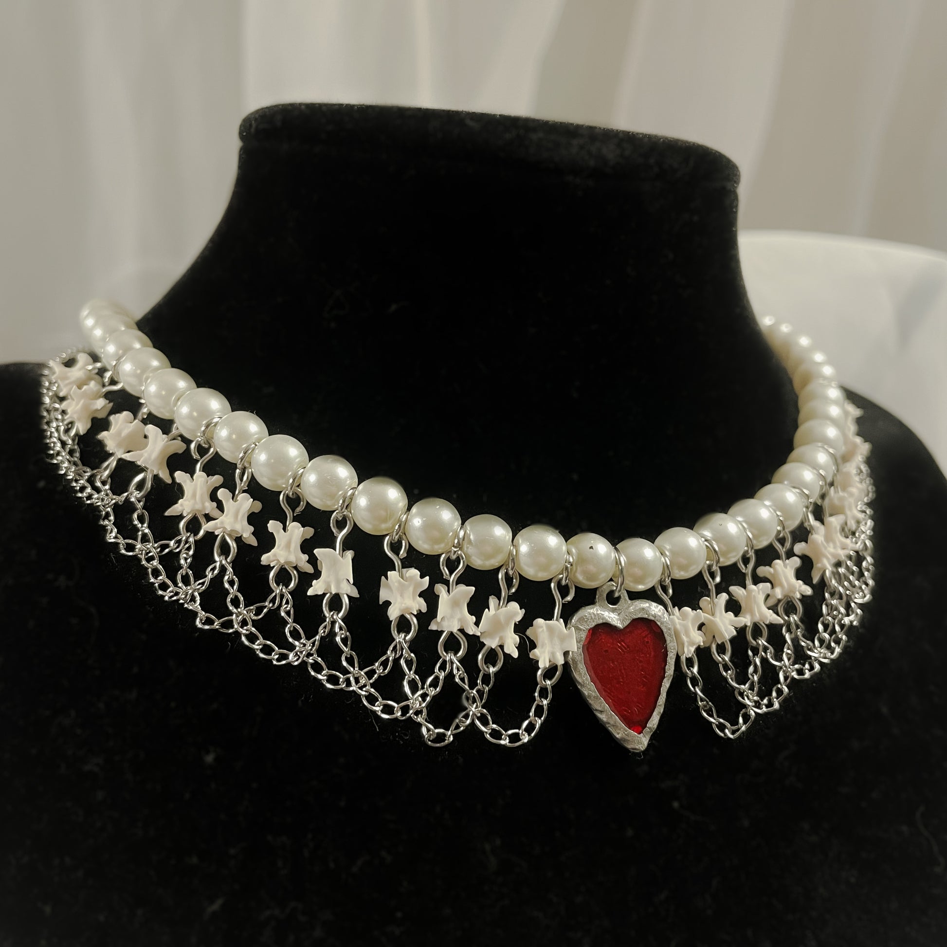 ✧ Choker style necklace featuring a row of real rattlesnake vertebrae, faux pearl beads, stainless steel chain resembling victorian lace, and a handmade pewter heart pendant.