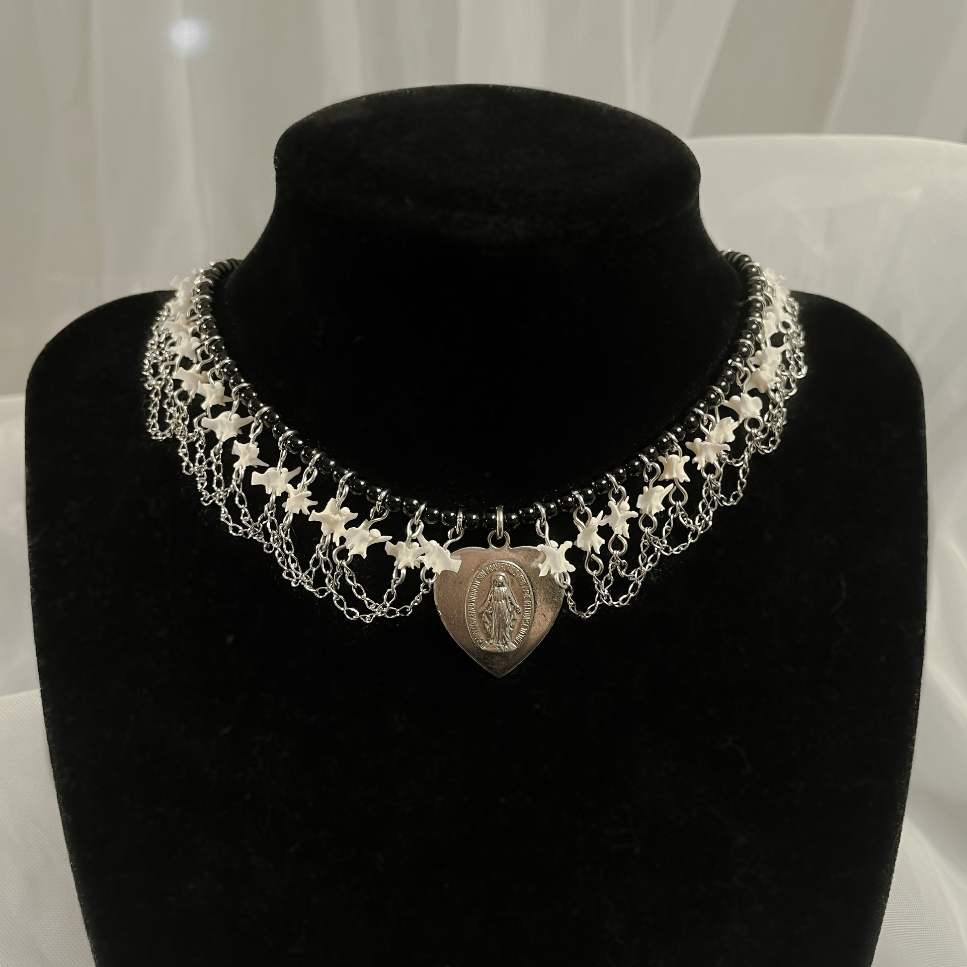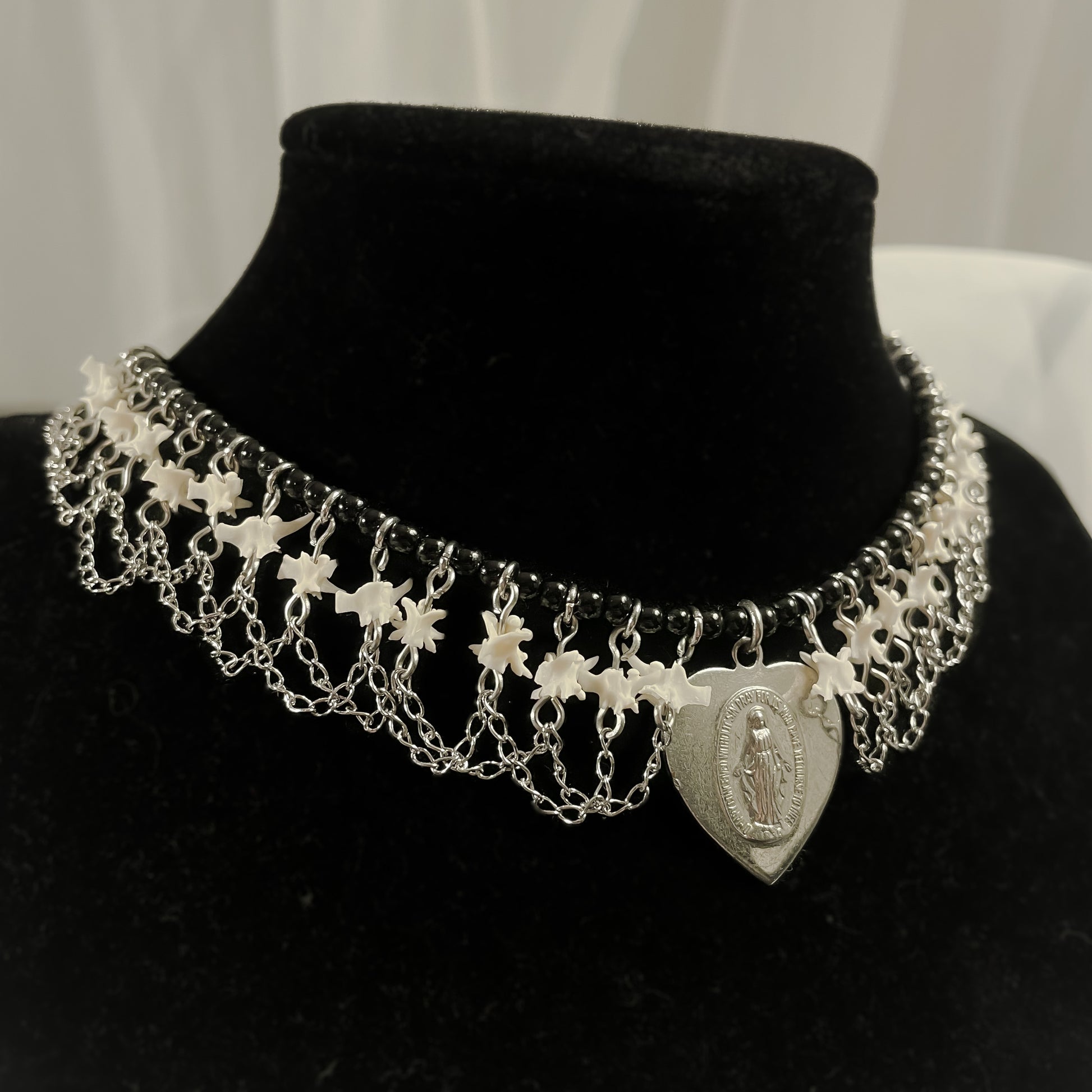 ✧ Choker style necklace featuring a row of real rattlesnake vertebrae bones, stainless steel chain resembling victorian lace, black beads, and vintage religious heart pendant.