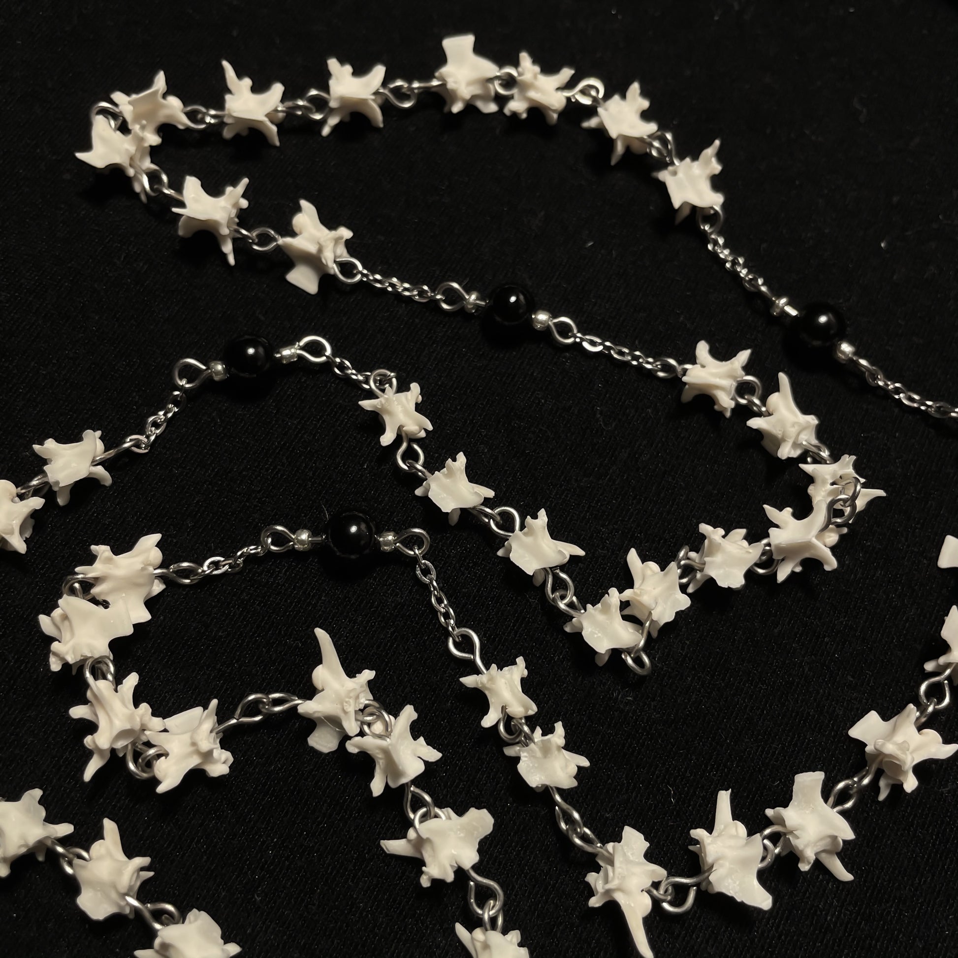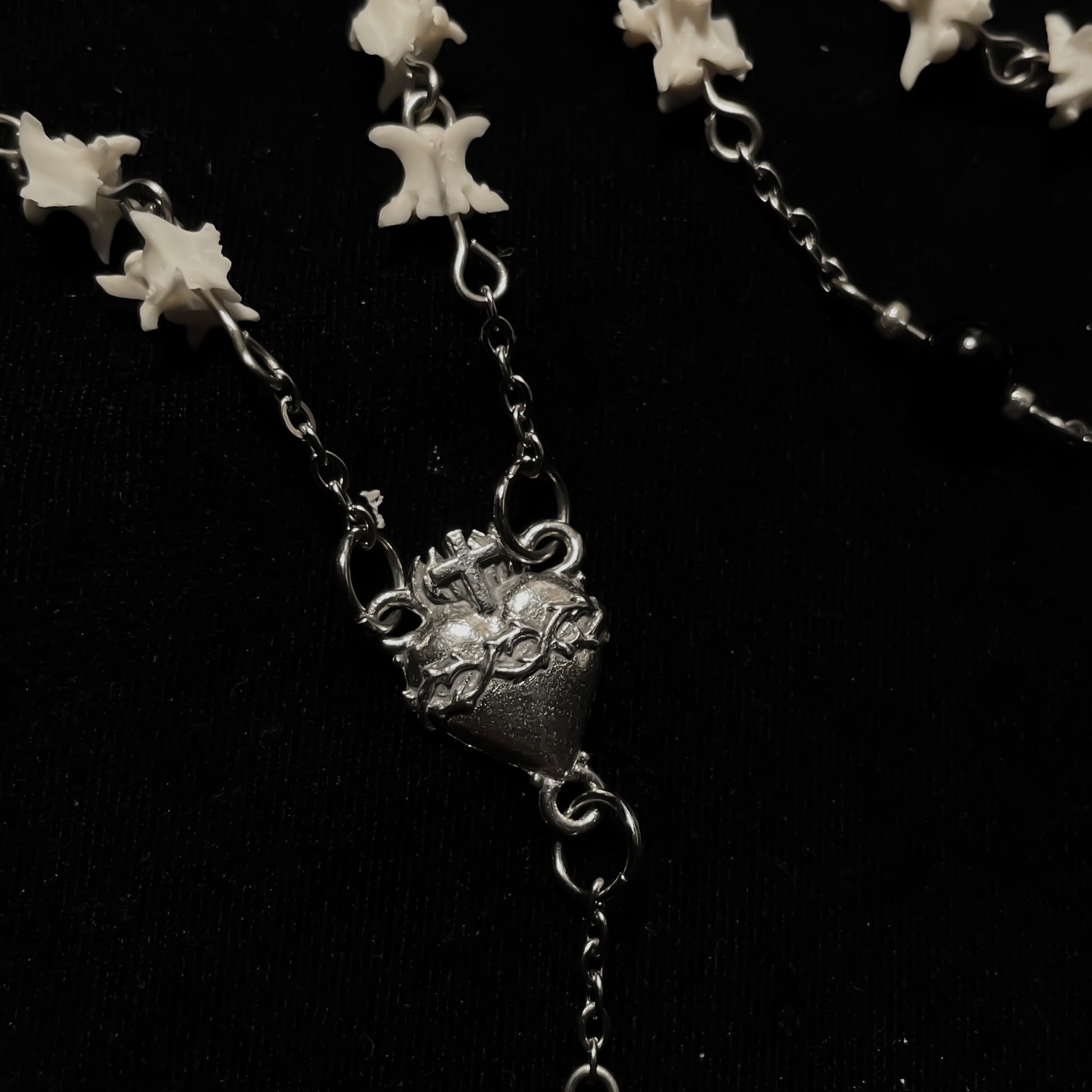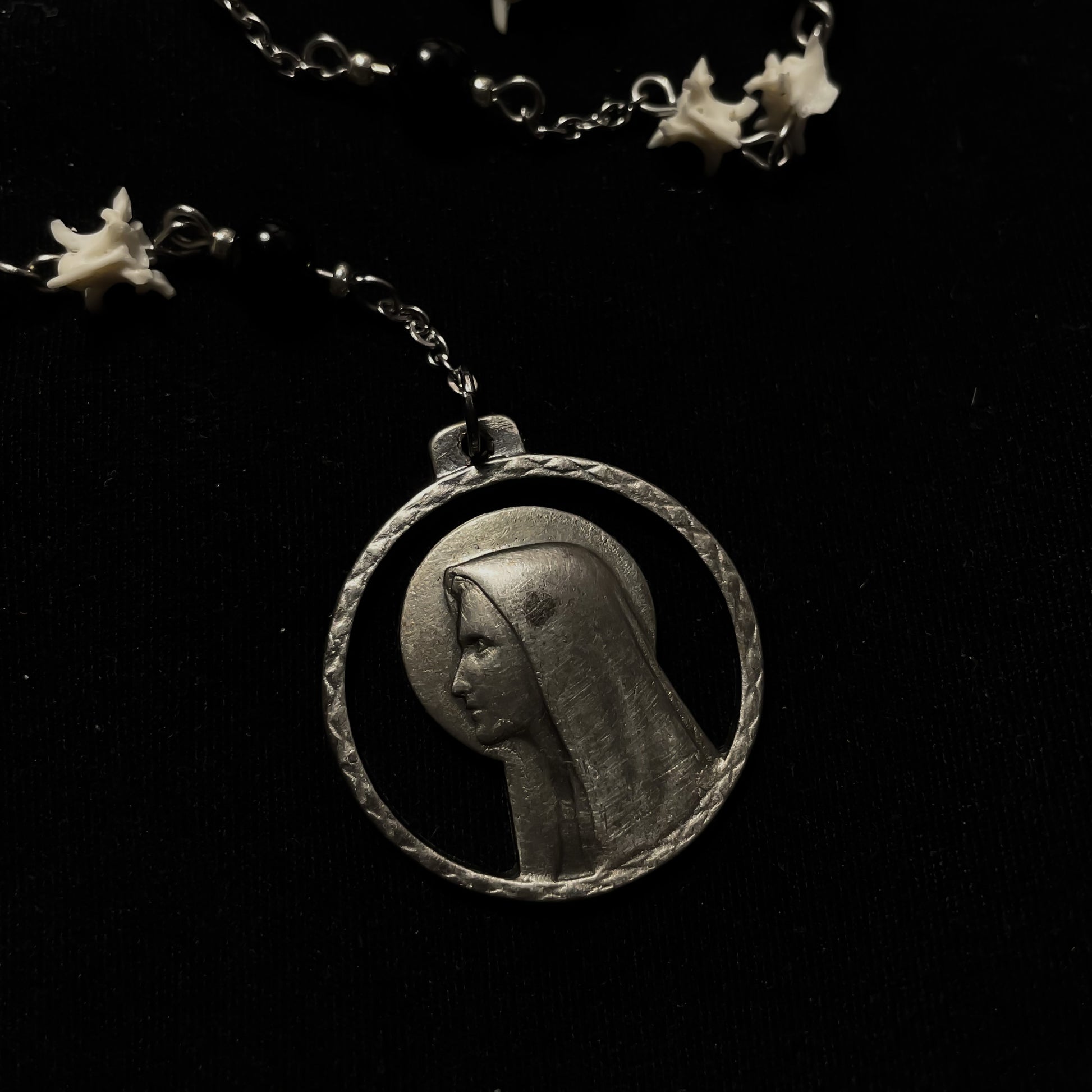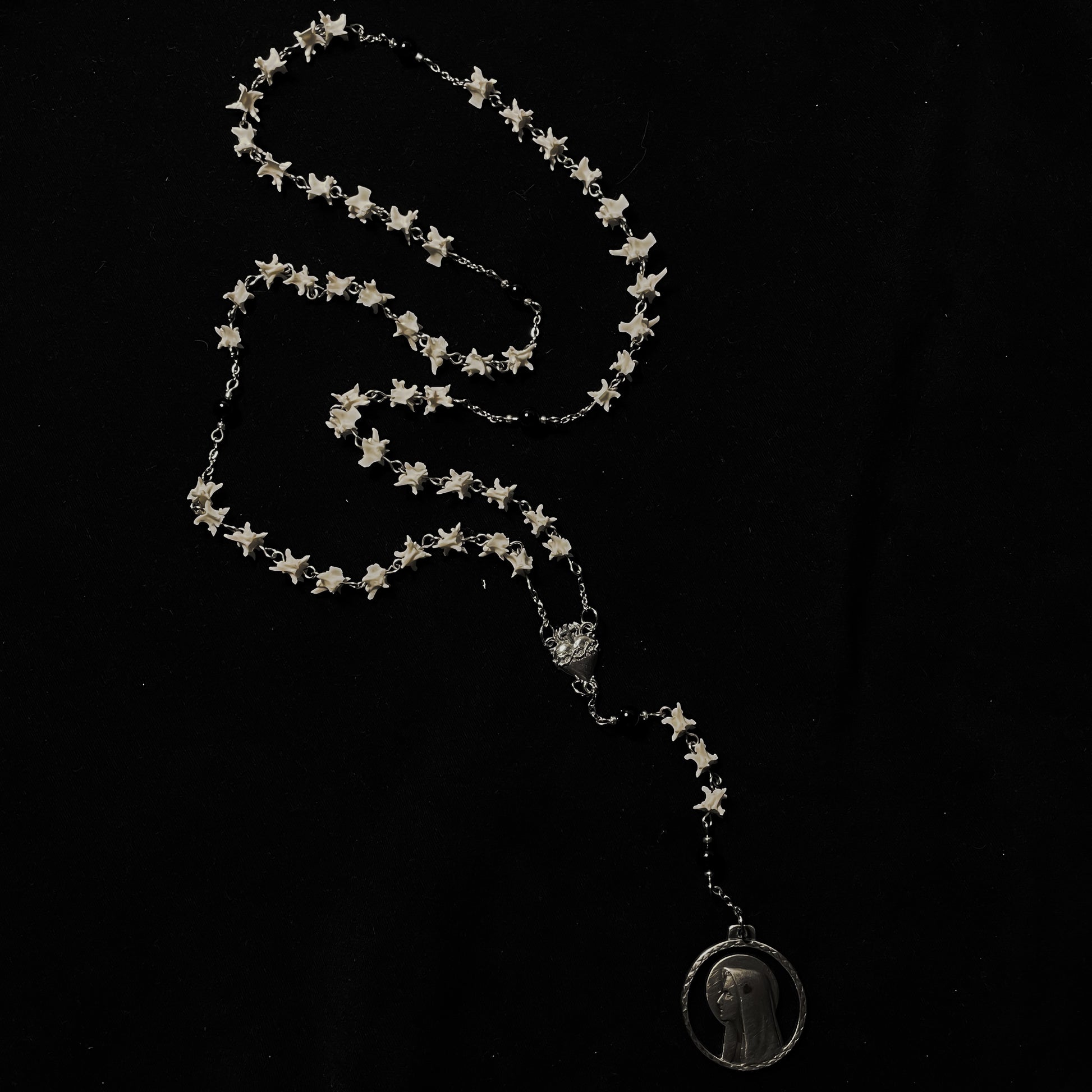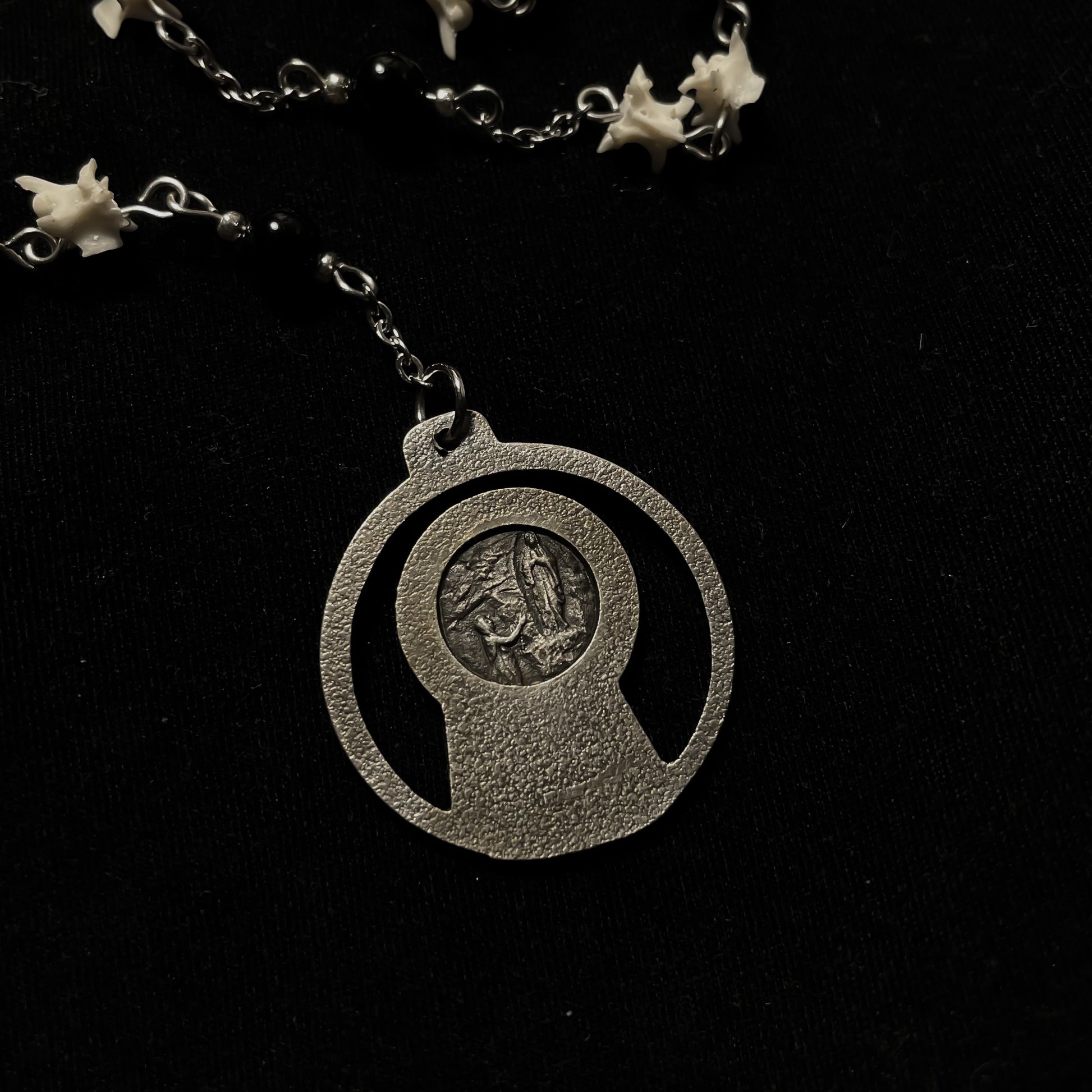 ✧ Rosary style necklace made of real rattlesnake vertebrae bones, black beads, sacred heart centerpiece, and circular silver saint profile pendant