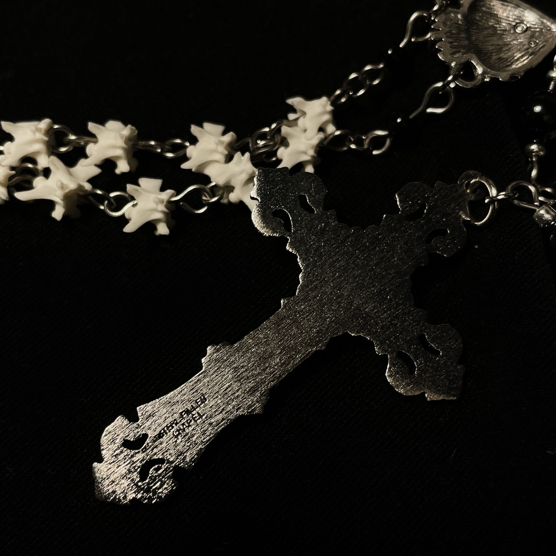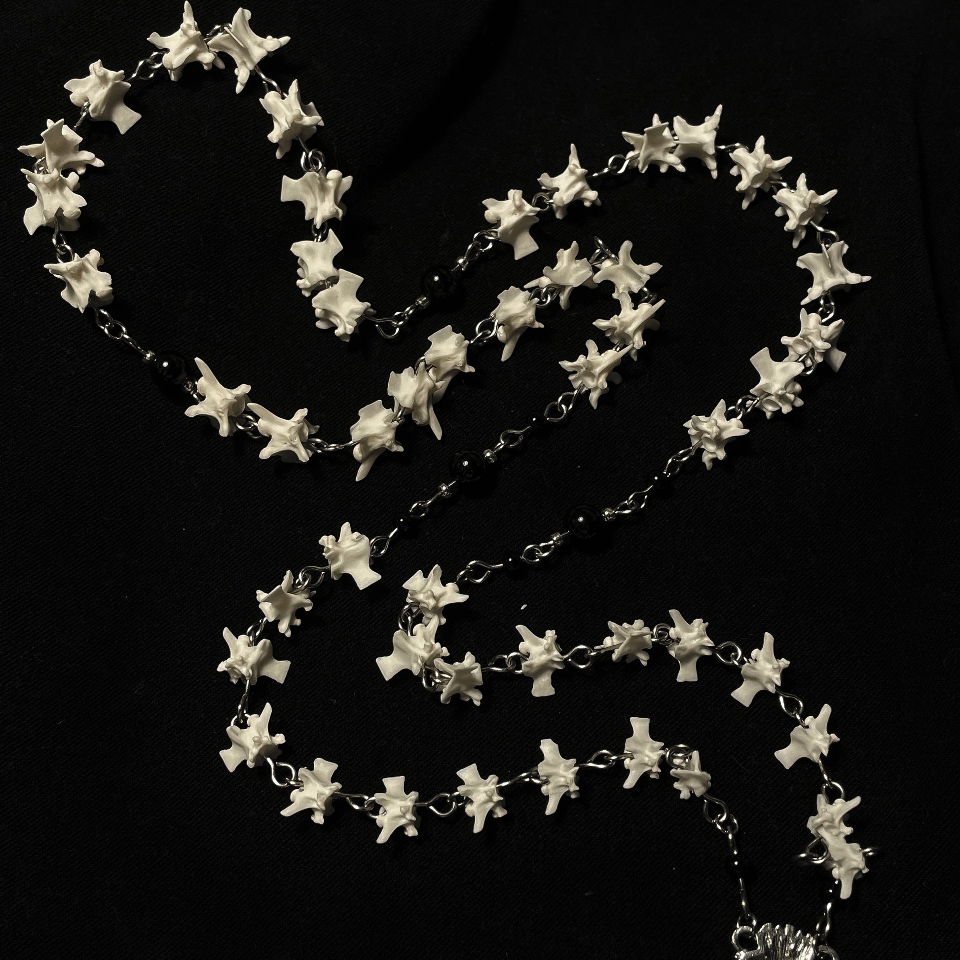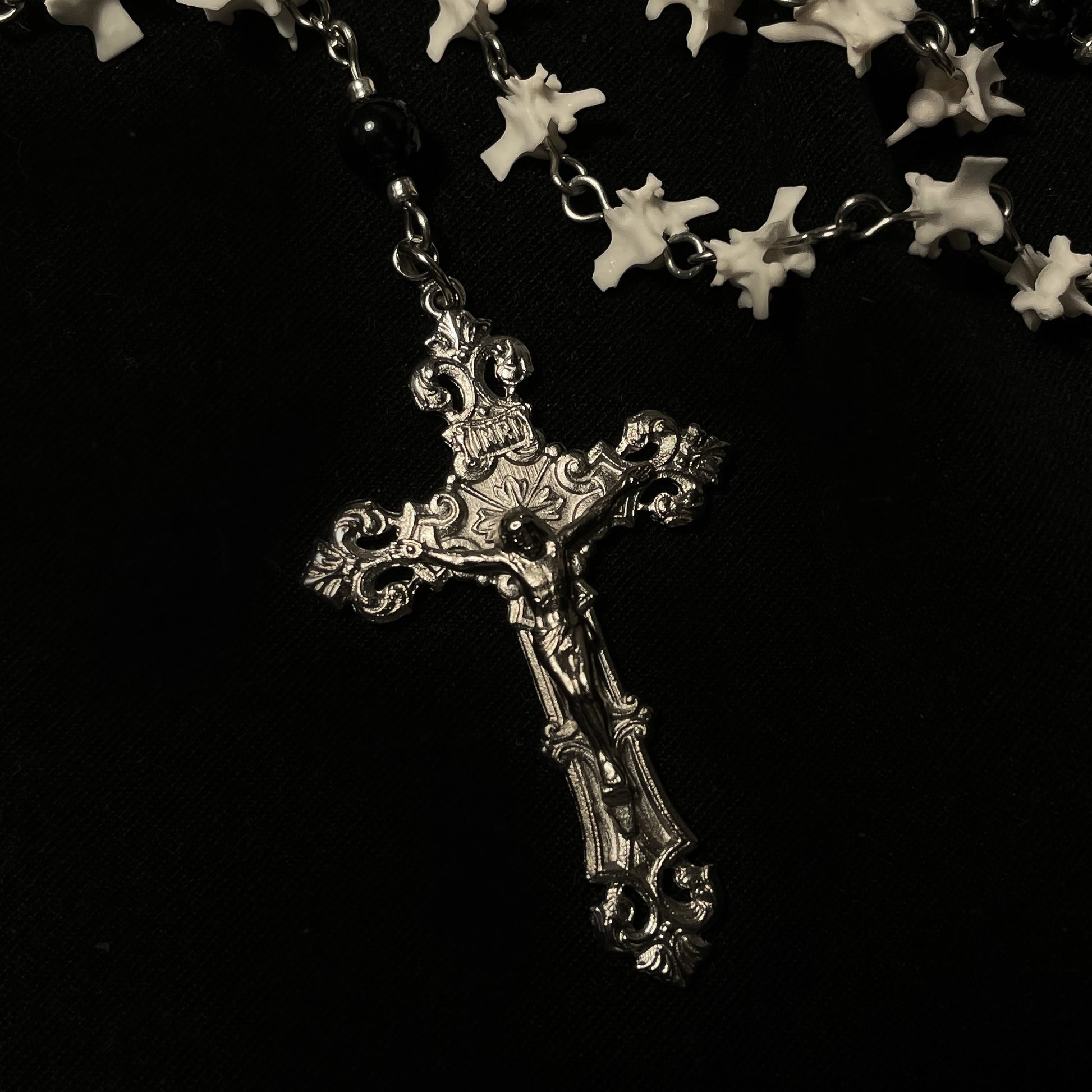 ✧ Rosary style necklace made of real rattlesnake vertebrae, black onyx separator beads, sacred heart centerpiece, and sterling silver fill vintage crucifix pendant on stainless steel wire.