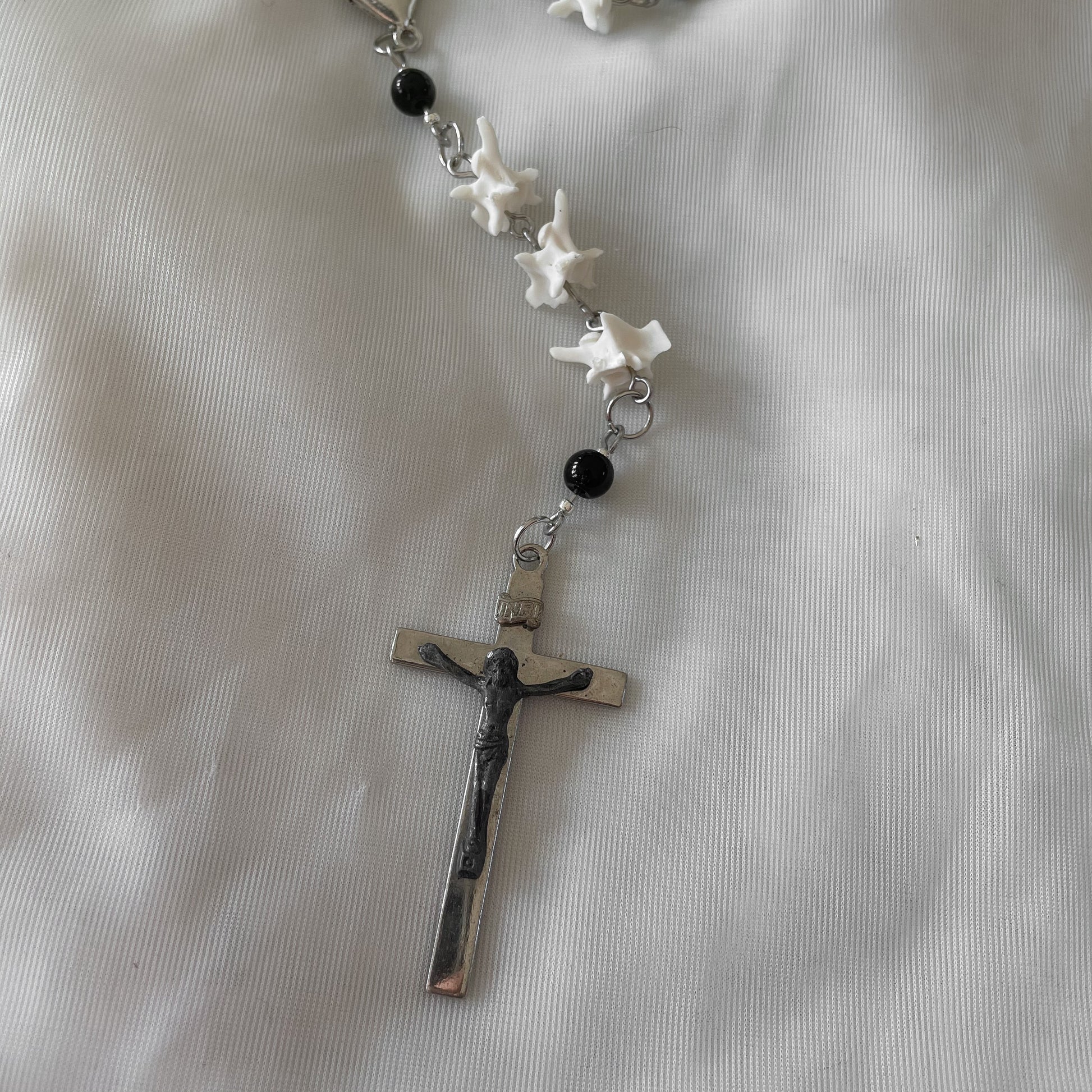 ✧ Each individual bone and bead is carefully wired by hand and connected to the whole. The necklace itself is about 32 inches around, and the bottom is an additional 6 inches that hangs down. Crucifix measures 2 inches