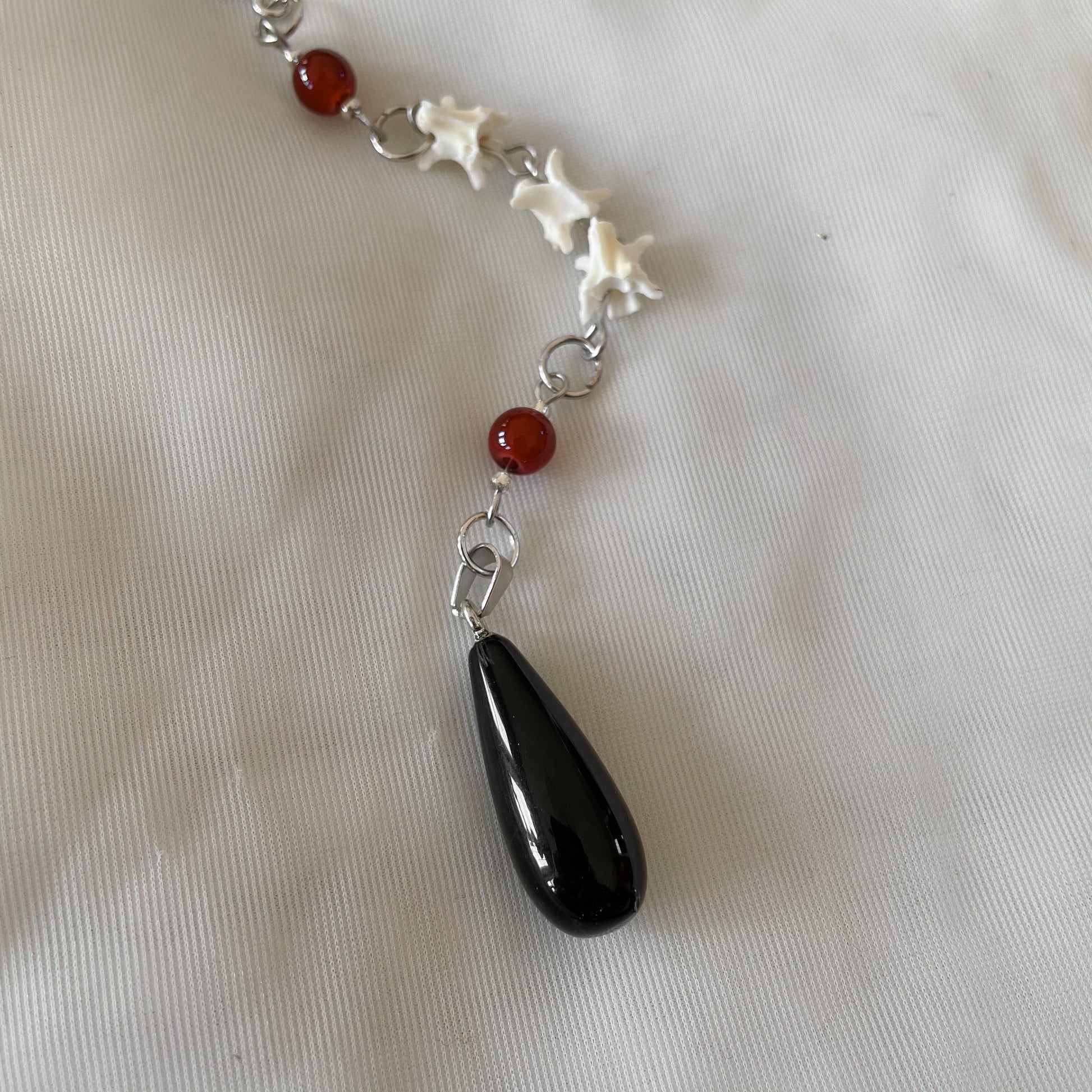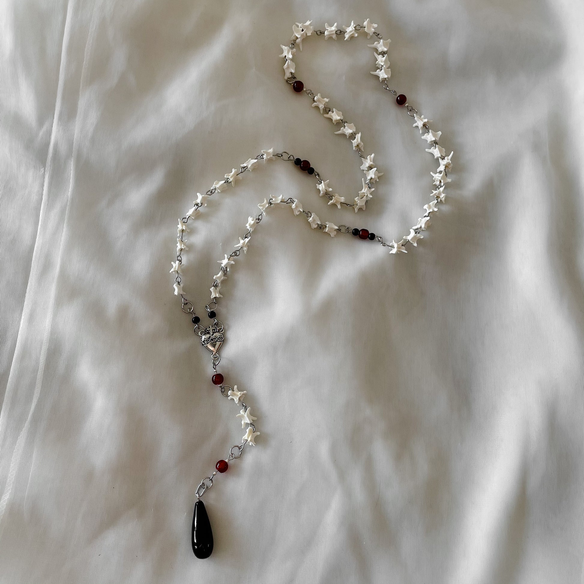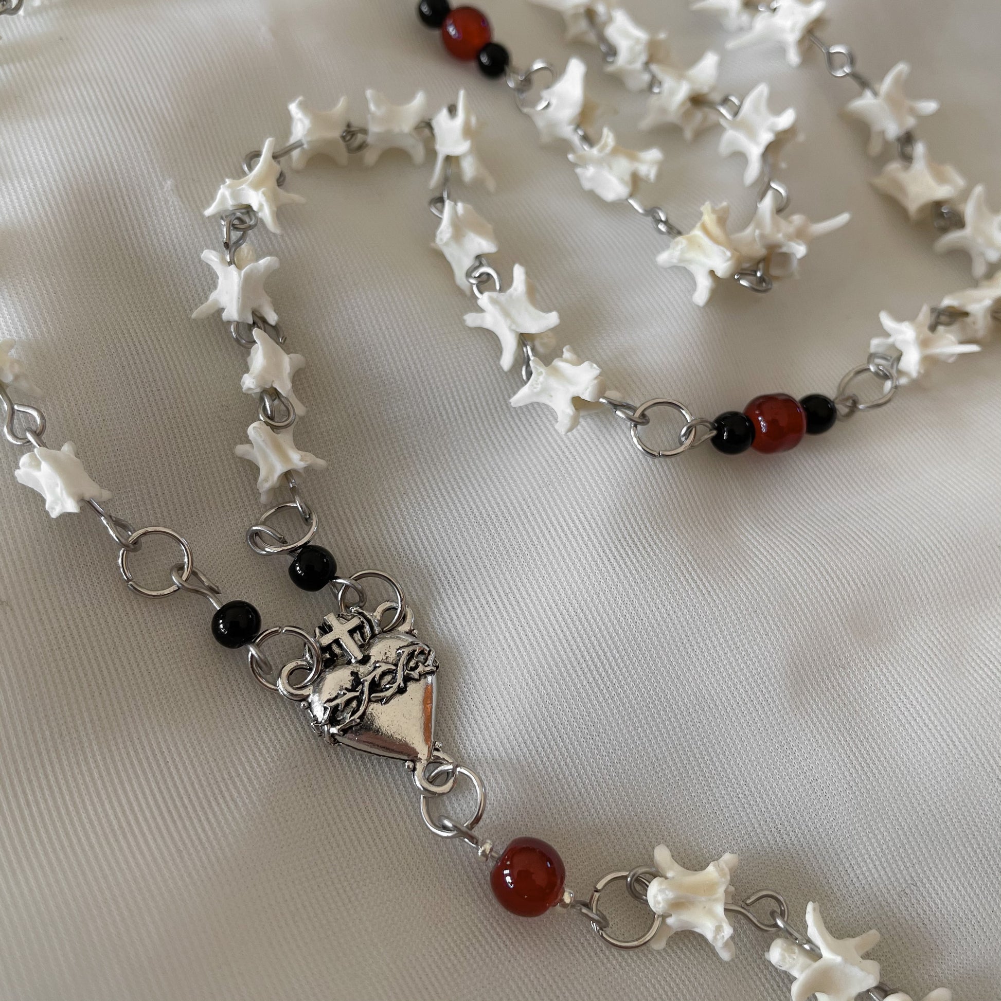 ✧ Rosary style necklace made of real rattlesnake vertebrae, red and black separator beads, sacred heart centerpiece, and a teardrop shaped black onyx crystal pendant