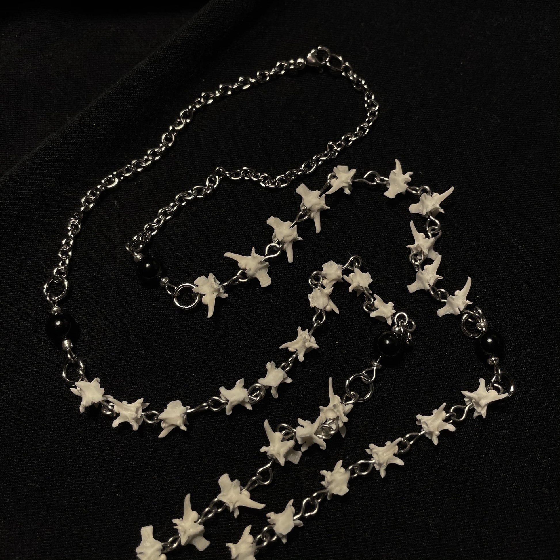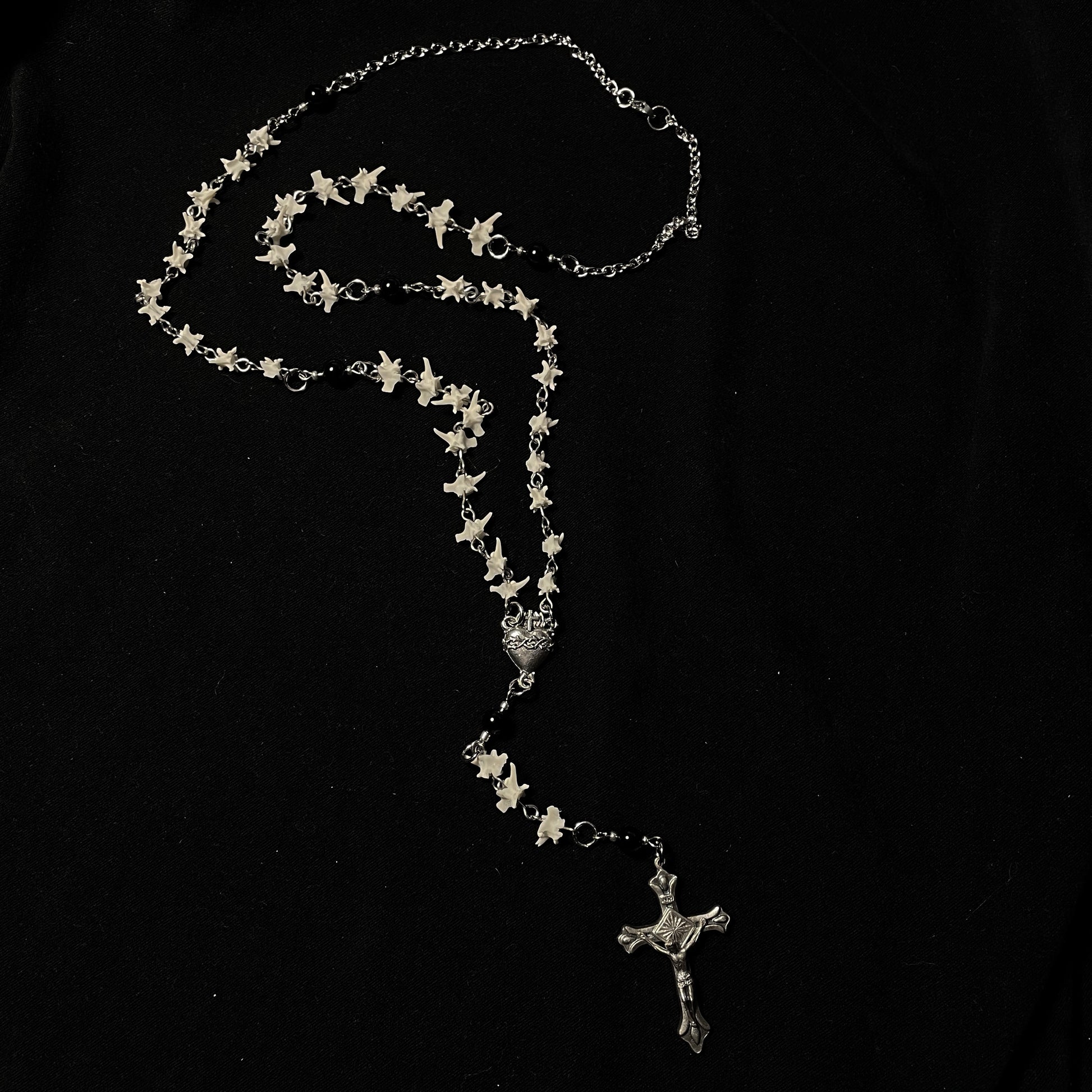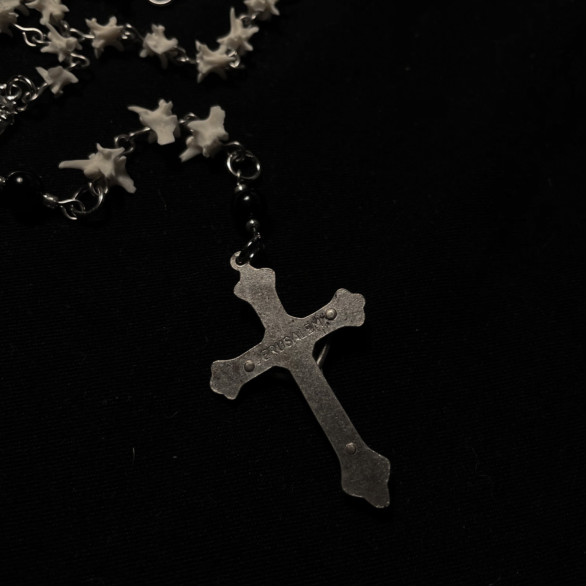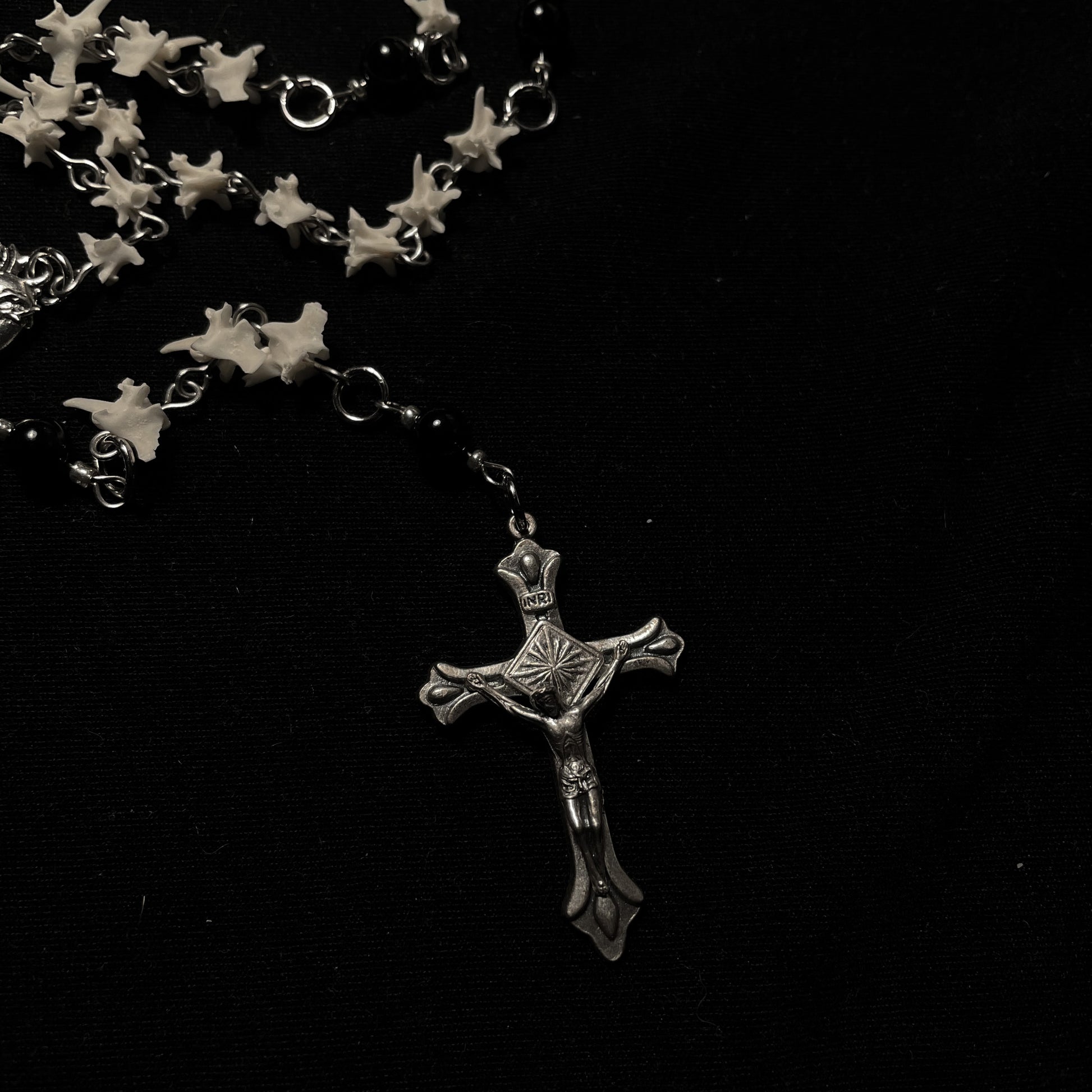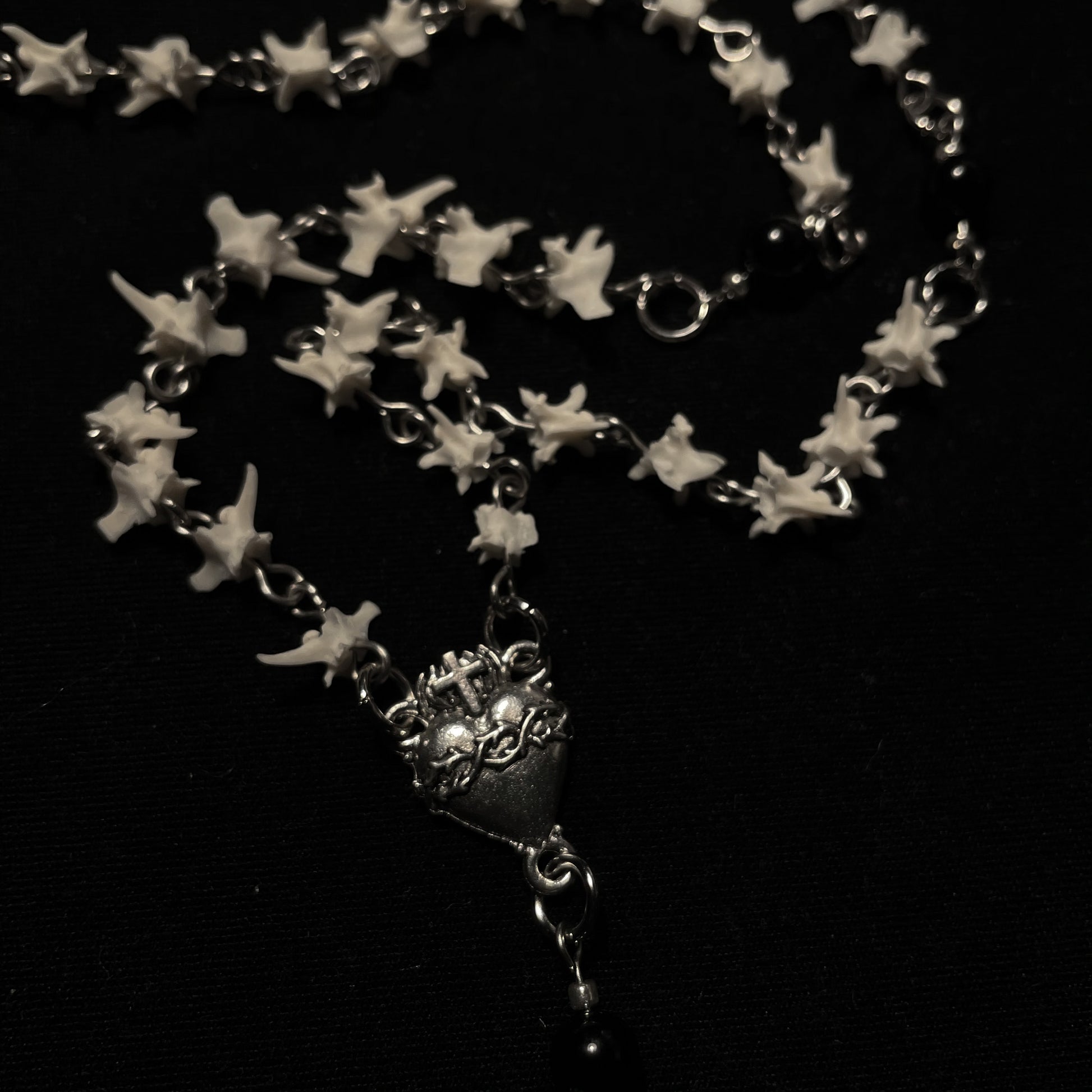 ✧ Bone rosary style necklace featuring real rattlesnake vertebrae bones, black onyx beads, sacred heart centerpiece, and cross pendant stamped “jerusalem”