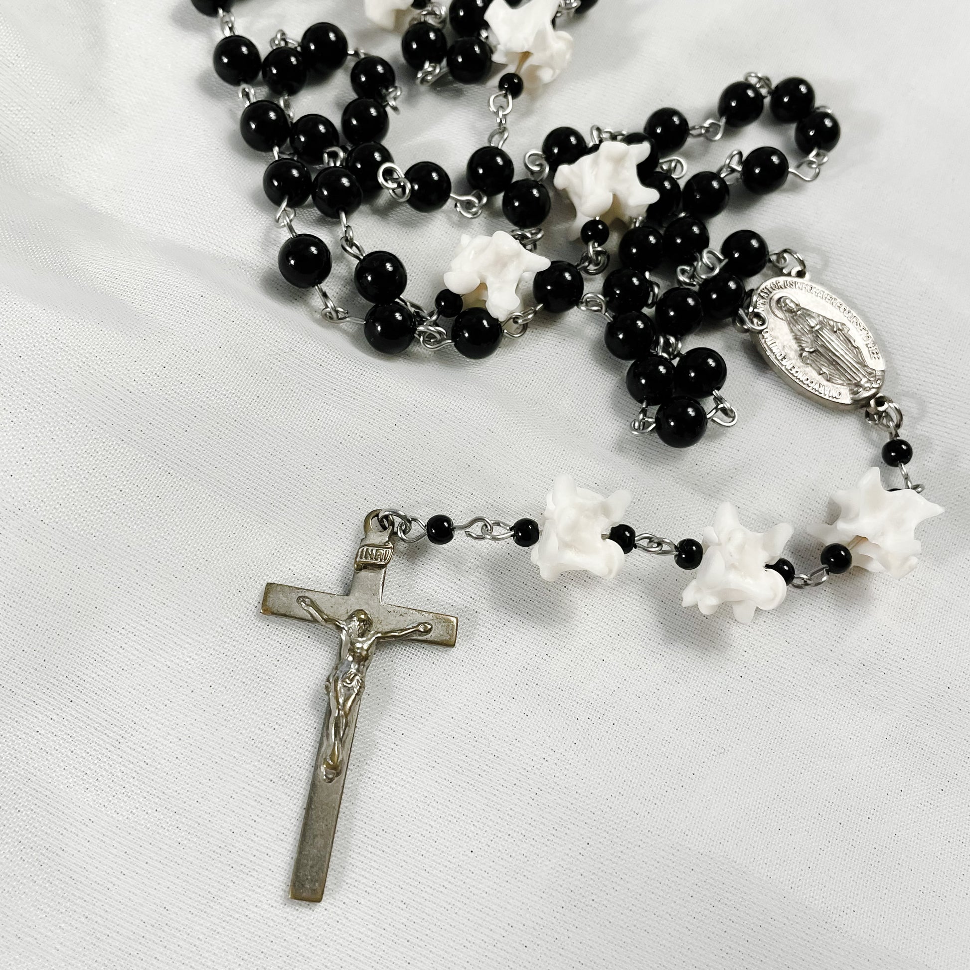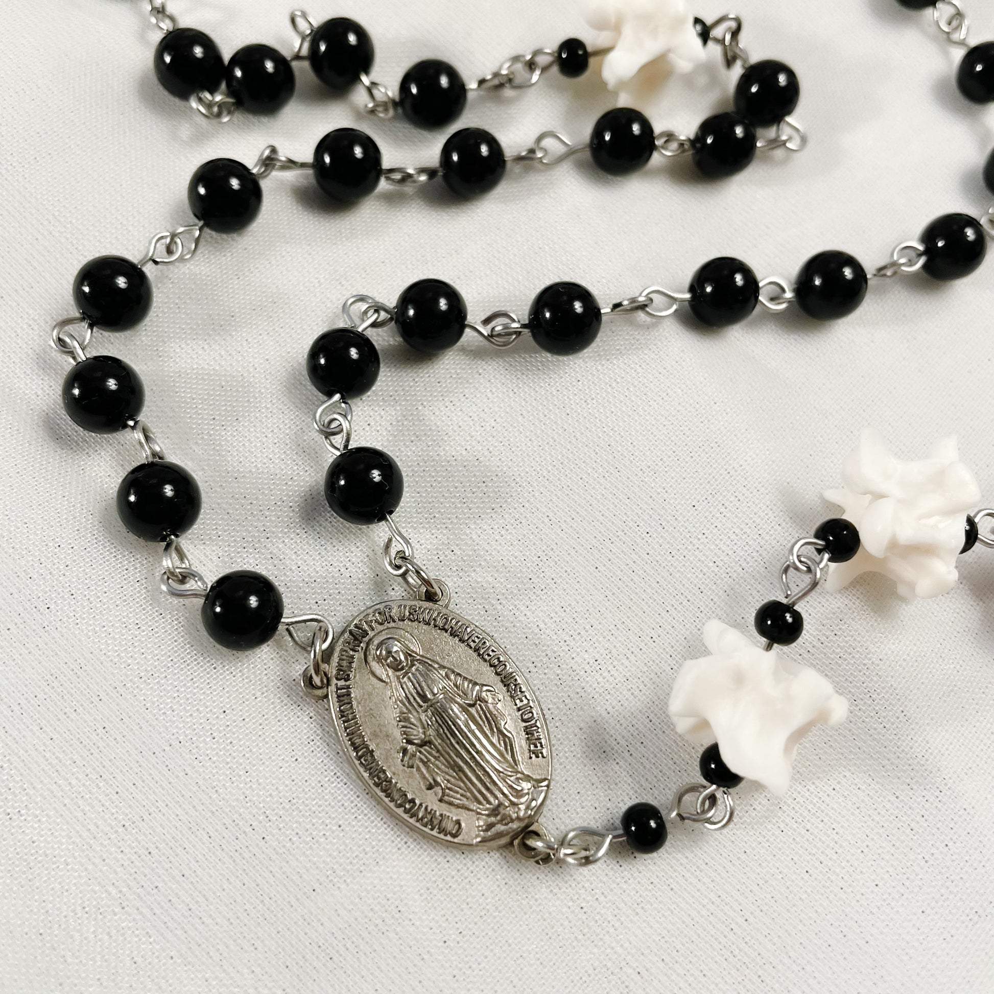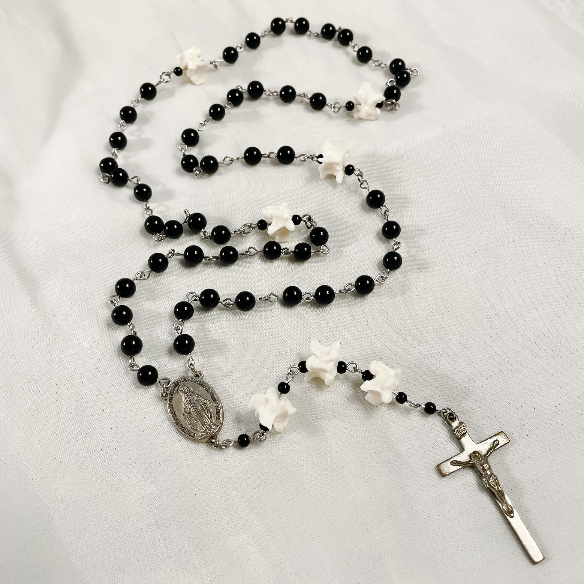 ✧ Rosary made of black onyx stone beads, real snake vertebrae bones, and vintage centerpiece and cross.