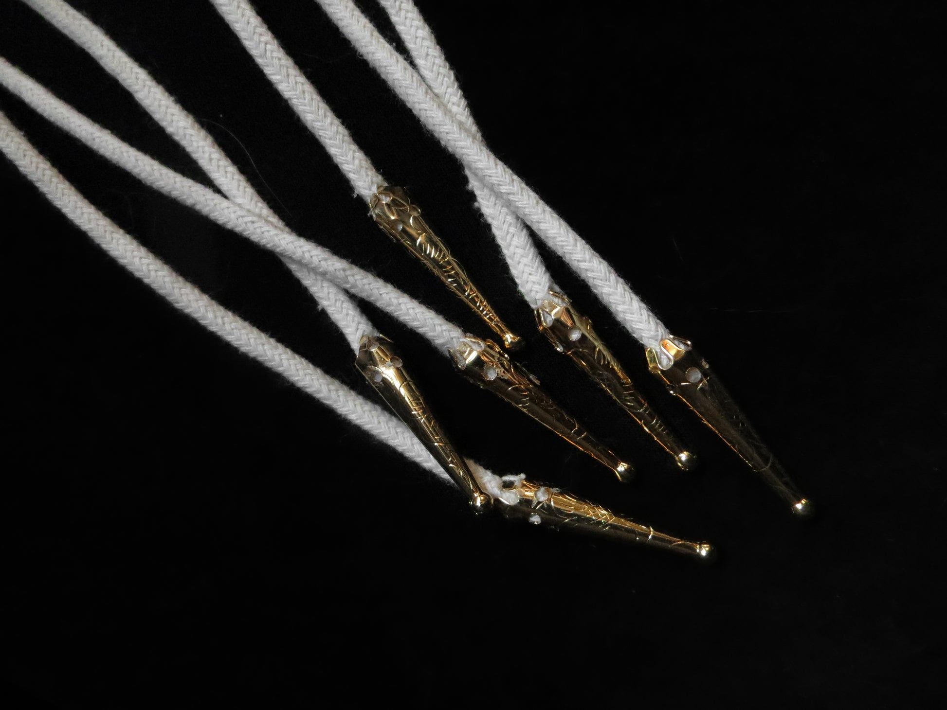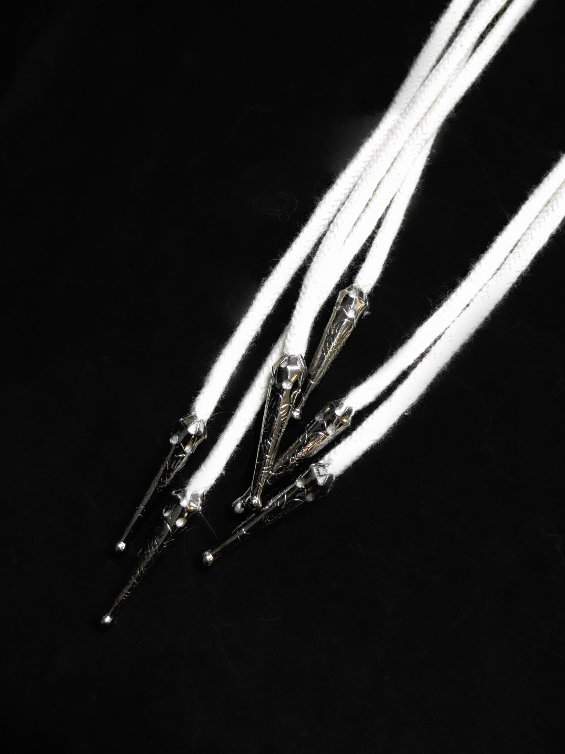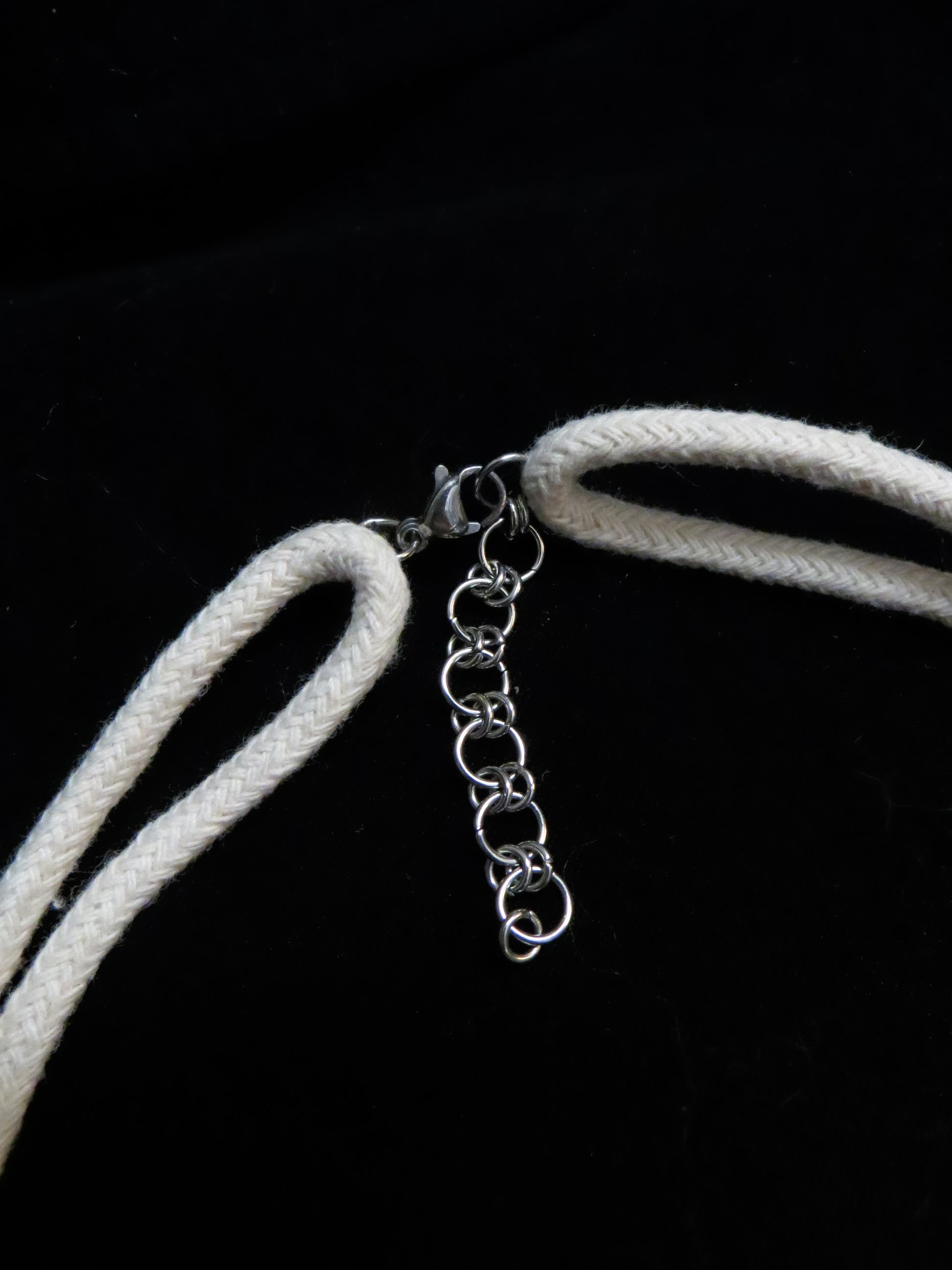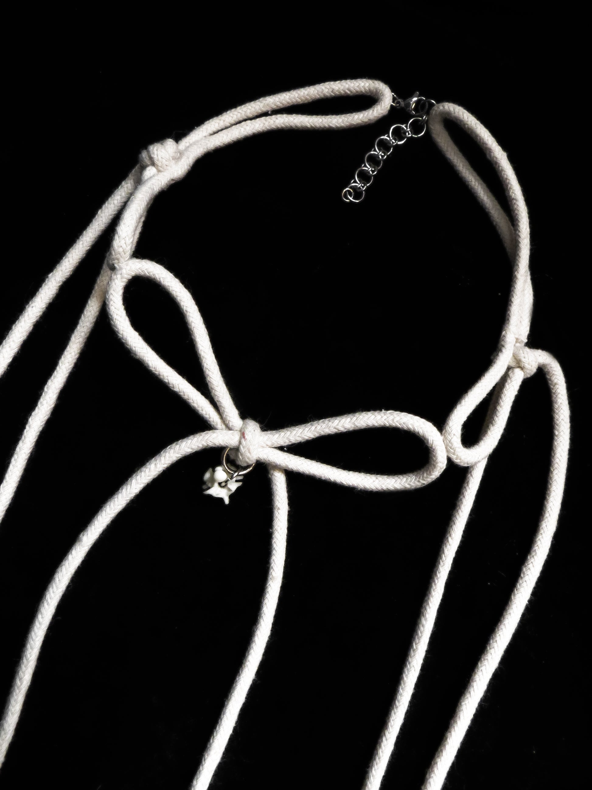 ⟡ A linen cord necklace comprised of three connected bows with bolo tie tips on the ends, and real snake bone hanging from the center bow.