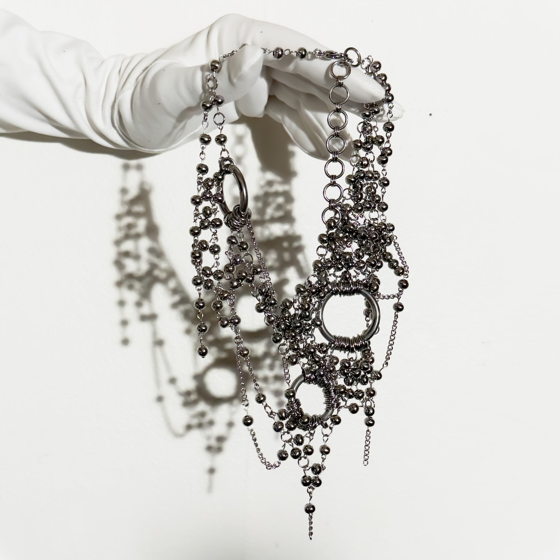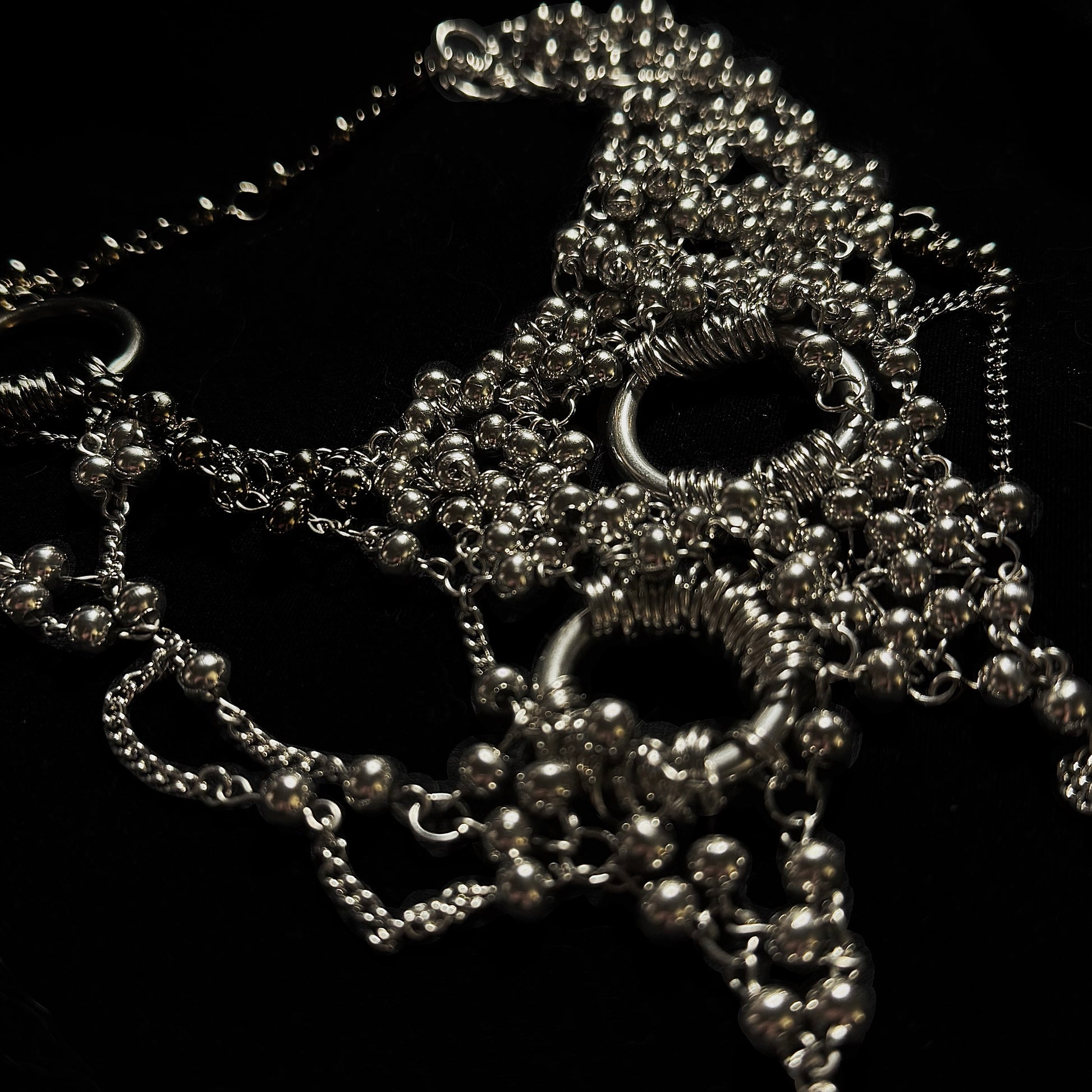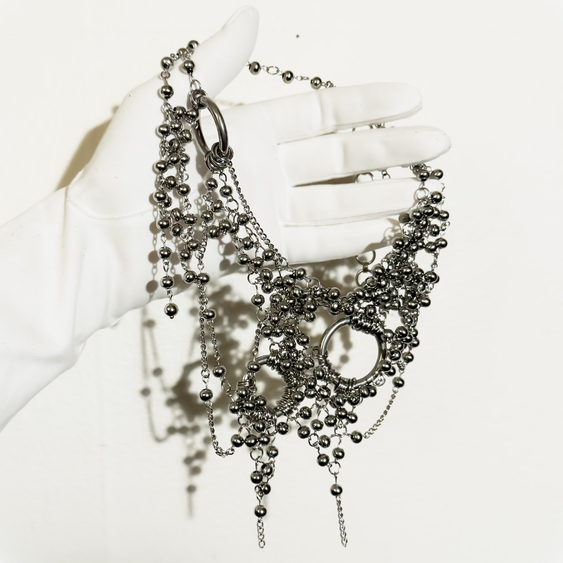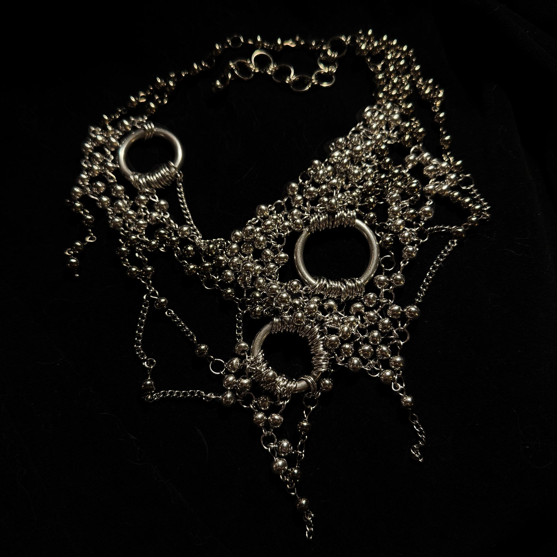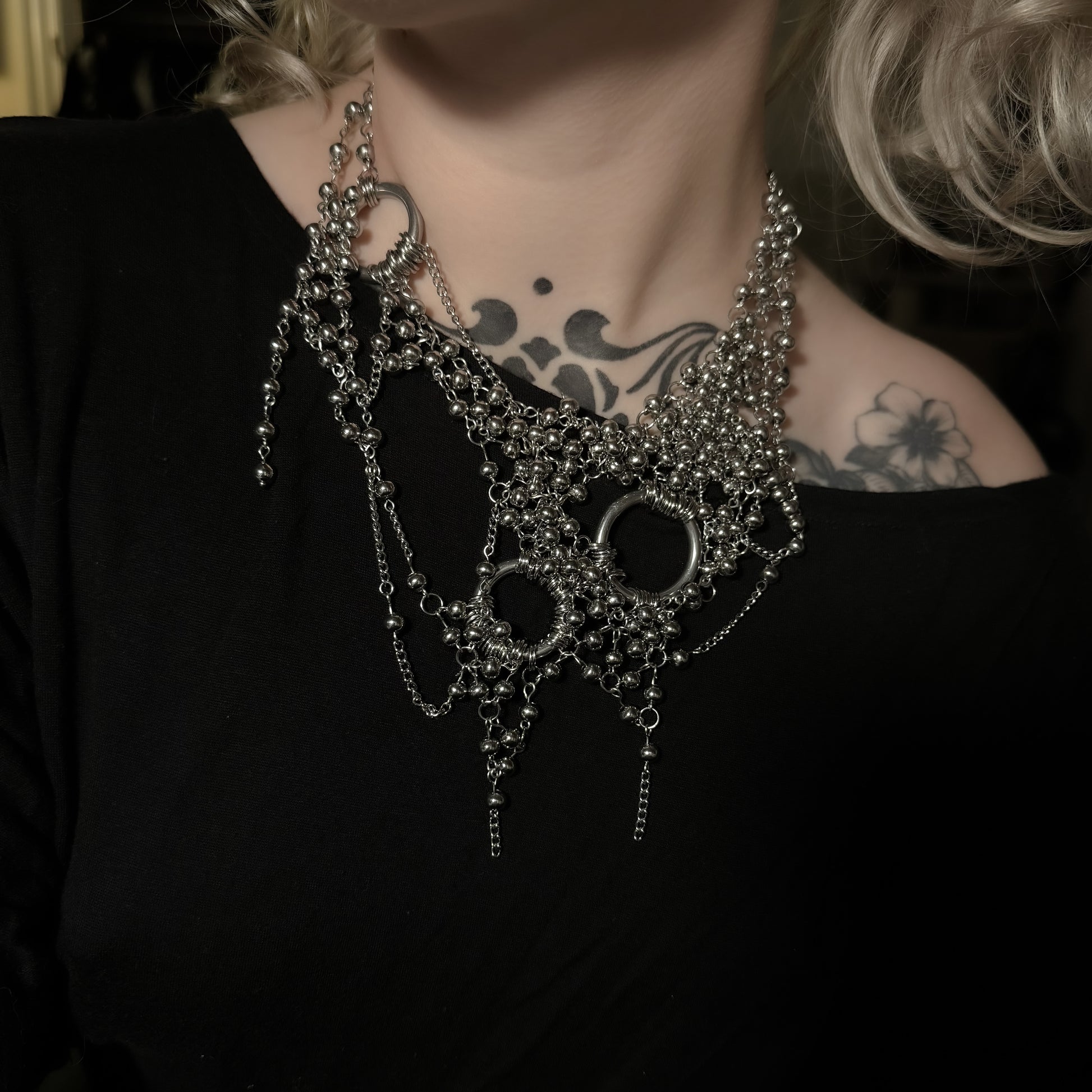 One of a kind 100% stainless steel necklace. Inspired by connective tissue and organic decay, and the first piece in the Viscera line. Created with meticulously interwoven stainless beads, chains and rings to make an abstract, free flowing form of clusters.